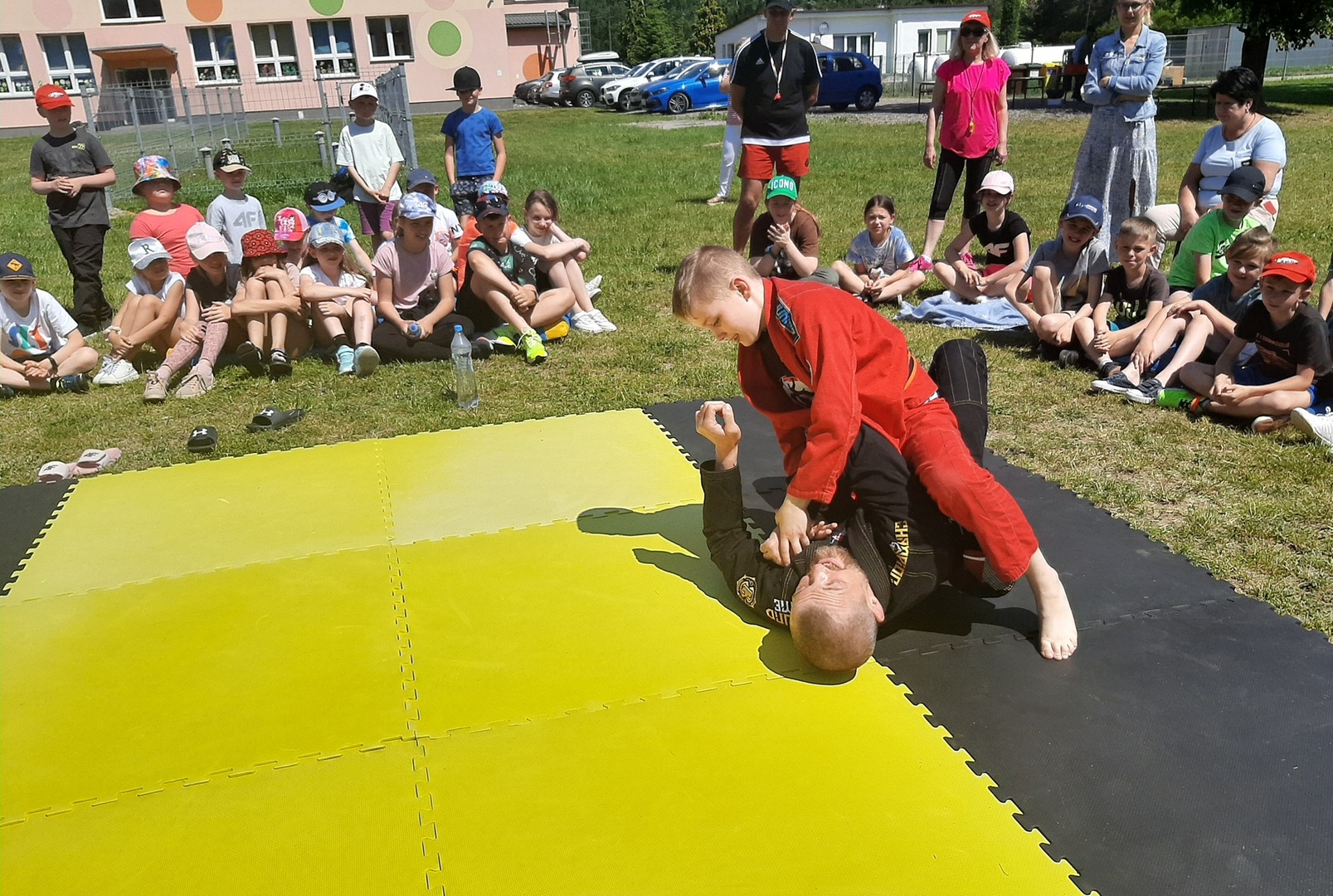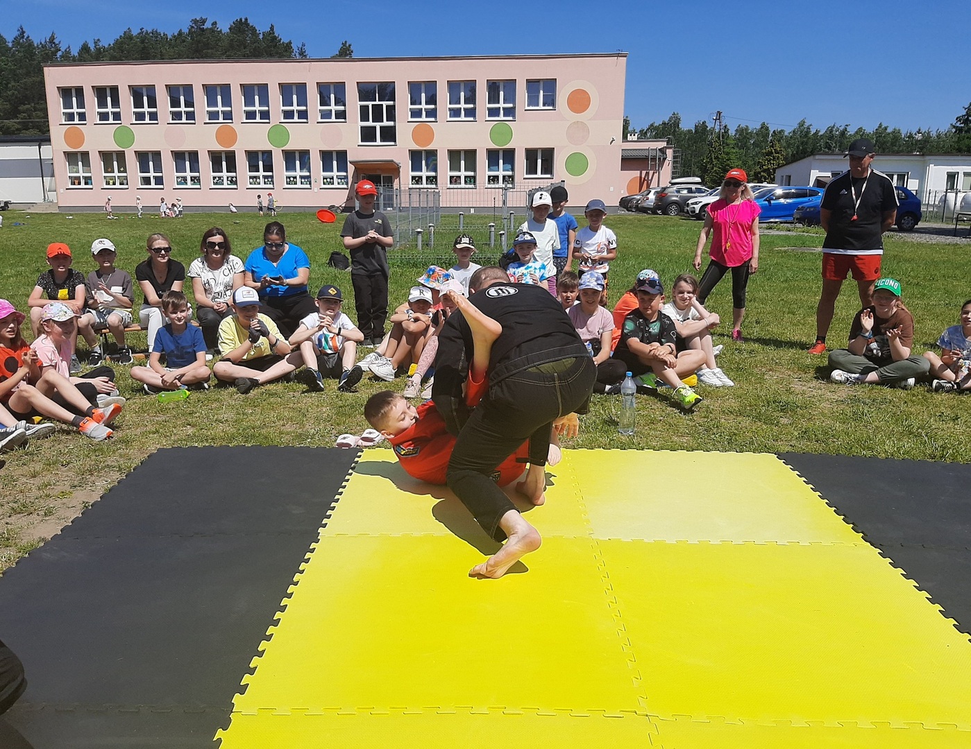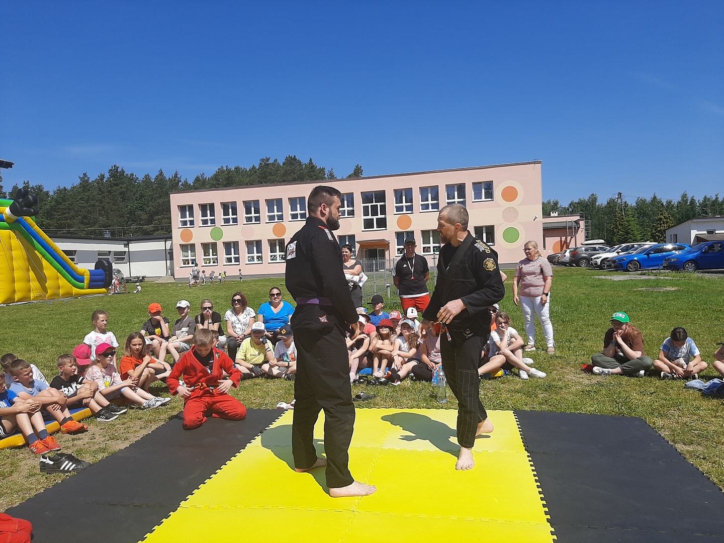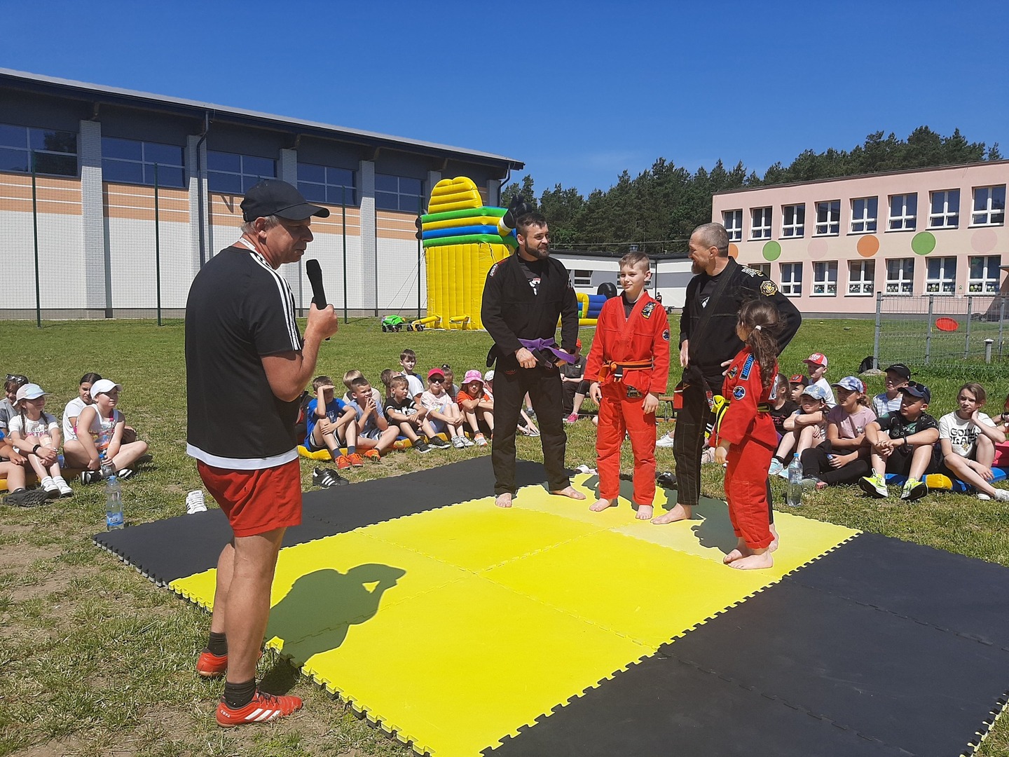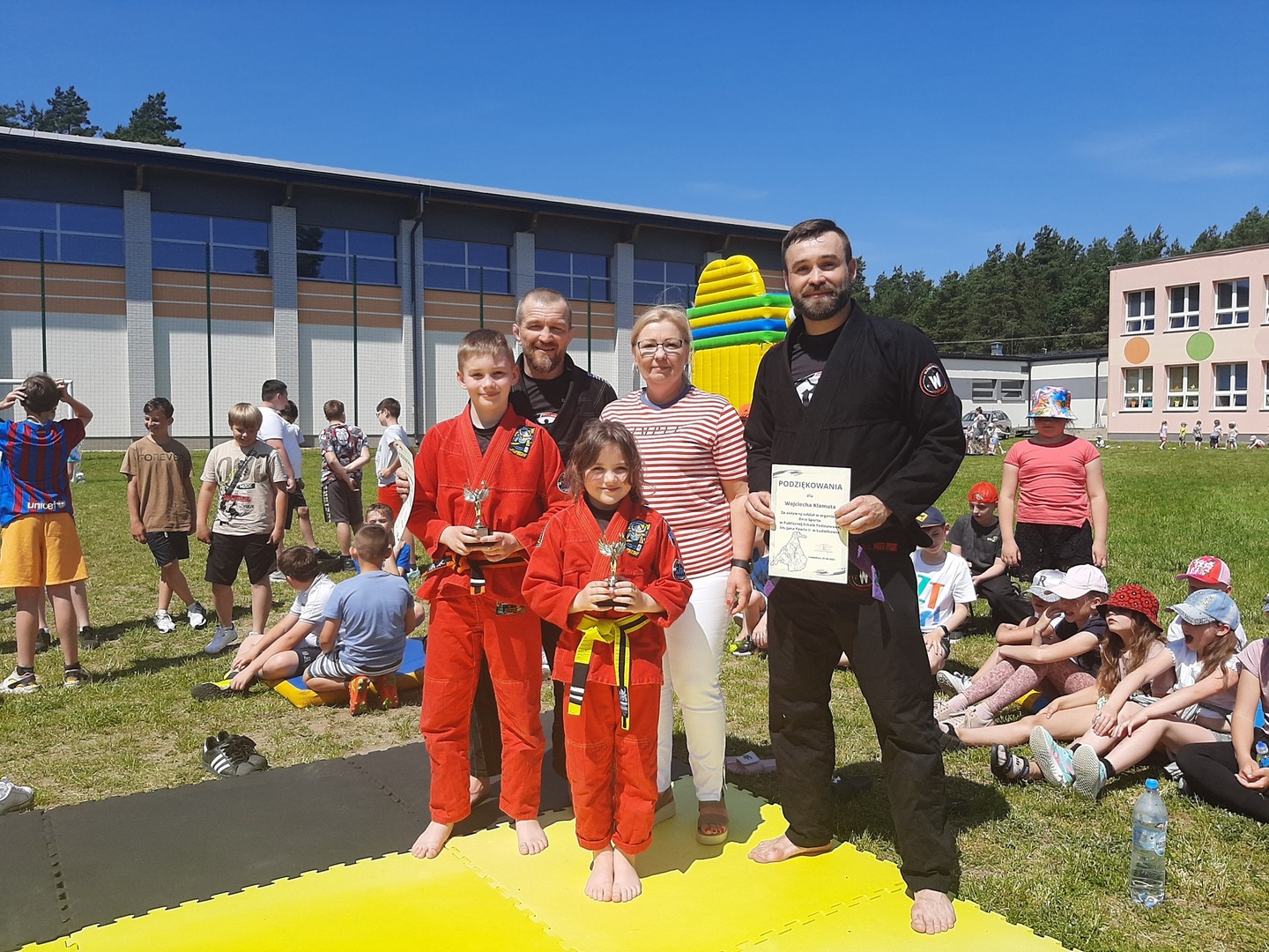 Iga Klamut z klasy I i Wiktor Klamut z klasy IV - trenują brazylijskie jiu - jitsu pod okiem trenerów: Łukasza Bilskiego i Wojciecha Klamuta - taty Igi i Wiktora. Uczniowie naszej szkoły mieli możliwość wzięcia udziału w krótkiej rozgrzewce z trenerami i zawodnikami, obejrzenia pokazu walki, mogli zadawać pytania dotyczące tego niezwykłego sportu.