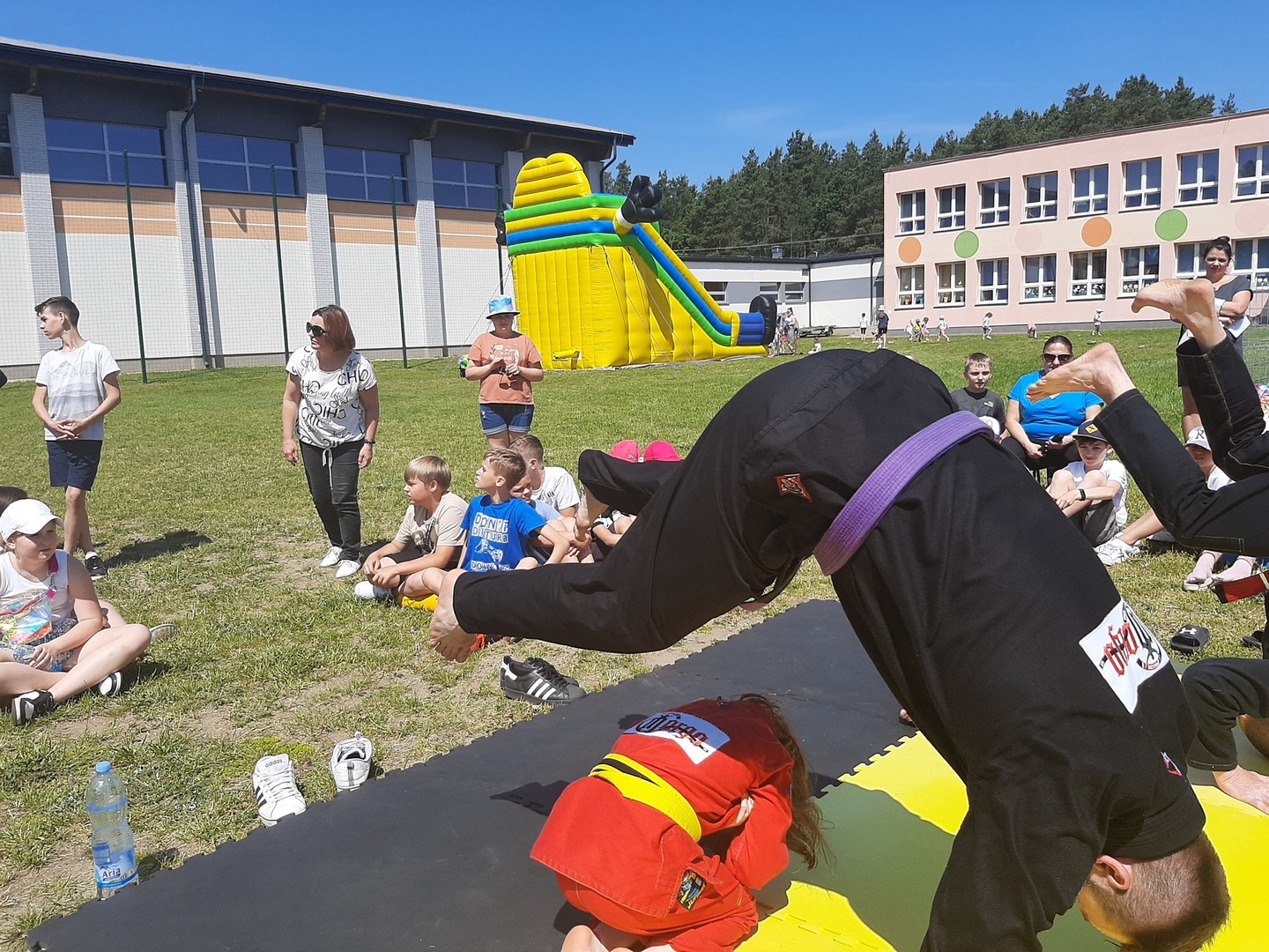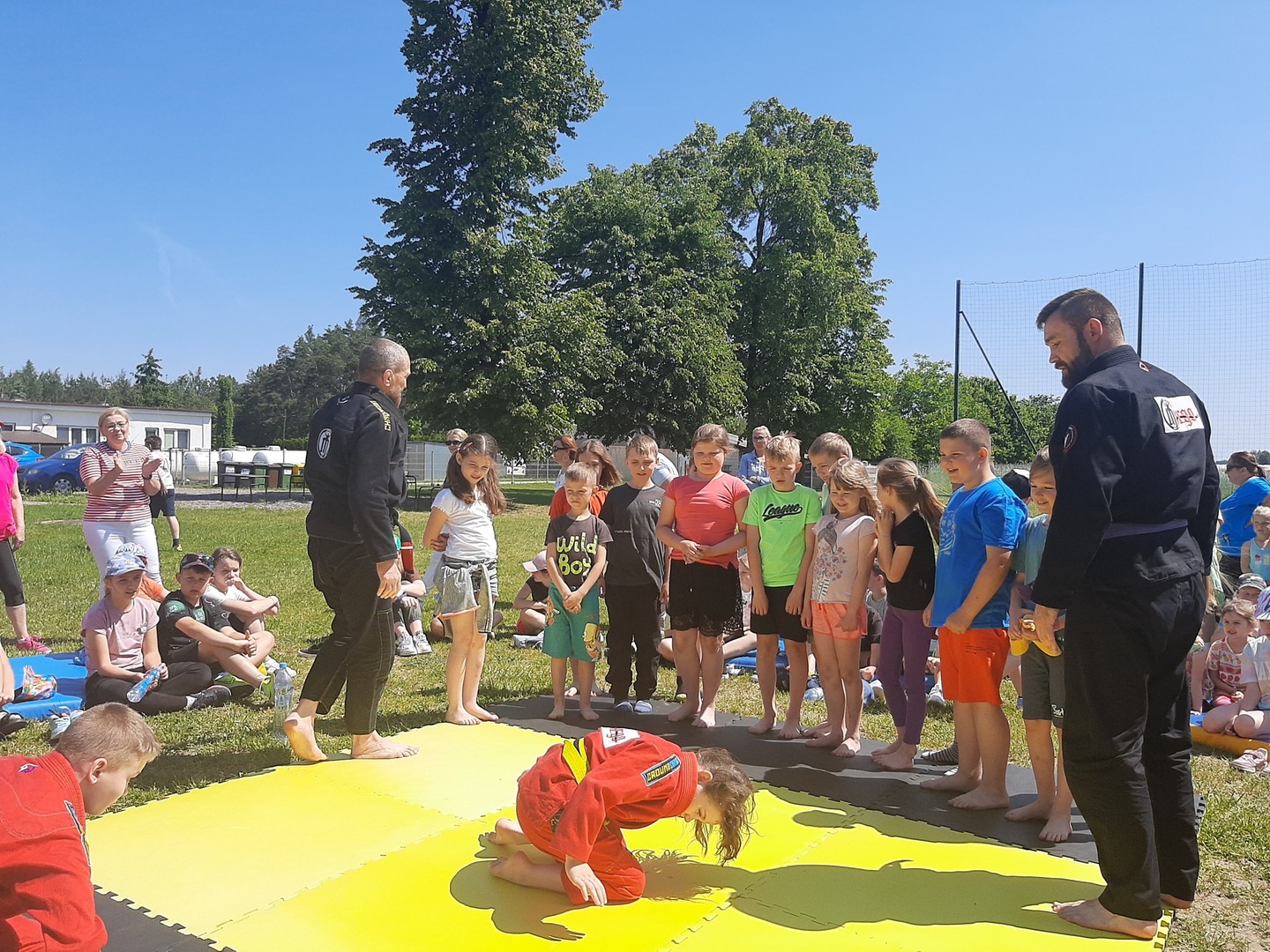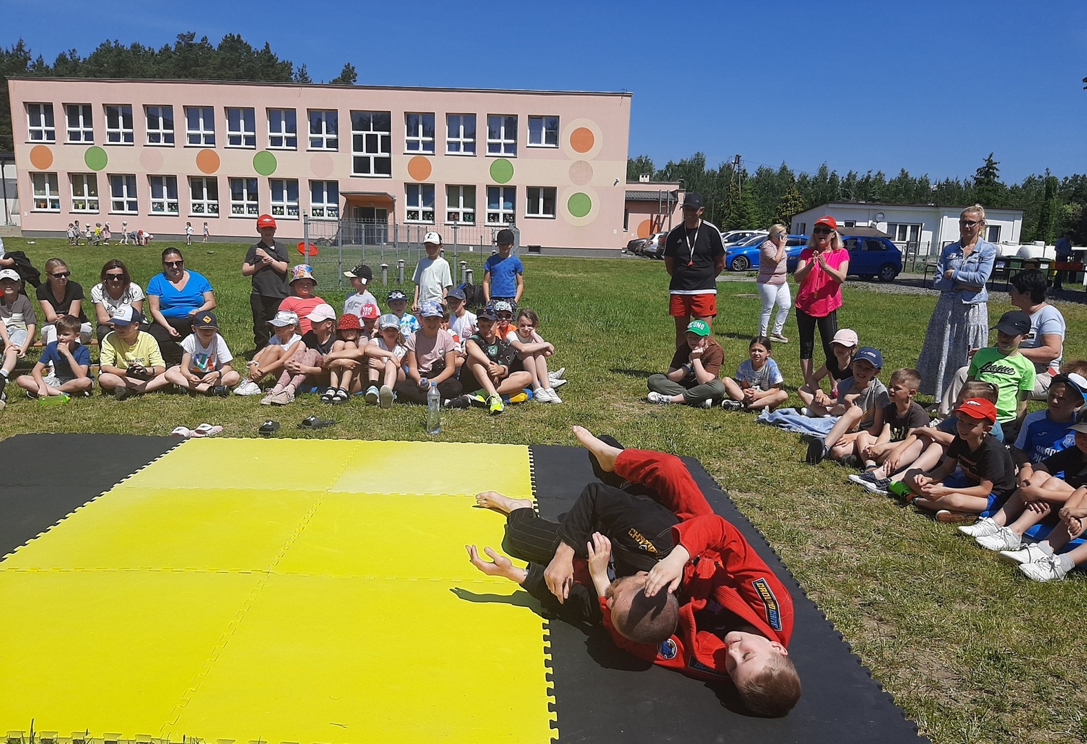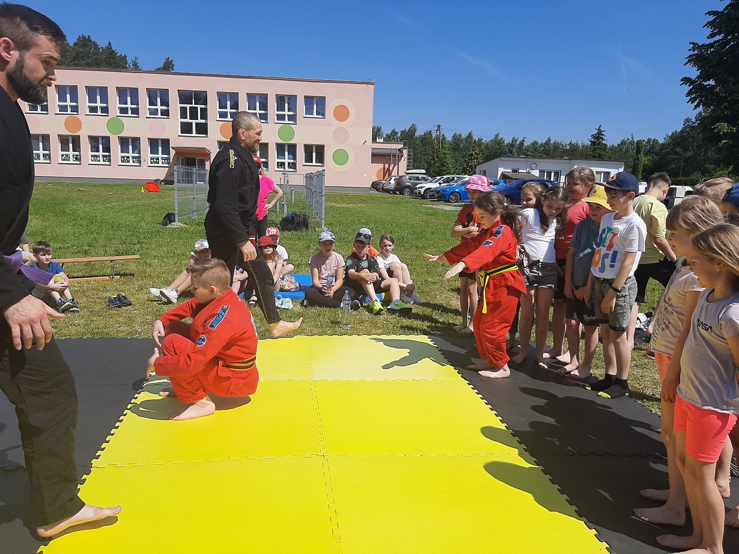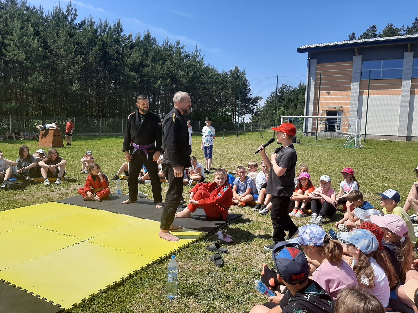 Iga Klamut z klasy I i Wiktor Klamut z klasy IV - trenują brazylijskie jiu - jitsu pod okiem trenerów: Łukasza Bilskiego i Wojciecha Klamuta - taty Igi i Wiktora. Uczniowie naszej szkoły mieli możliwość wzięcia udziału w krótkiej rozgrzewce z trenerami i zawodnikami, obejrzenia pokazu walki, mogli zadawać pytania dotyczące tego niezwykłego sportu.