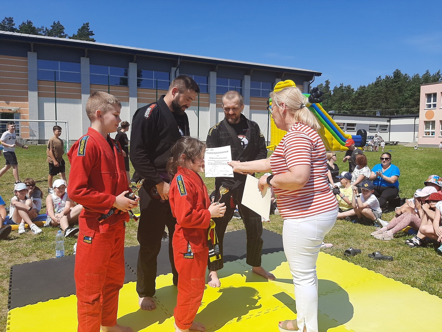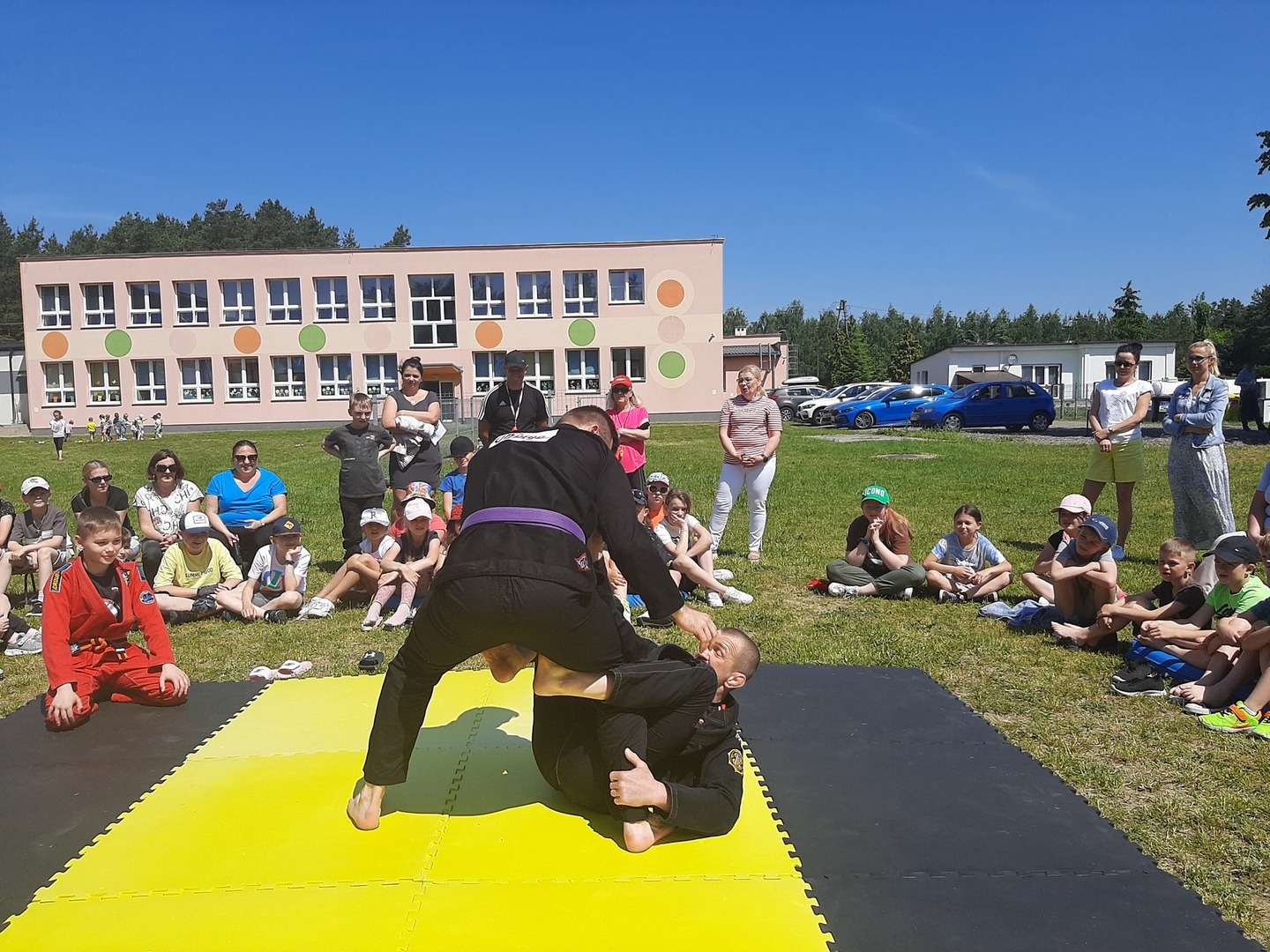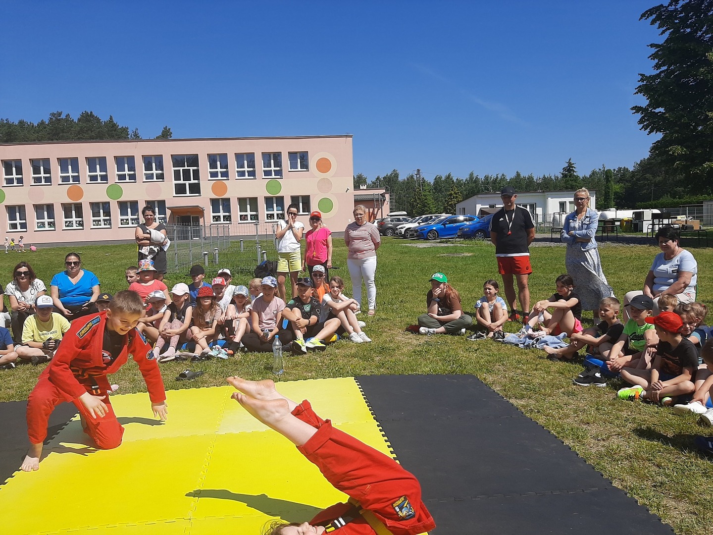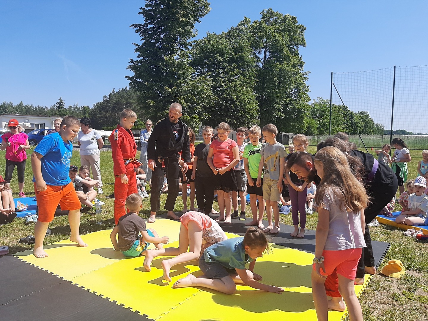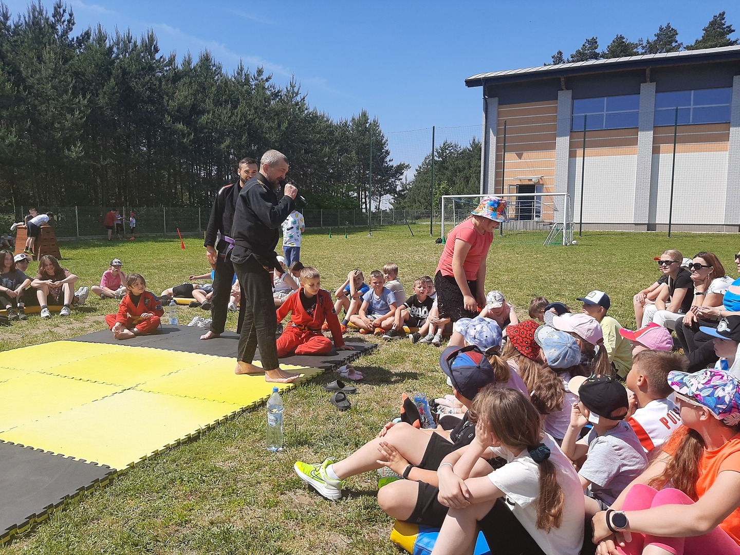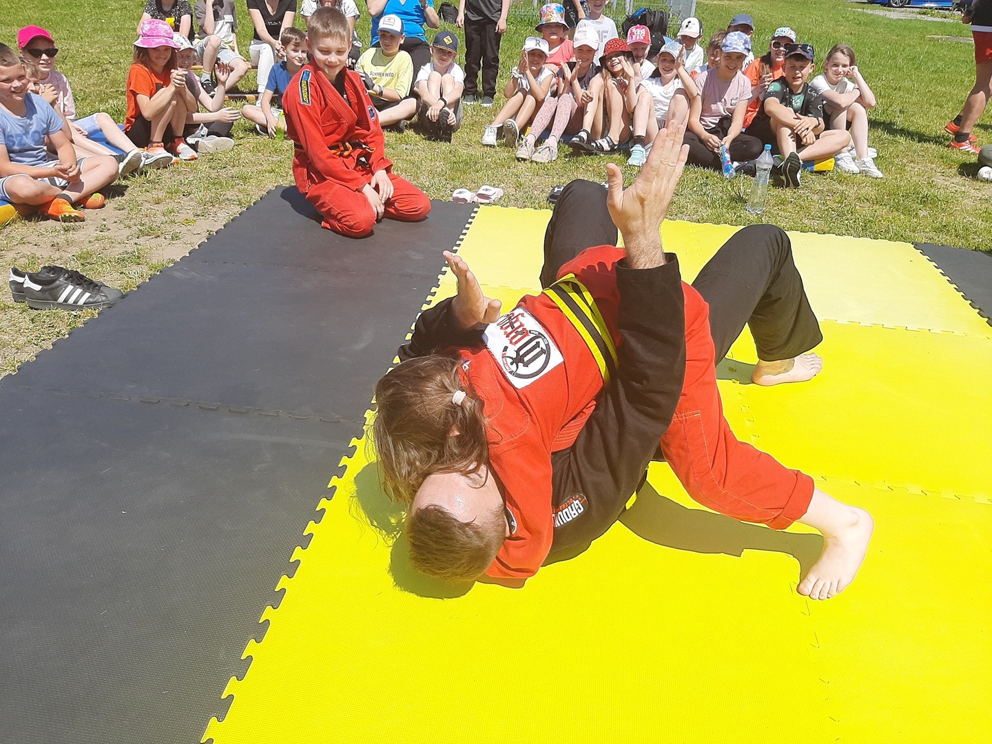 Iga Klamut z klasy I i Wiktor Klamut z klasy IV - trenują brazylijskie jiu - jitsu pod okiem trenerów: Łukasza Bilskiego i Wojciecha Klamuta - taty Igi i Wiktora. Uczniowie naszej szkoły mieli możliwość wzięcia udziału w krótkiej rozgrzewce z trenerami i zawodnikami, obejrzenia pokazu walki, mogli zadawać pytania dotyczące tego niezwykłego sportu.