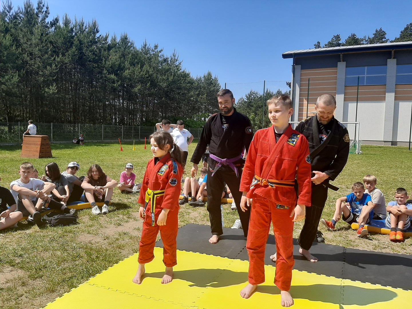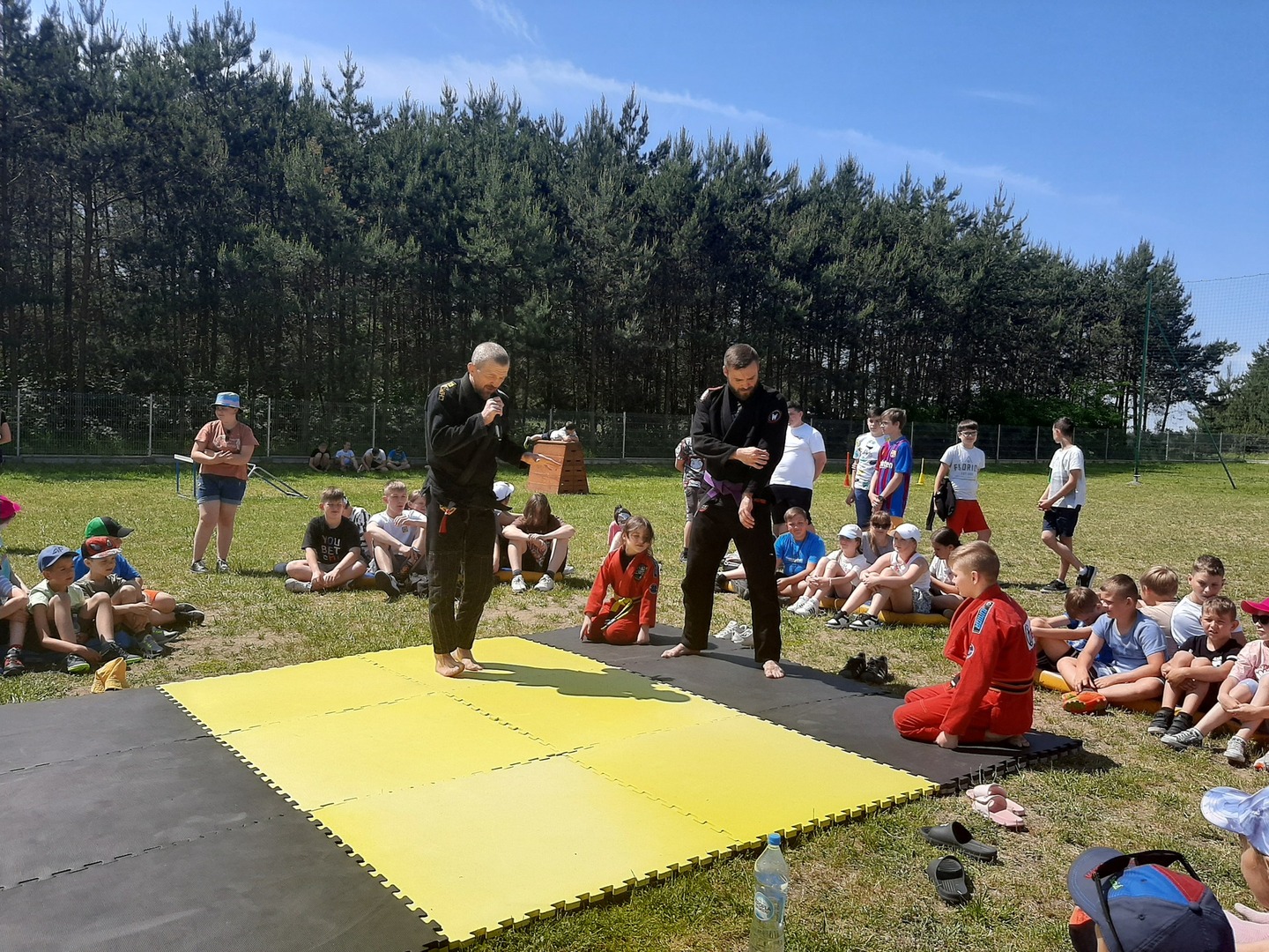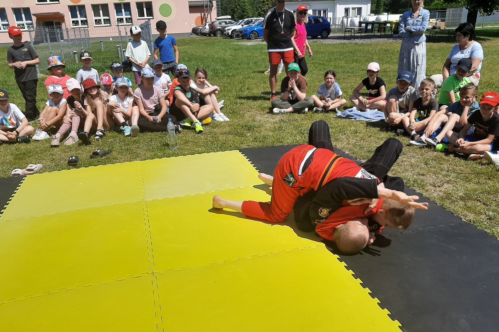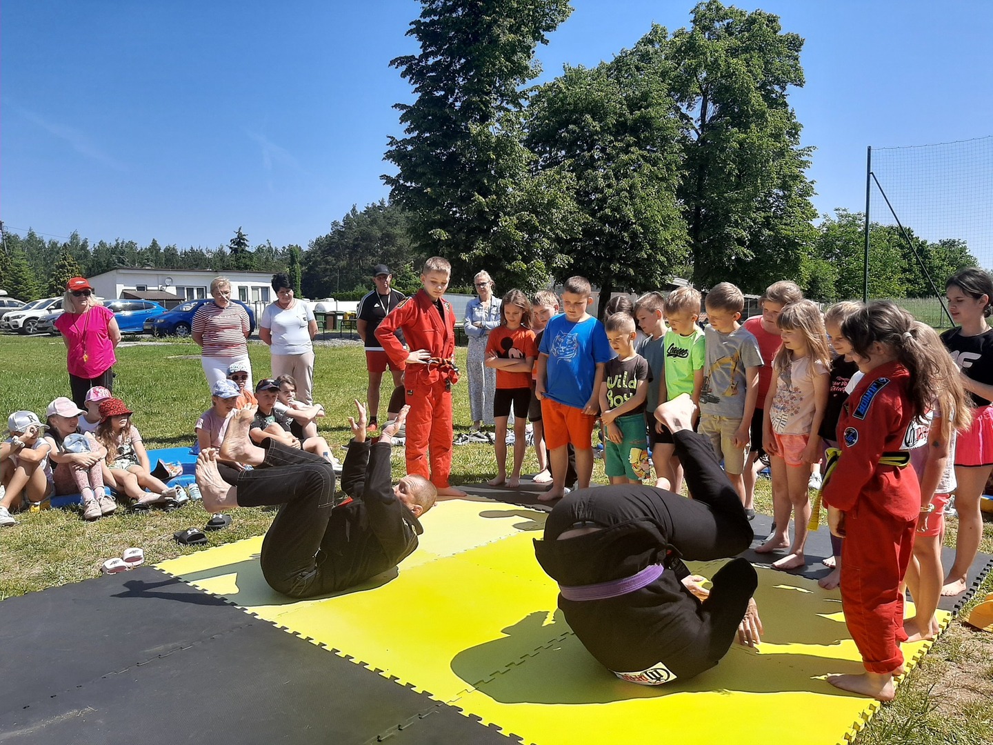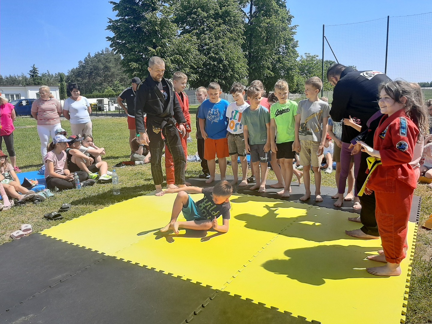 Iga Klamut z klasy I i Wiktor Klamut z klasy IV - trenują brazylijskie jiu - jitsu pod okiem trenerów: Łukasza Bilskiego i Wojciecha Klamuta - taty Igi i Wiktora. Uczniowie naszej szkoły mieli możliwość wzięcia udziału w krótkiej rozgrzewce z trenerami i zawodnikami, obejrzenia pokazu walki, mogli zadawać pytania dotyczące tego niezwykłego sportu.