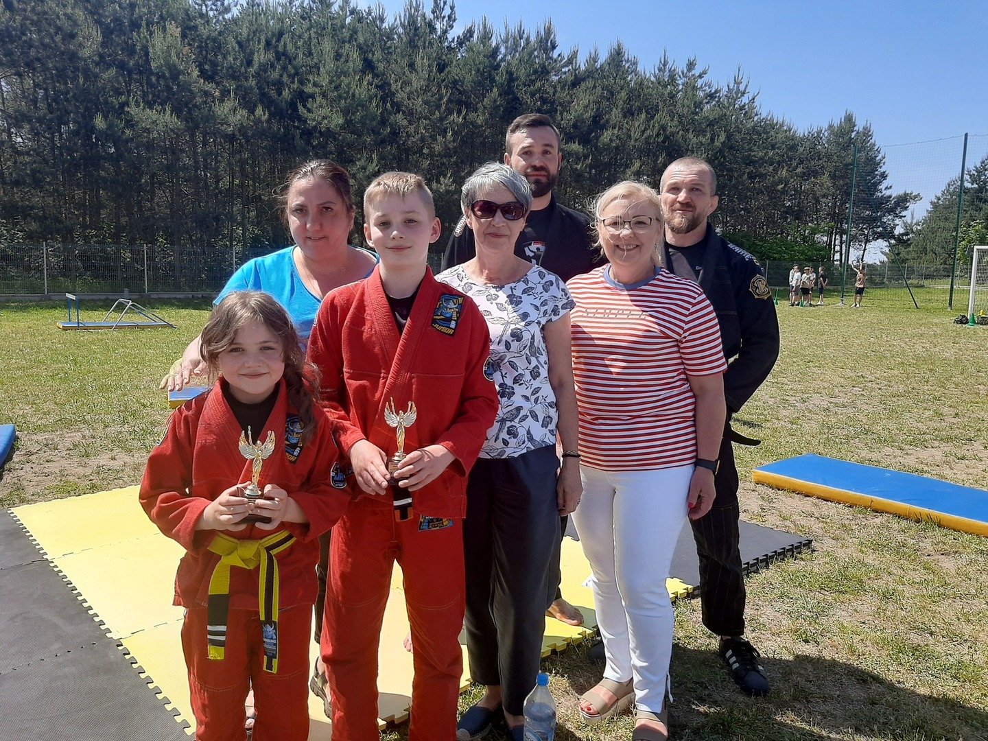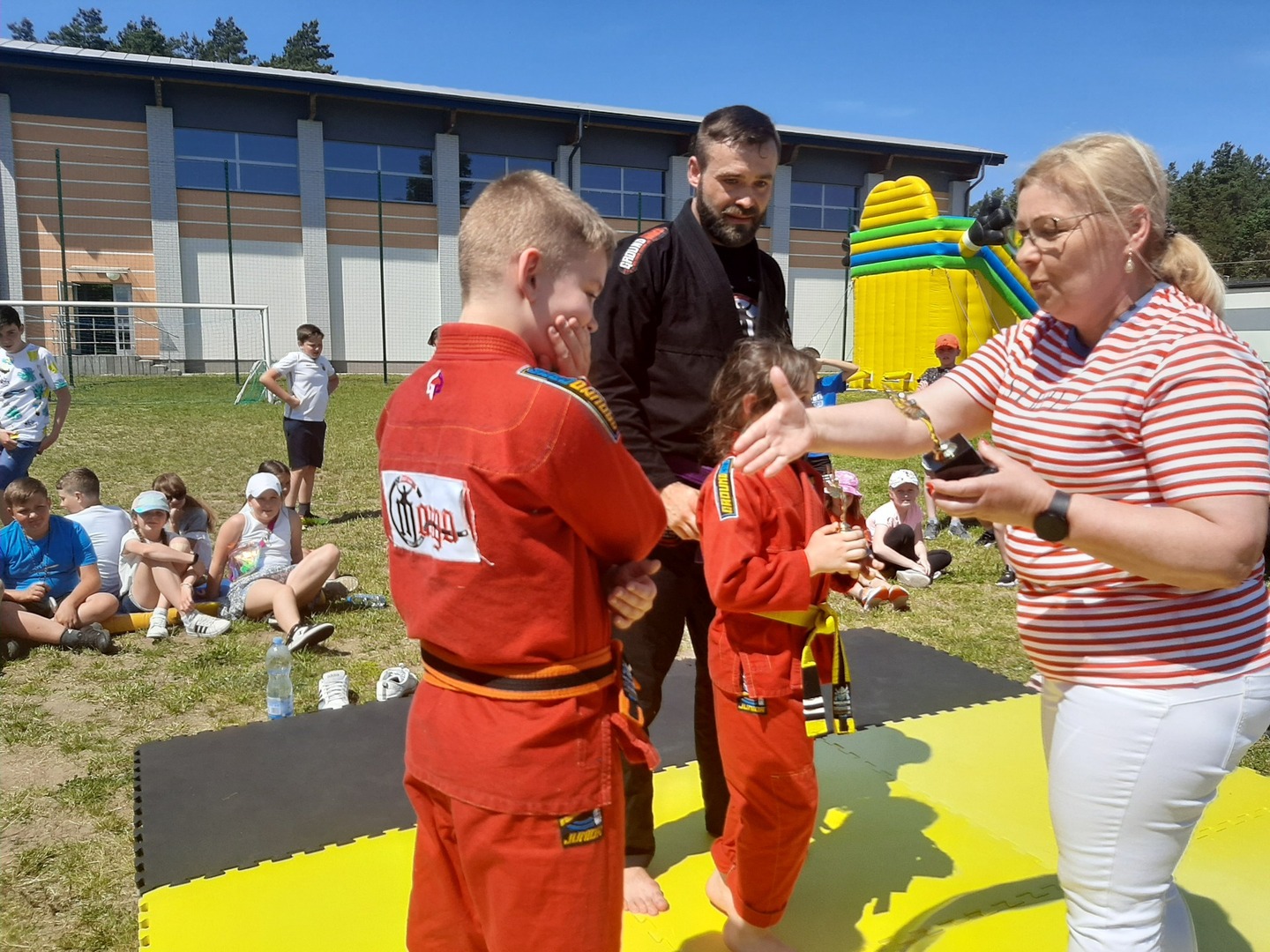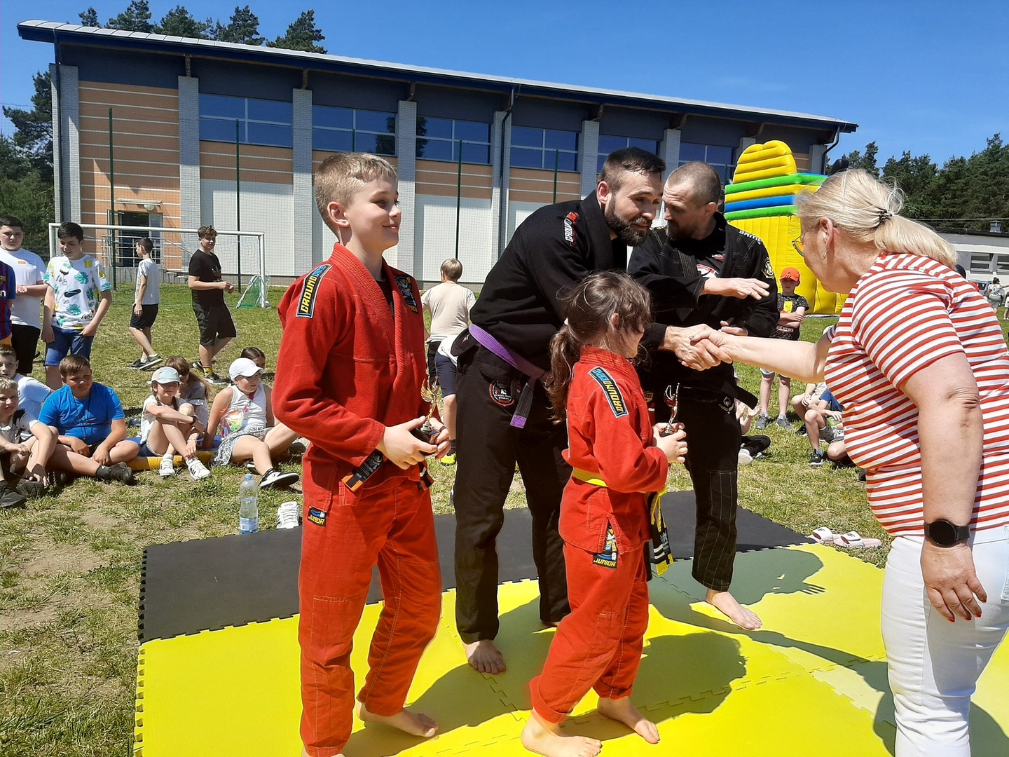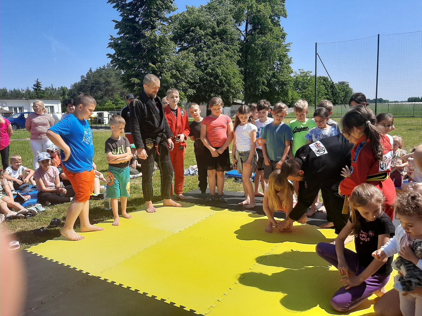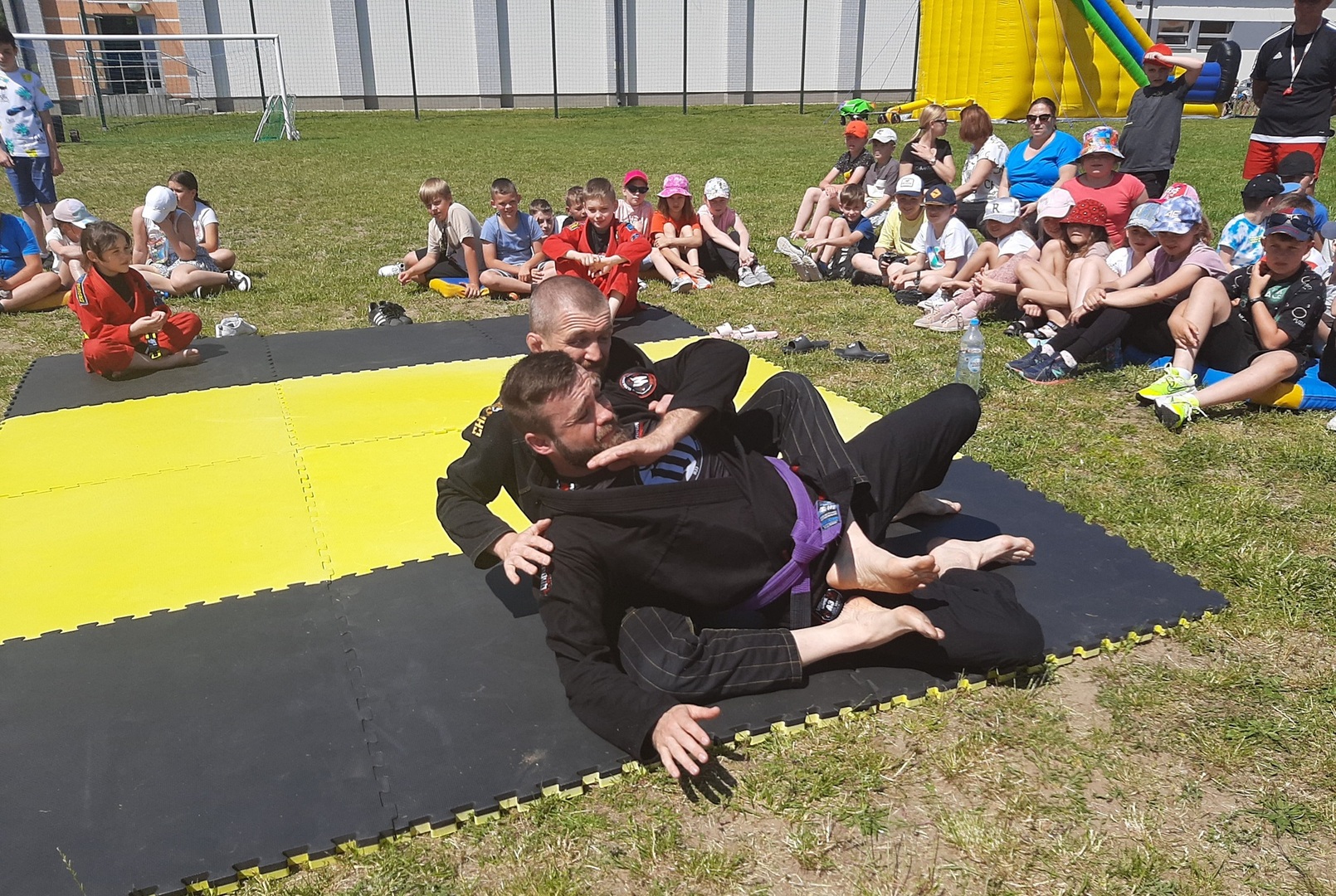 Iga Klamut z klasy I i Wiktor Klamut z klasy IV - trenują brazylijskie jiu - jitsu pod okiem trenerów: Łukasza Bilskiego i Wojciecha Klamuta - taty Igi i Wiktora. Uczniowie naszej szkoły mieli możliwość wzięcia udziału w krótkiej rozgrzewce z trenerami i zawodnikami, obejrzenia pokazu walki, mogli zadawać pytania dotyczące tego niezwykłego sportu.