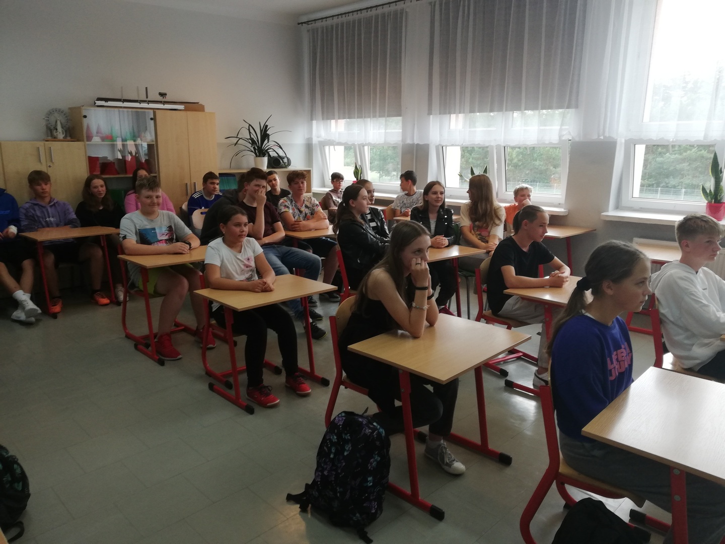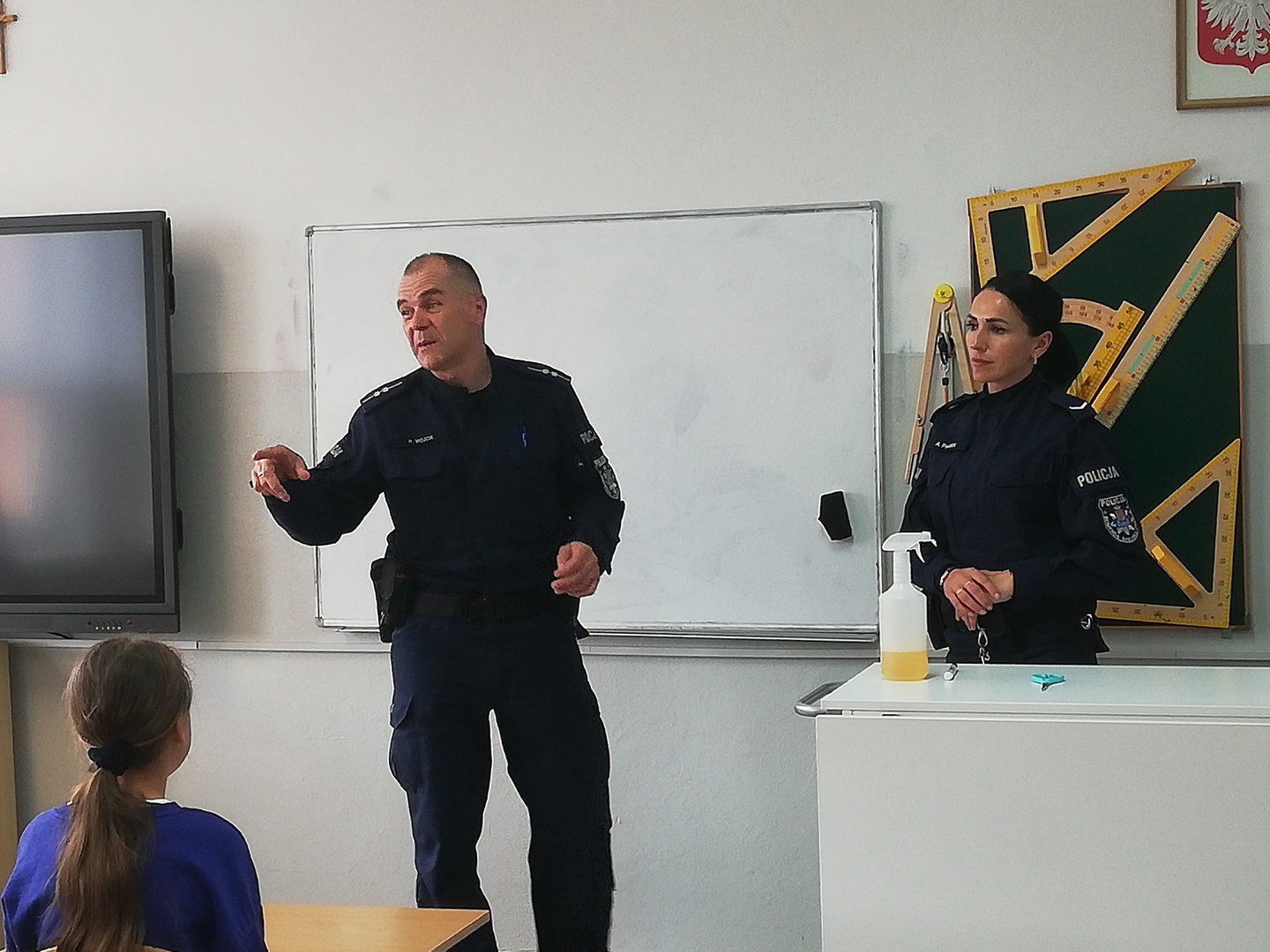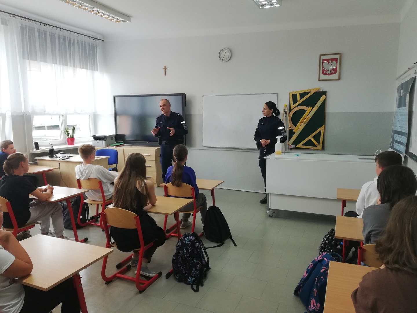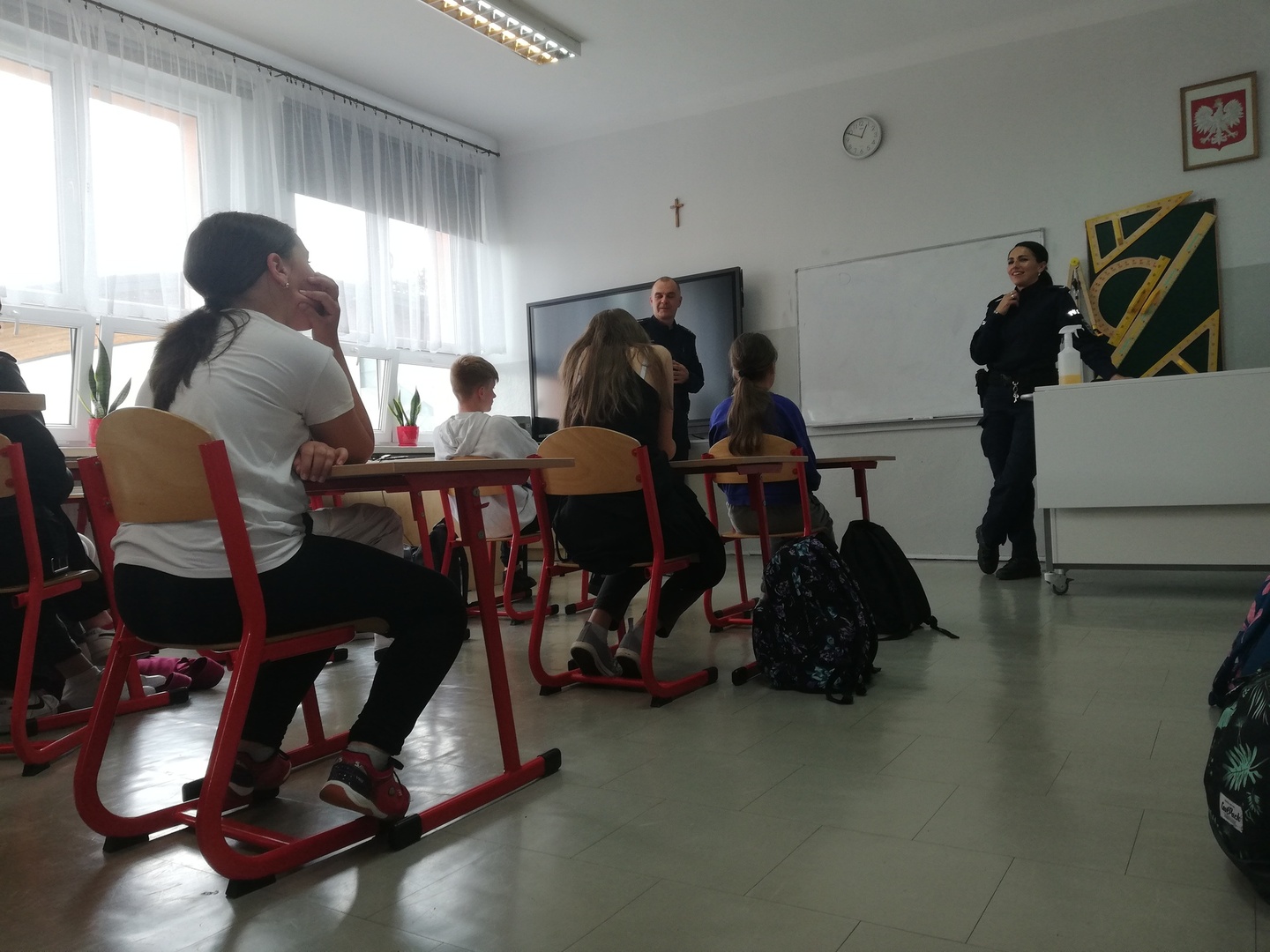Spotkanie poprowadzili sierż. Agnieszka Piasek i asp. Paweł Wójcik. Uczniowie dowiedzieli się, m.in.. czym jest wylegitymowanie i na czym polega demoralizacja dzieci i młodzieży. Dzieci poznały również prawa przysługujące osobom nieletnim. Uczestnicy byli zaangażowani w spotkanie i zadawali wiele pytań, policjanci chętnie na nie odpowiadali. Wywiązała się więc prawdziwa dyskusja.