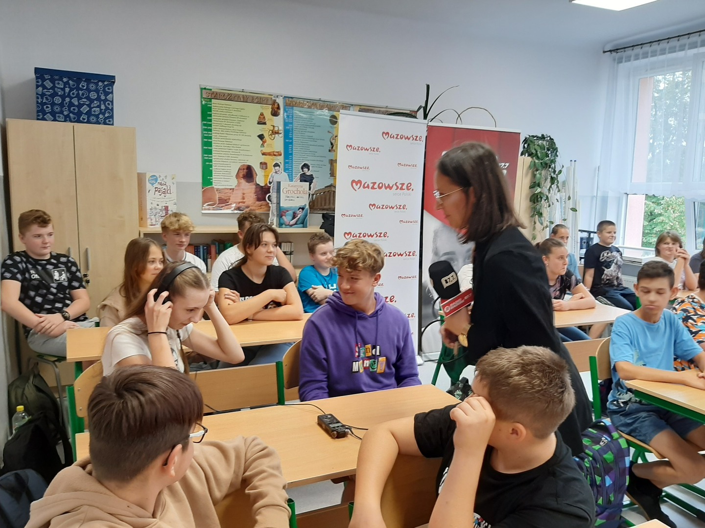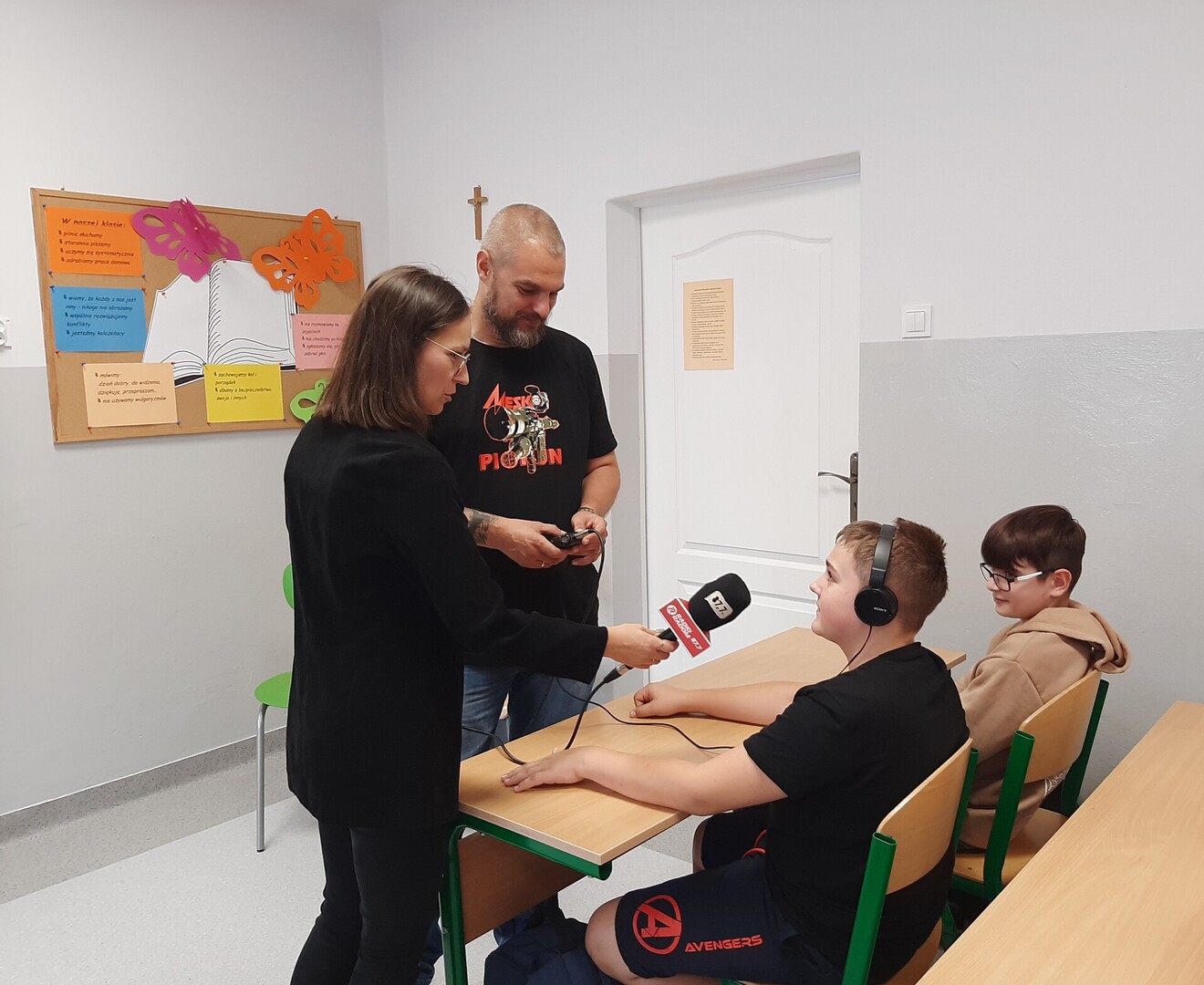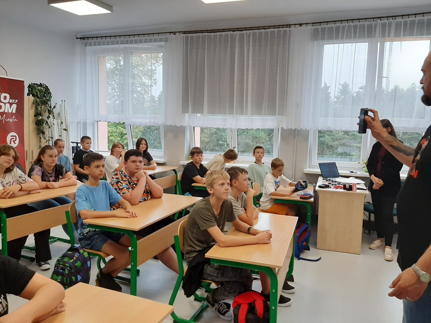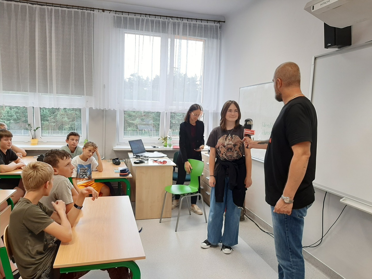 W ramach warsztatów uczniowie klas 7-8 zapoznali się ze specyfiką zawodu, dziennikarskimi narzędziami pracy, tj. mikrofonem przestrzennym i rejestratorem dźwięku. Obejrzeli legitymację dziennikarską i dowiedzieli się, do czego służy kostka na mikrofonie.