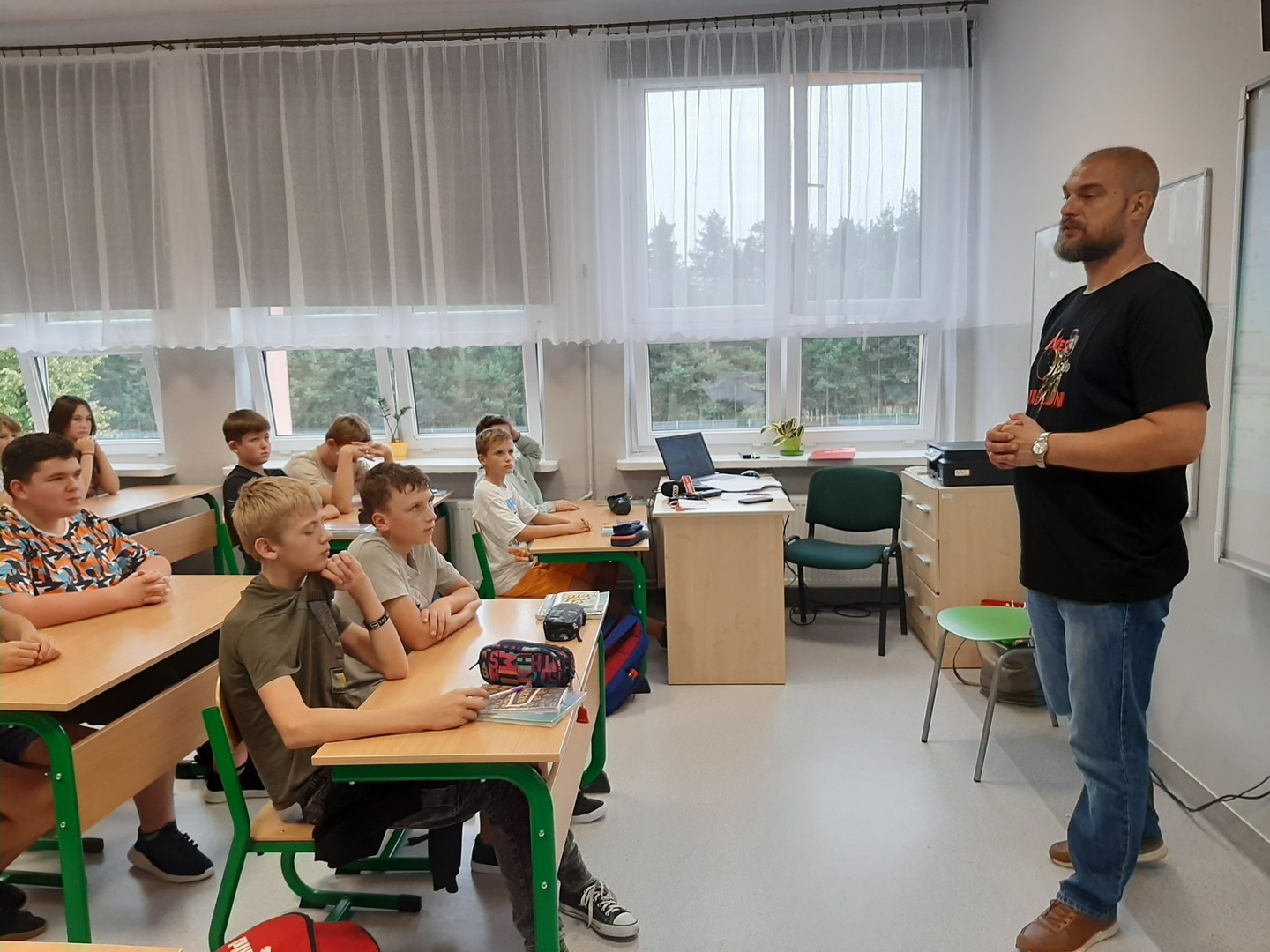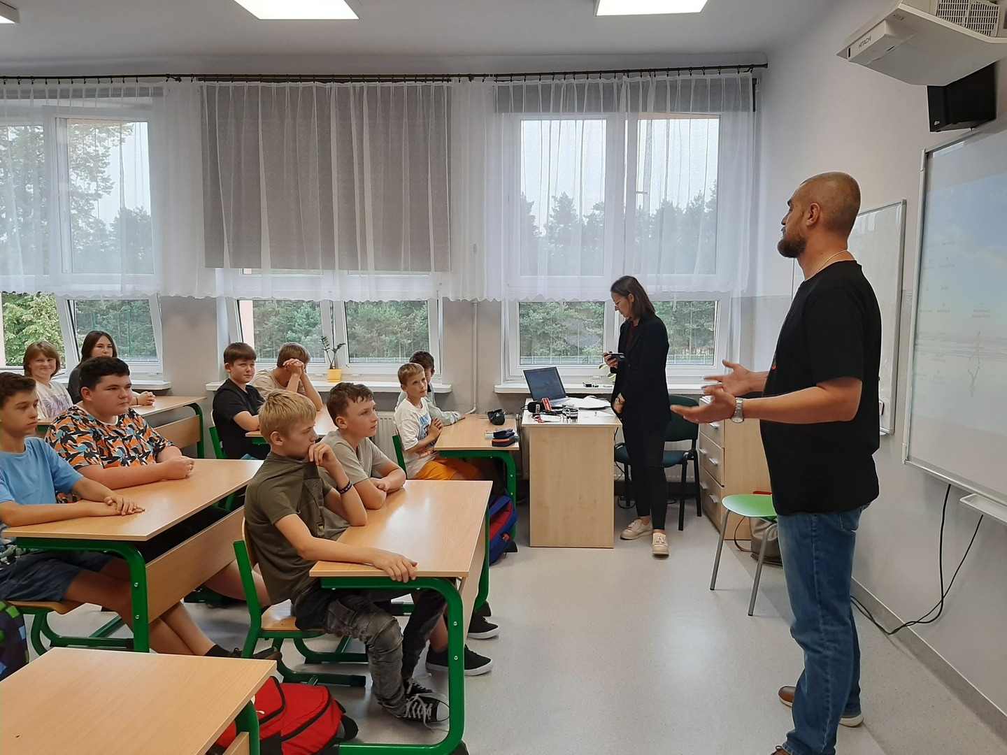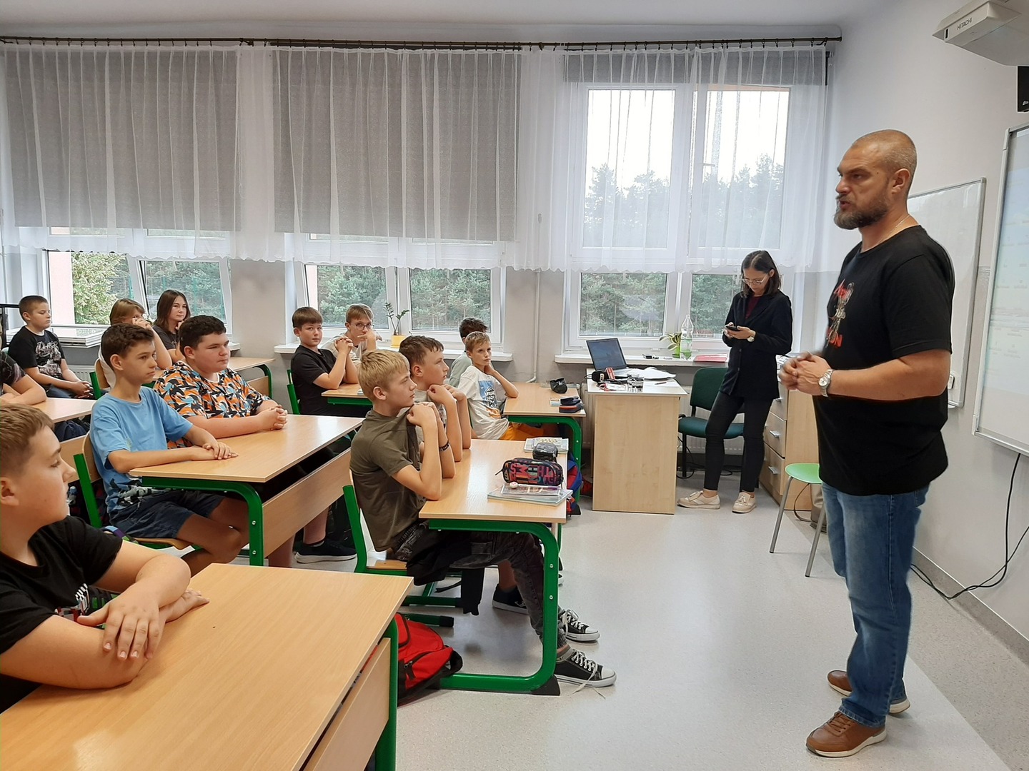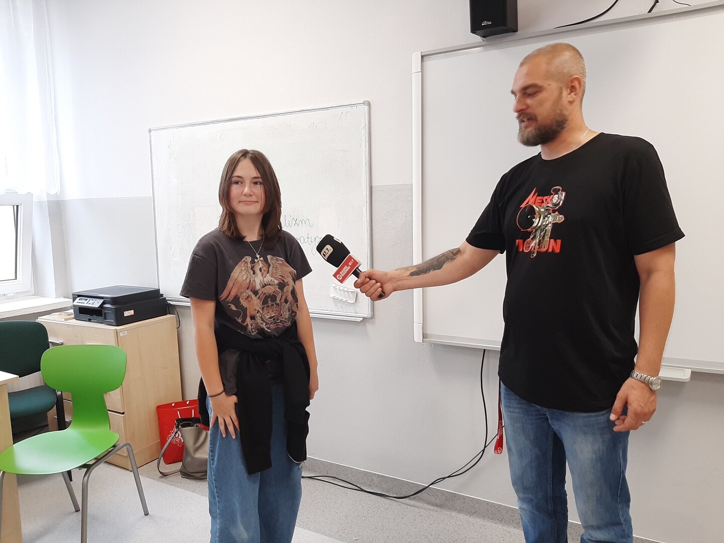 W ramach warsztatów uczniowie klas 7-8 zapoznali się ze specyfiką zawodu, dziennikarskimi narzędziami pracy, tj. mikrofonem przestrzennym i rejestratorem dźwięku. Obejrzeli legitymację dziennikarską i dowiedzieli się, do czego służy kostka na mikrofonie.