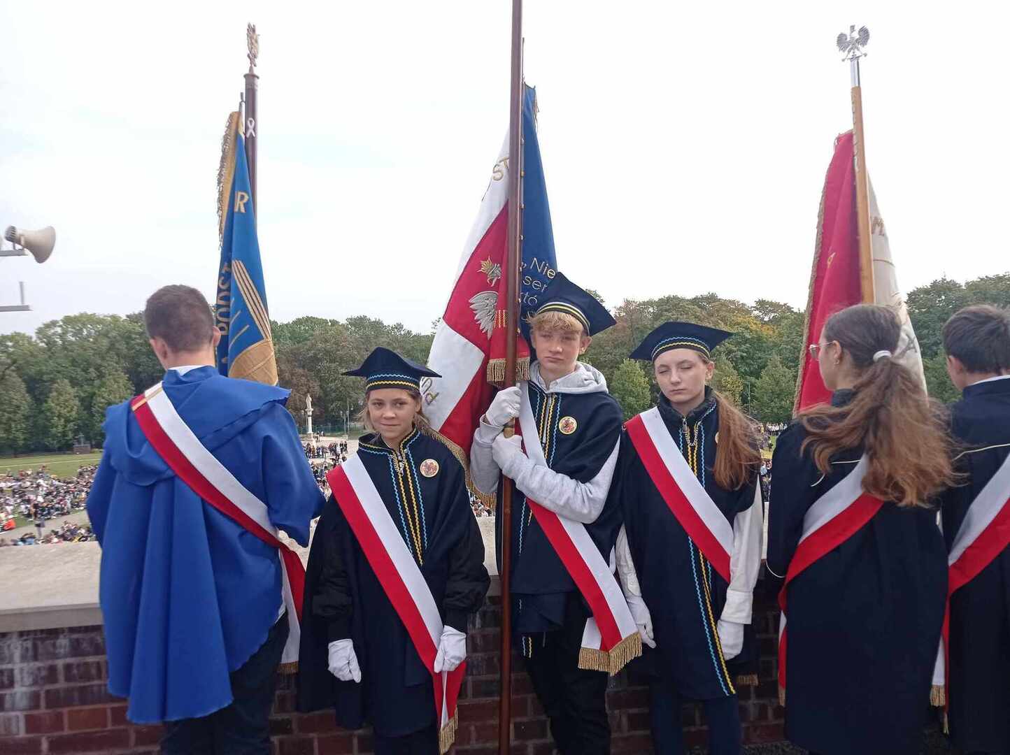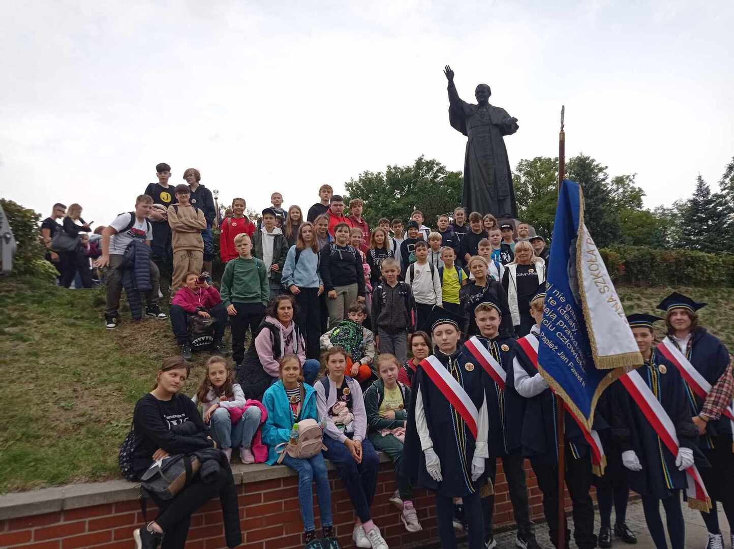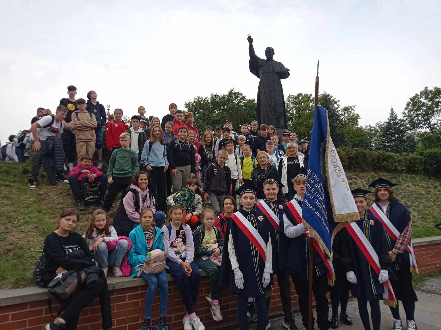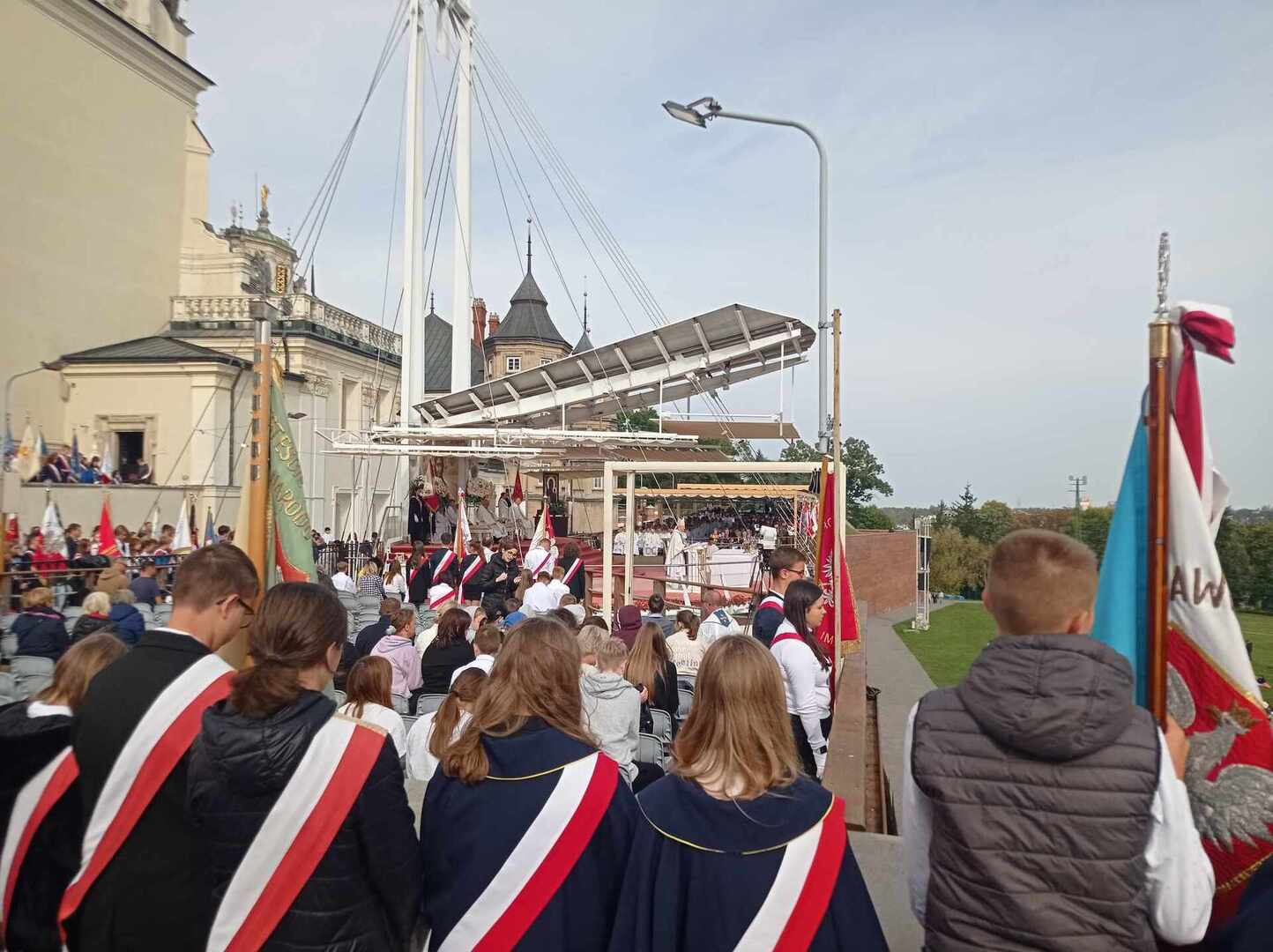 Po przyjeździe uczestniczyliśmy w koncercie Magdy Anioł, który zaktywizował i zintegrował pielgrzymów. Podczas Mszy Świętej biskup radomski Marek Solarczyk przypomniał nauczanie świętego Polaka i podkreślił rolę miłości i odpowiedzialności w życiu młodych ludzi. Jako przykład młodego człowieka wiernego wartościom podał błogosławionego Carlo Acutisa, którego wspomnienie obchodziliśmy. Do zgromadzonych prawie 7000 uczniów powiedział, że sztandary szkolne, których było 170, powinny być przypomnieniem ideałów i celu, do którego dąży młody człowiek. Wyraził nadzieję, że każdy młody człowiek będzie się rozwijał według swych zainteresowań i możliwości oraz pracował dla dobra siebie i innych.