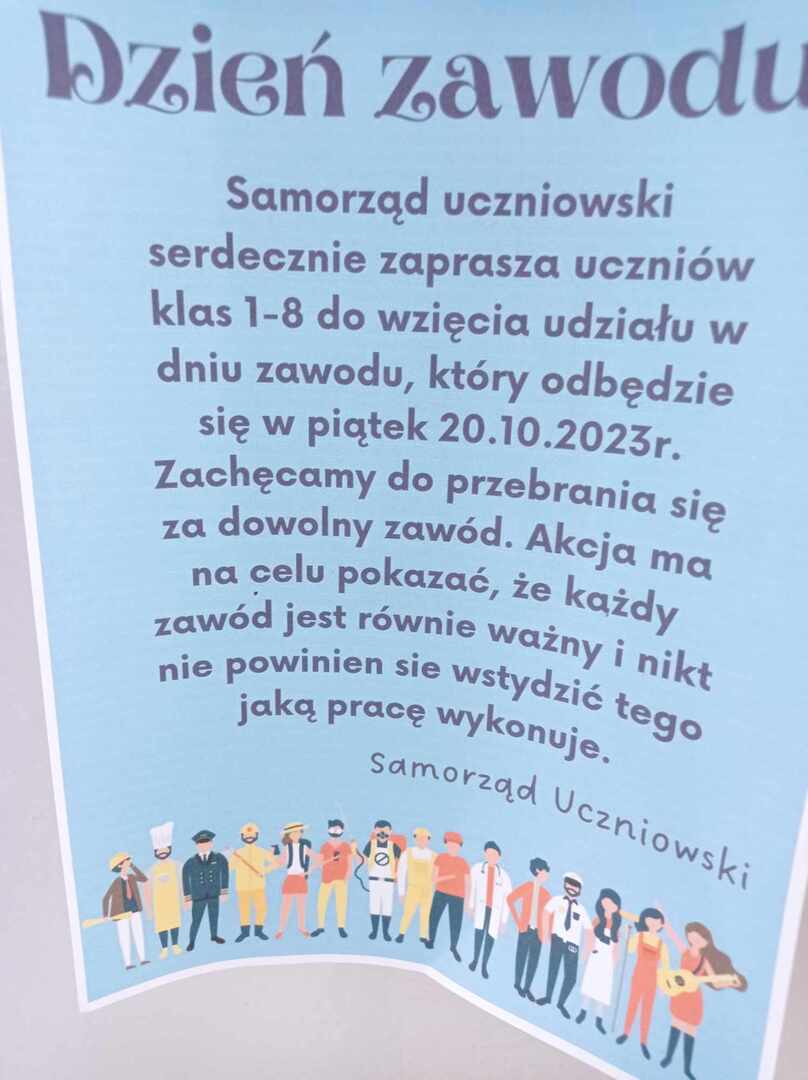 W piątek 20 października z inicjatywy Samorządu Uczniowskiego w naszej szkole odbył się Dzień Zawodu. Chętni uczniowie przebrali się za przedstawicieli różnych zawodów. Przedsięwzięcie miało na celu uświadomienie społeczności szkolnej, że każdy zawód jest potrzebny i nie może być powodem dyskryminacji.