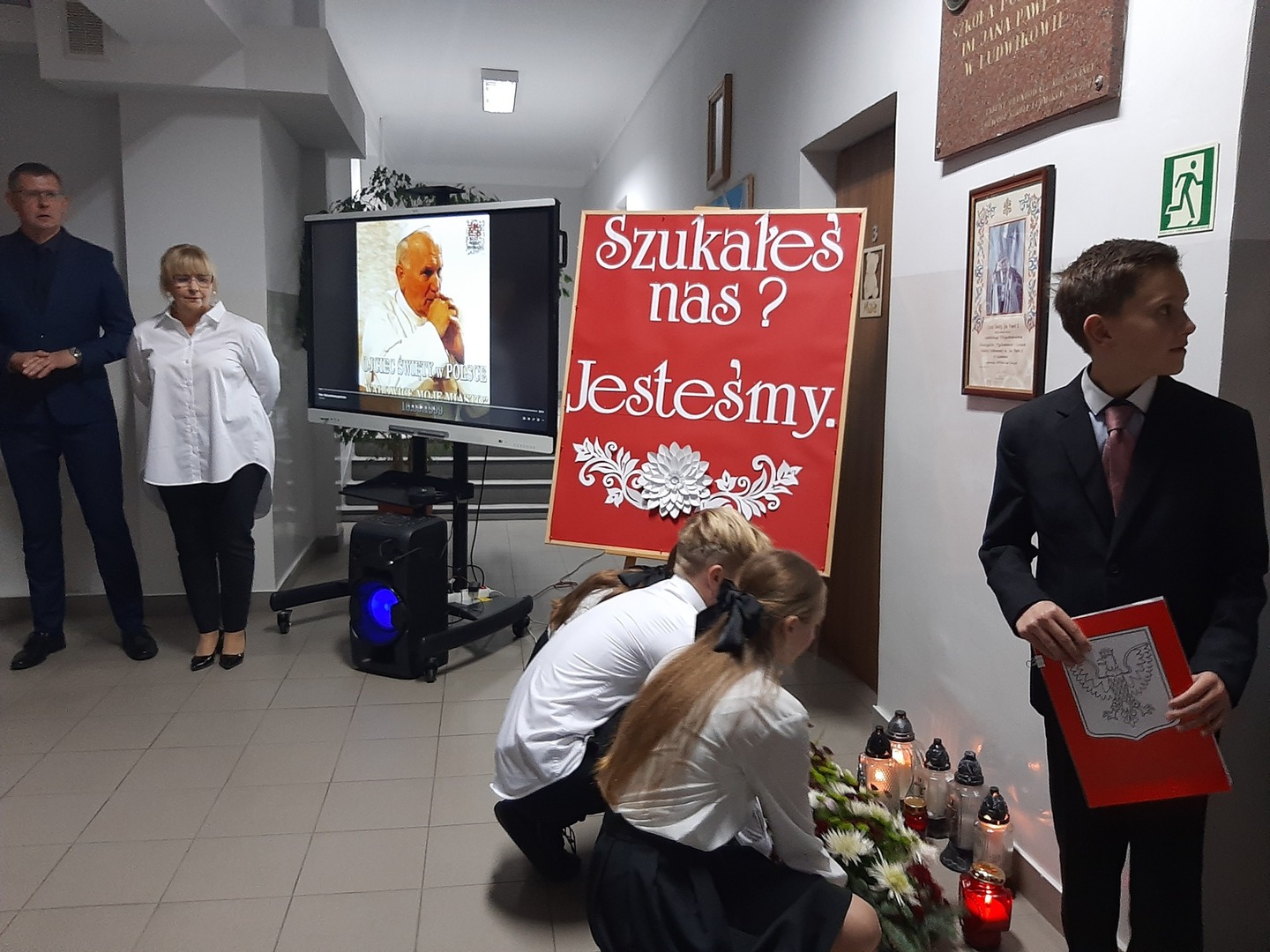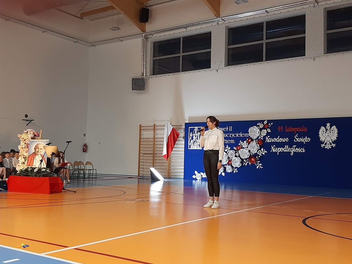 W piątek - 10 listopada obchodziliśmy 2 wielkie święta : rocznicę nadania imienia naszej szkole i Narodowe Święto Niepodległości. I nie było to przypadkowe połączenie. Jan Paweł II jest jednym z najważniejszych ojców niepodległości Polski. Cały swoim życiem dawał dowód wielkiego patriotyzmu, umiłowania ojczyzny. Oddawał szacunek ojczystej ziemi, całując ją na kolanach . Jestem synem wielkiego Narodu – mówił o sobie nasz Ojciec Święty.