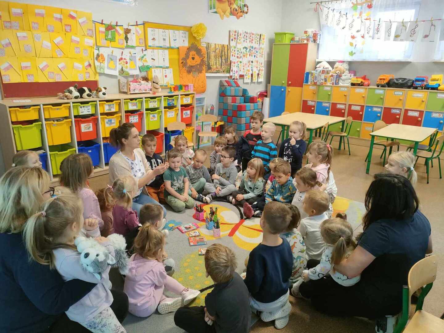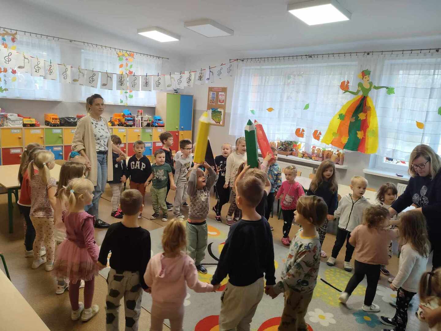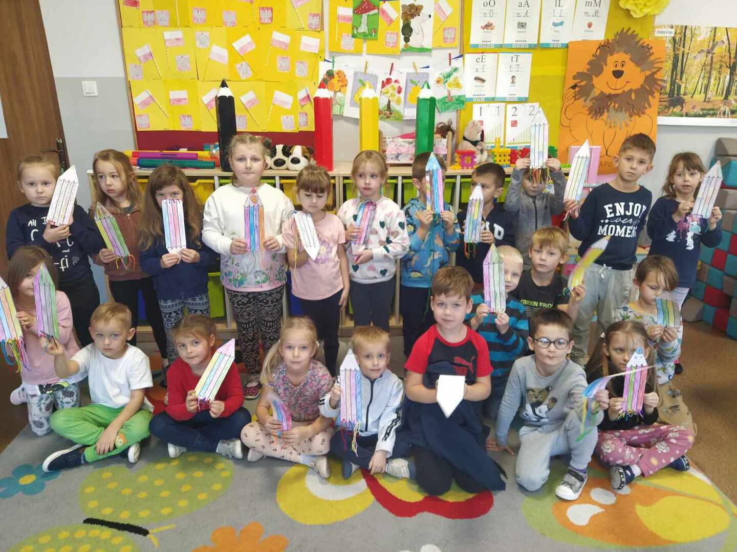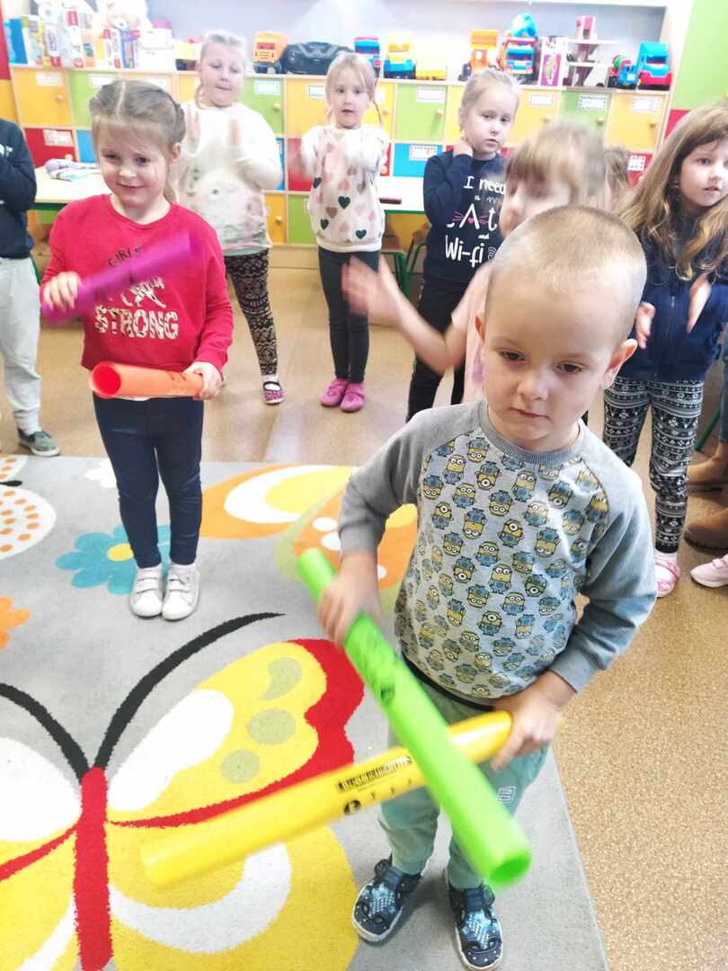 Dzieci wesoło bawiły się podczas zabaw rytmicznych oraz ruchowych przy piosence „Kolorowe kredki”. Wykonały piękną zakładkę do książki. Był to bardzo wesoły i kolorowy dzień.