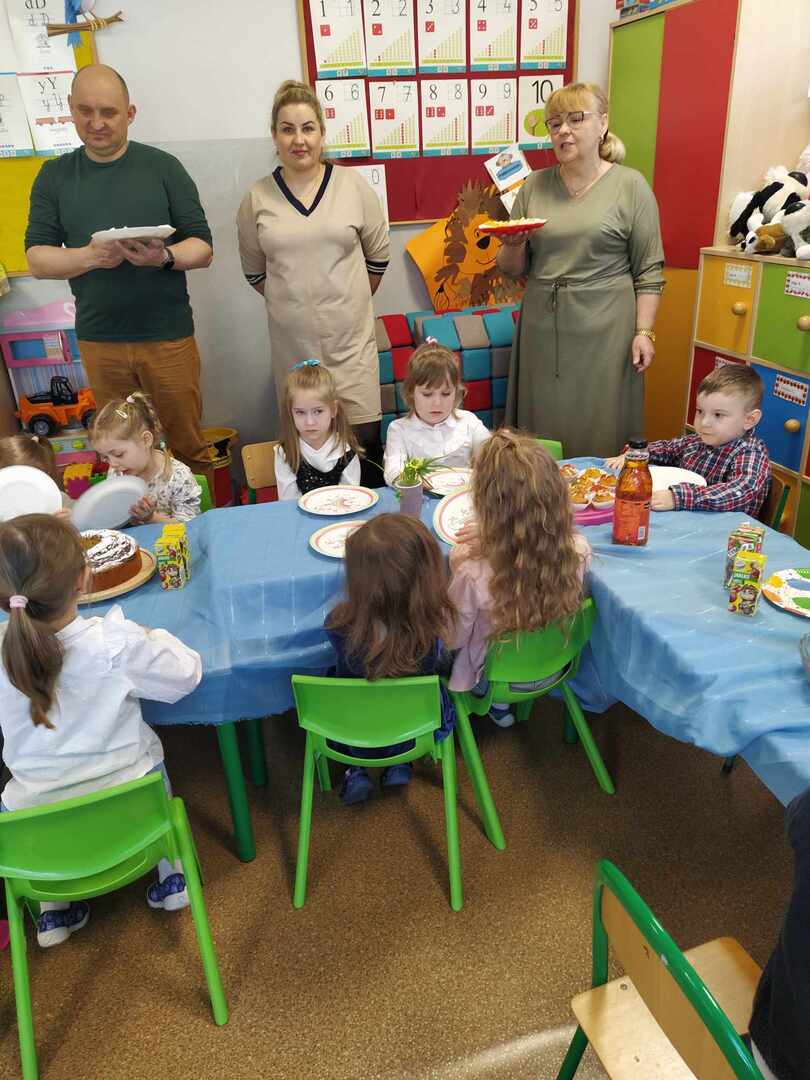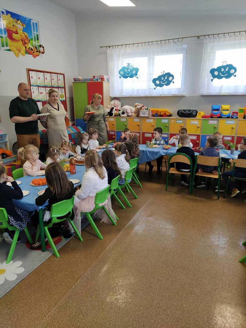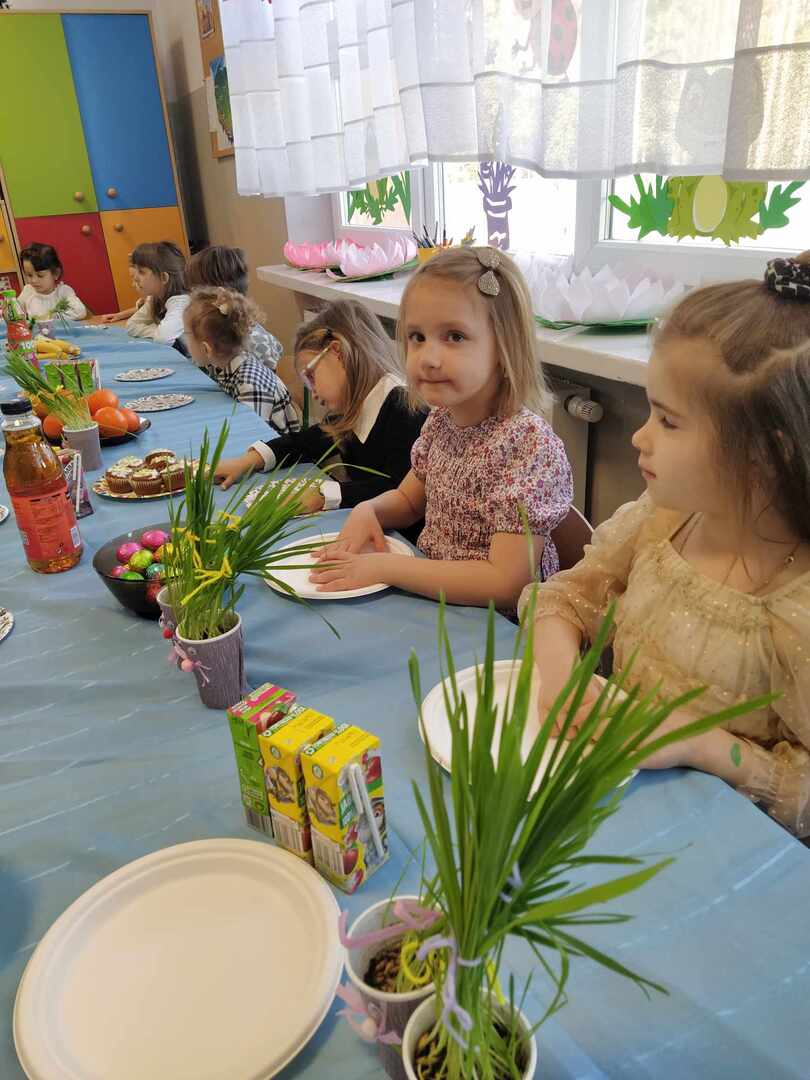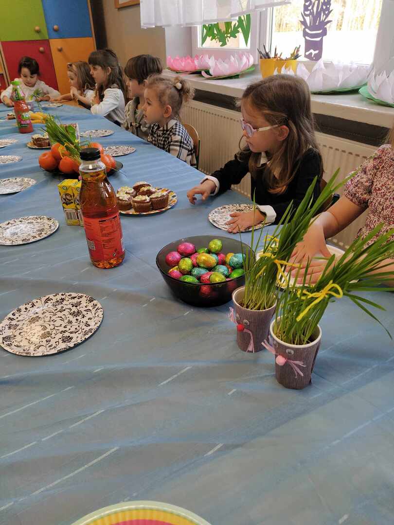W środę 27 marca 2024r. dzieci z oddziałów przedszkolnych wraz z nauczycielami zasiadły do śniadania wielkanocnego. Przedszkolaki aktywnie włączyły się w przygotowanie świątecznego poczęstunku. Pani dyrektor Małgorzata Sobień złożyła dzieciom świąteczne życzenia, częstując symbolicznym jajkiem.