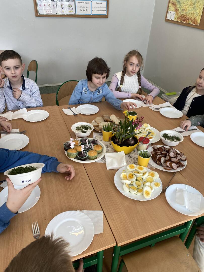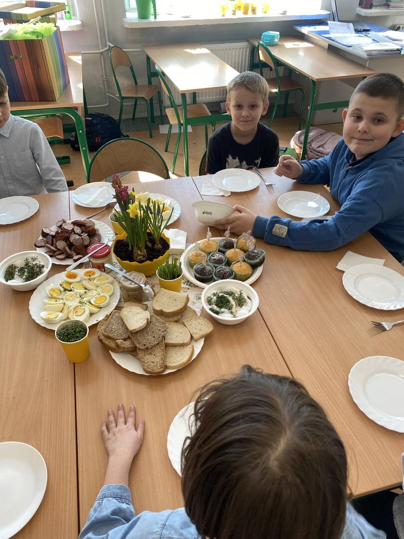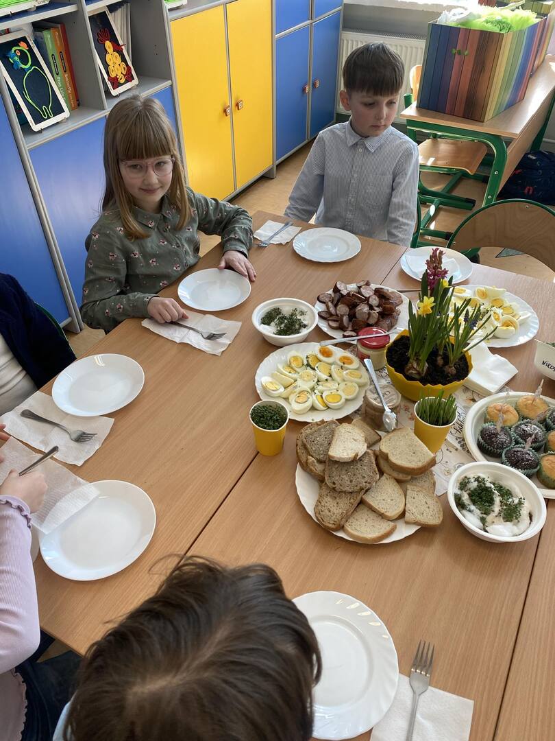 Uczniowie z radością zasiedli przy świątecznym stole. Opowiadali o wielkanocnych zwyczajach, a potem dzielili się jajkiem i kosztowali przepysznych jajeczek, kiełbaski i babeczek.