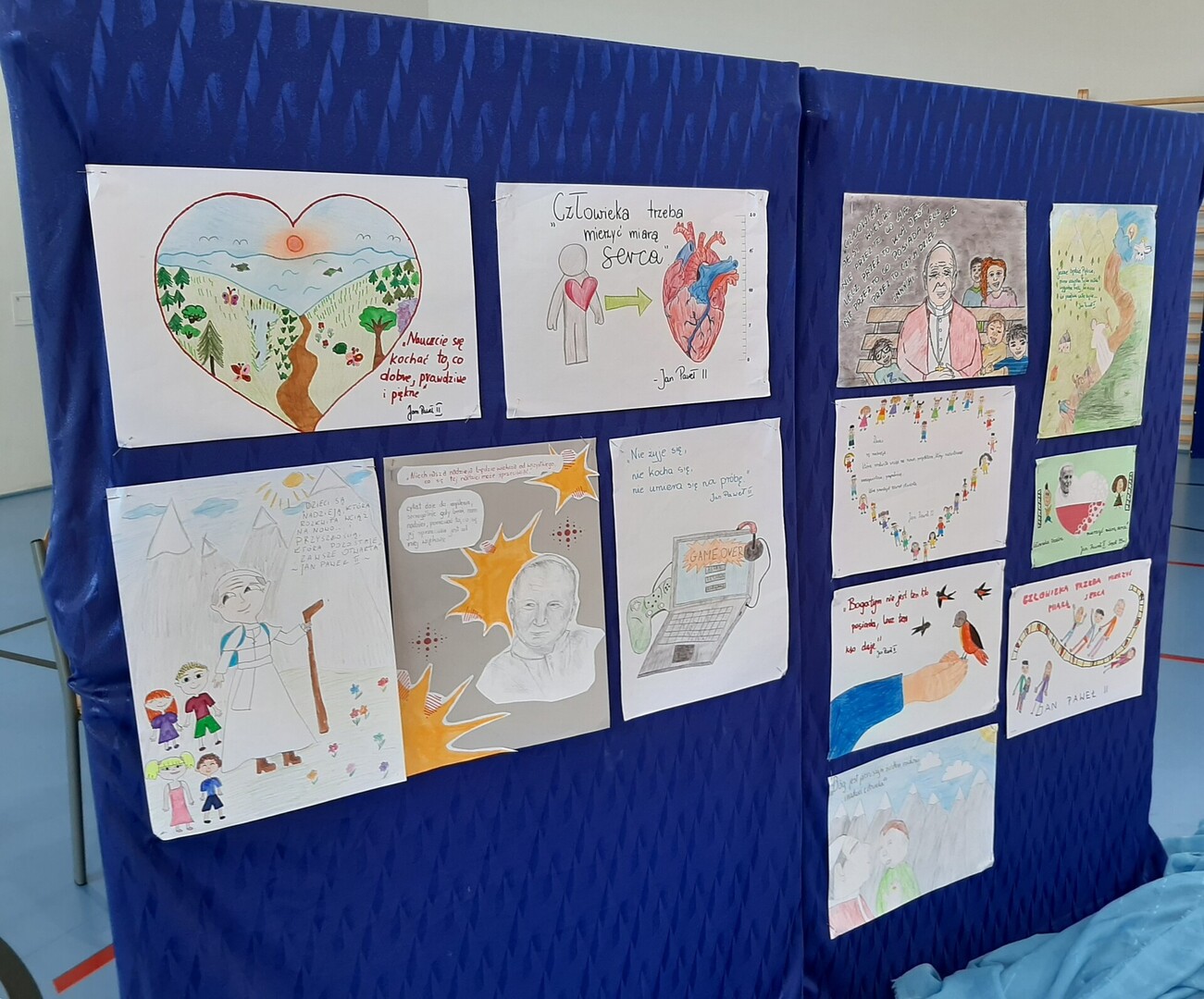 Na początku kwietnia został ogłoszony konkurs plastyczny "Drogowskazy". Zadaniem uczestników było w formie graficznej przedstawić cytat z nauczania naszego patrona Jana Pawła II, który mógłby być drogowskazem dla młodego człowieka. Uczniowie przygotowali 12 prac. Najczęściej wybierane słowa to: "Człowieka trzeba mierzyć miarą serca".
