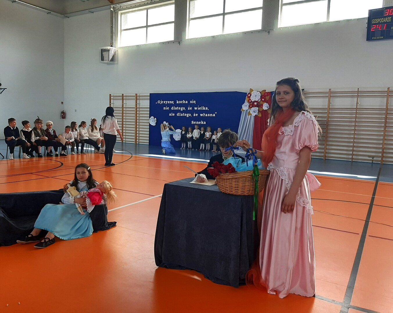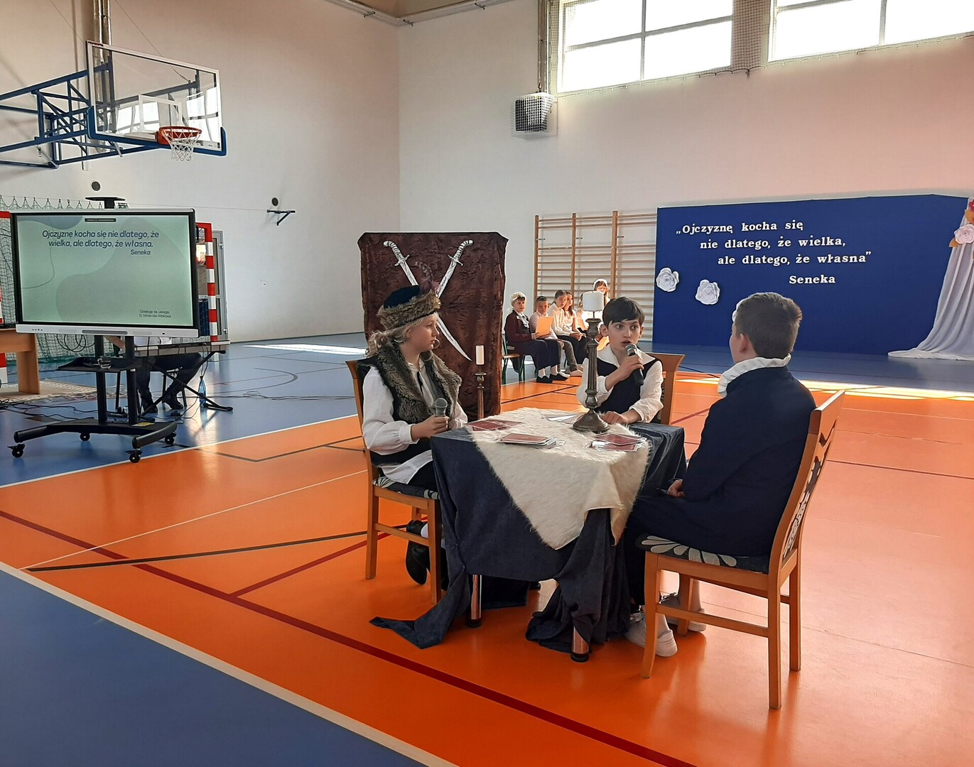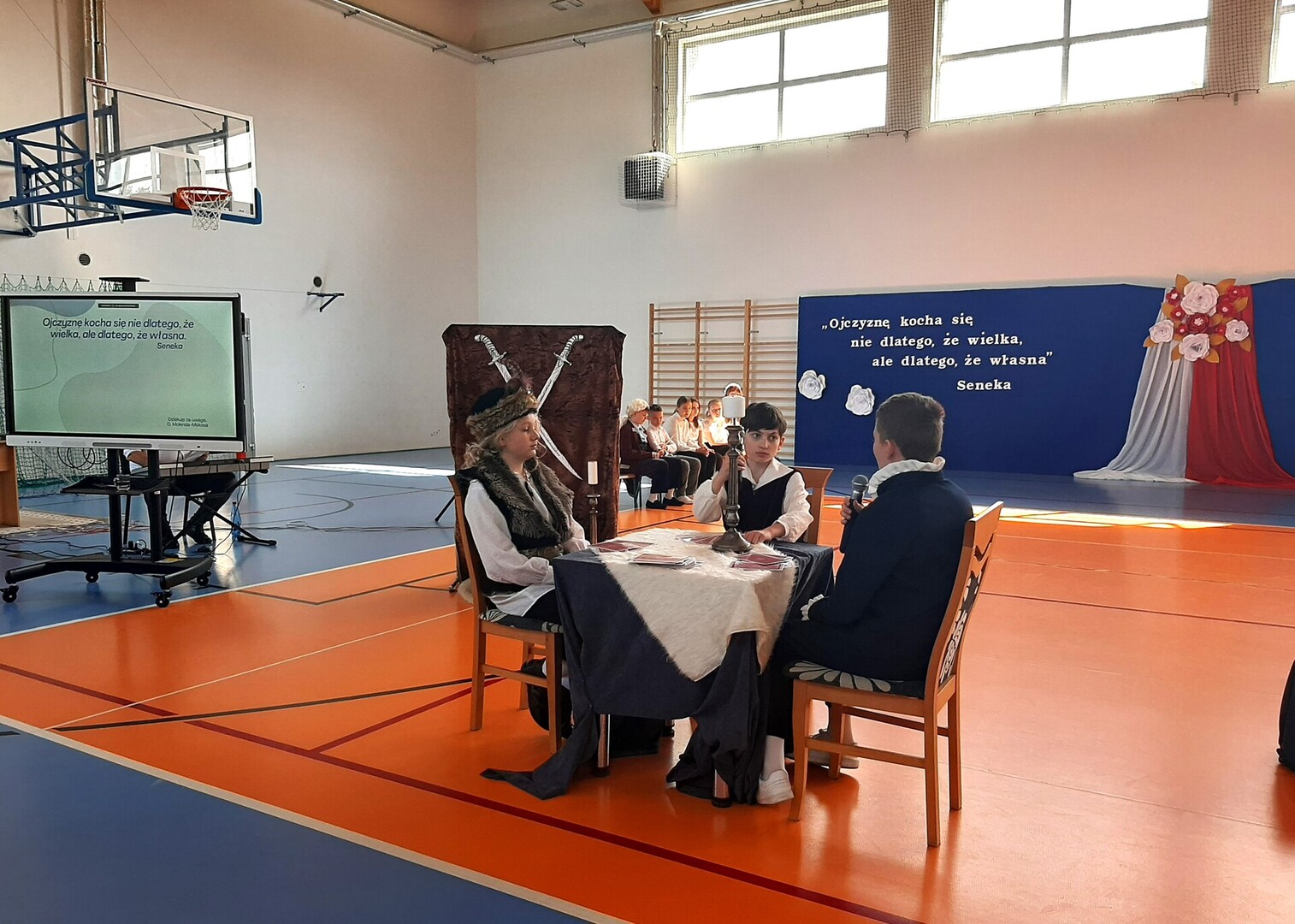 Po krótkiej lekcji patriotyzmu (prezentacji multimedialne i quizie historycznym) obejrzeliśmy miniaturę teatralną w wykonaniu uczniów klasy 5.