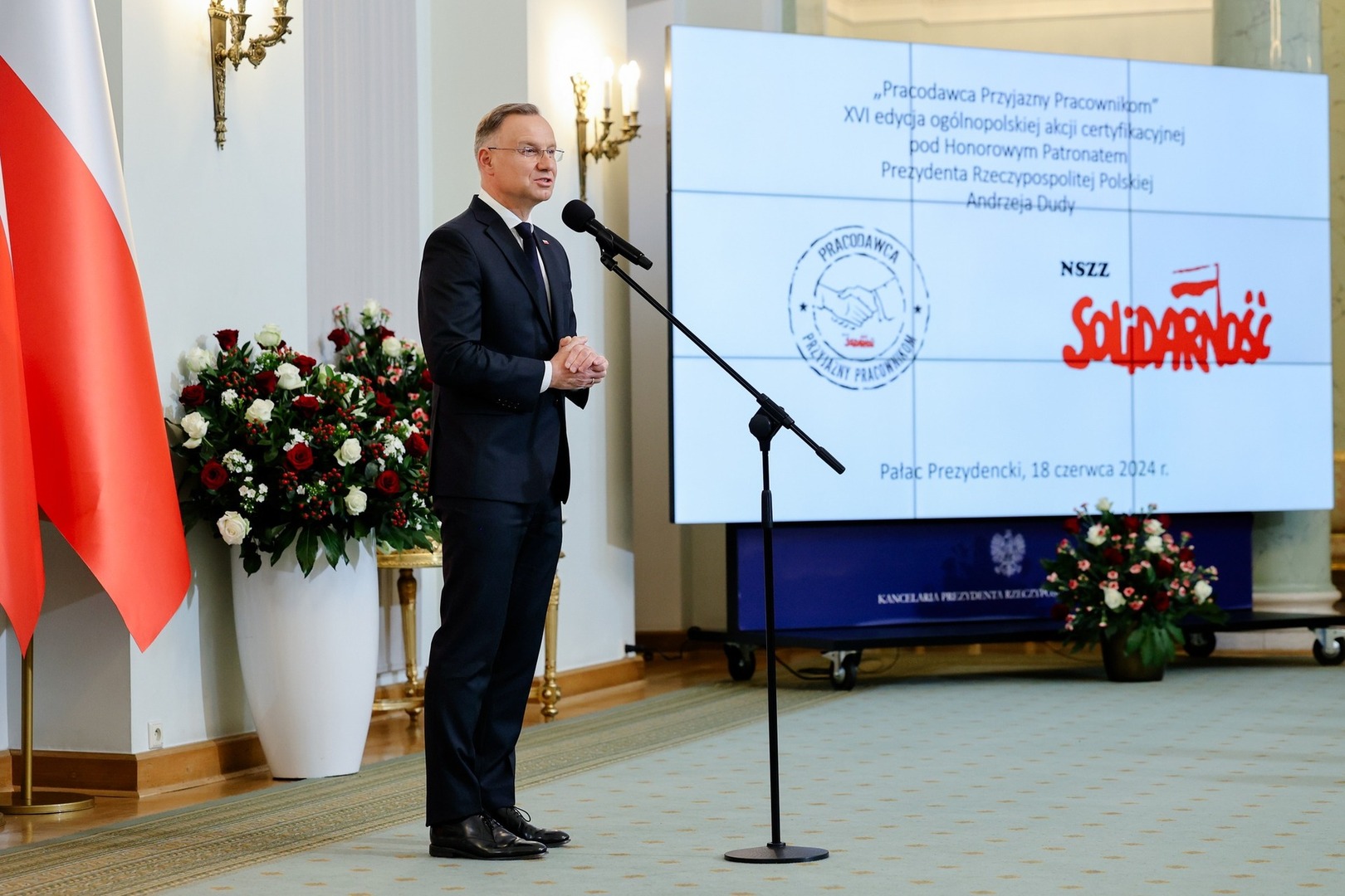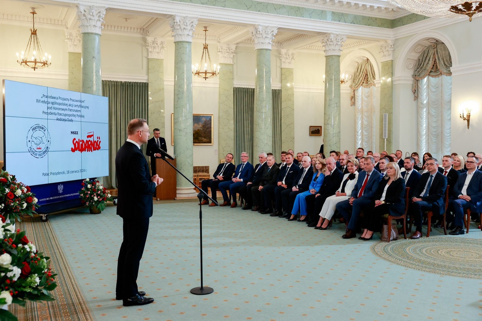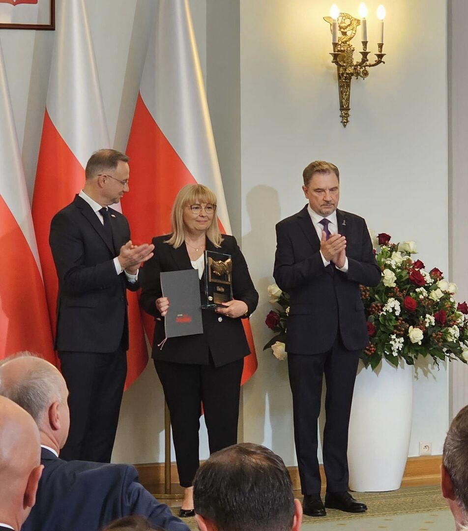 Mamy zaszczyt poinformować, że 18 czerwca 2024 roku pani dyrektor Małgorzata Sobień odebrała z rąk Prezydenta Rzeczpospolitej Polskiej Andrzeja Dudy oraz Przewodniczącego NSZZ „Solidarność” Piotra Dudy nagrodę/certyfikat „Pracodawca Przyjazny Pracownikom” przyznaną Publicznej Szkole Podstawowej im. Jana Pawła II w Ludwikowie.