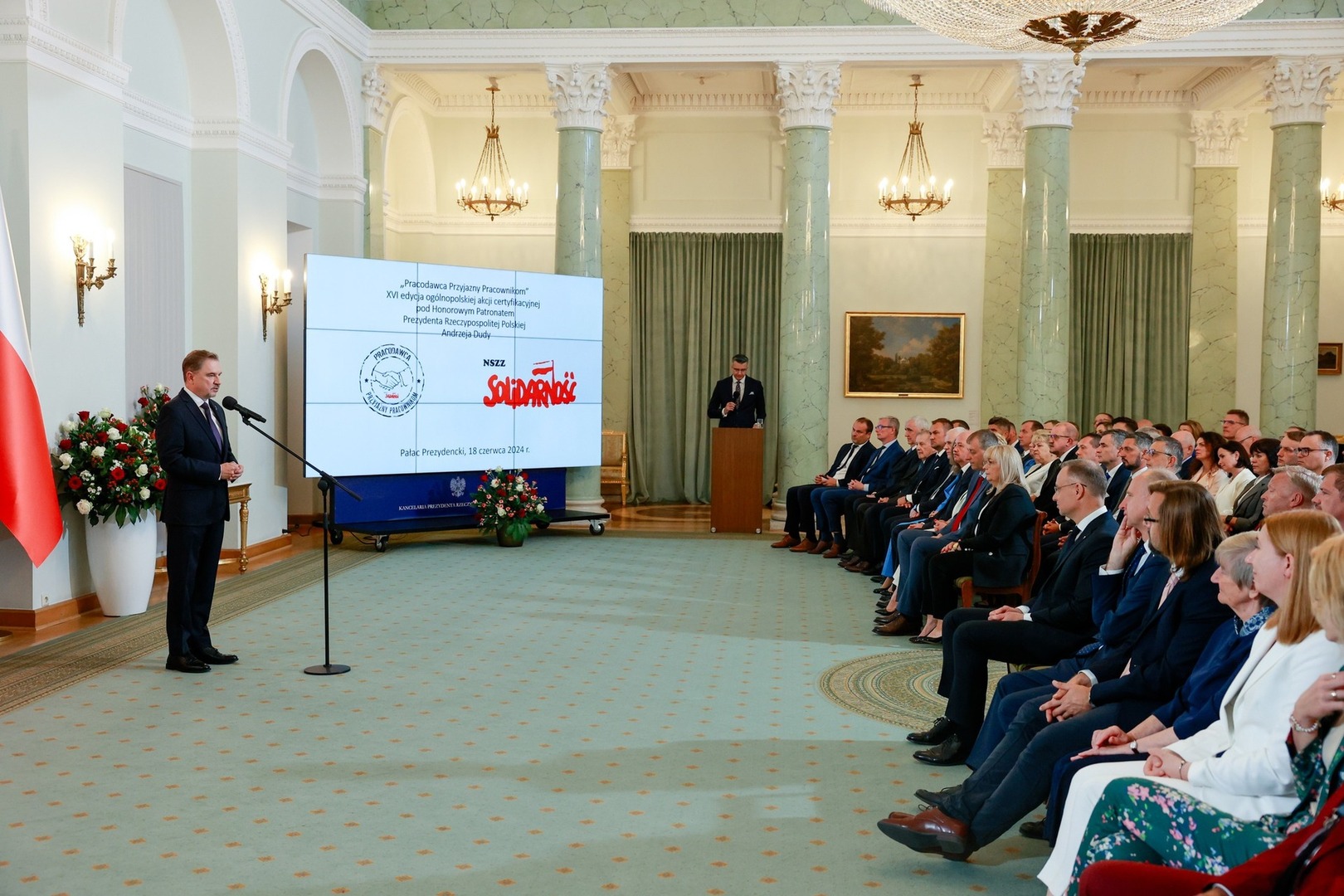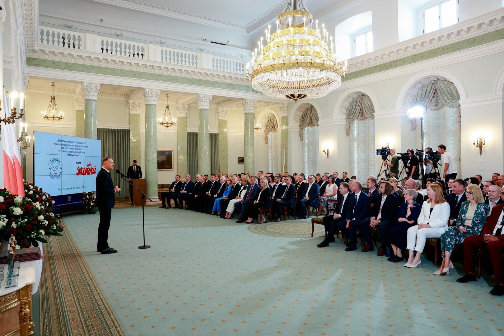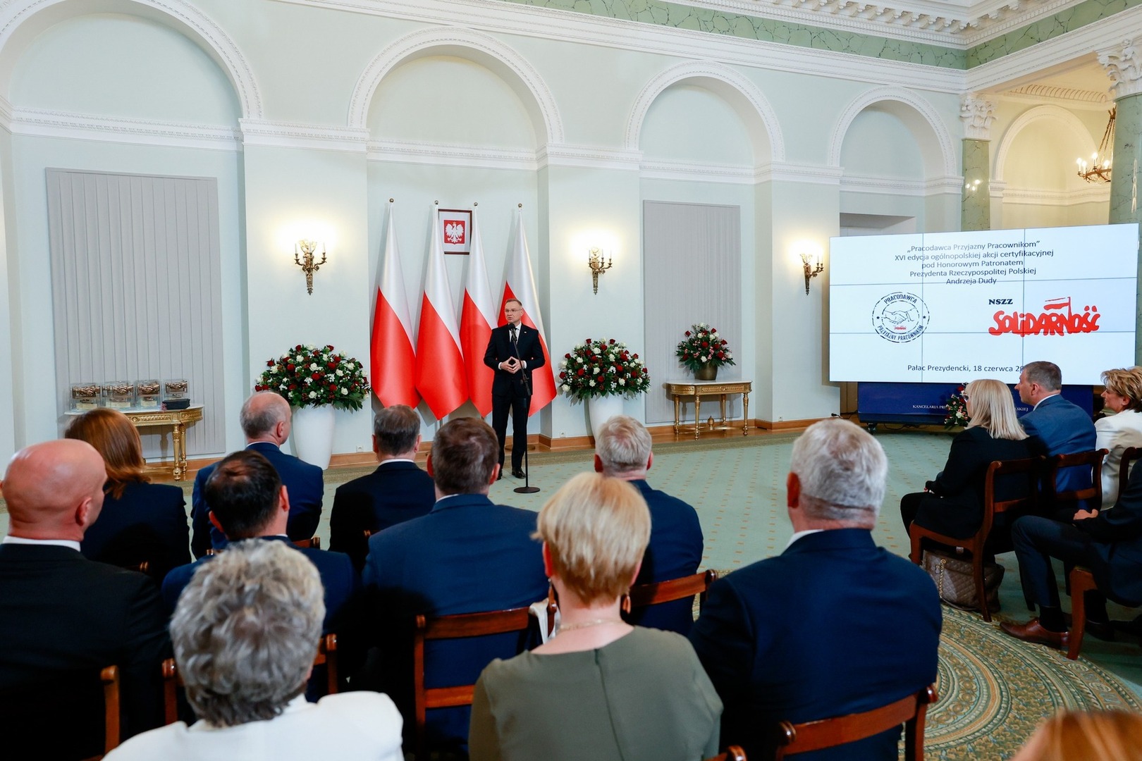 Mamy zaszczyt poinformować, że 18 czerwca 2024 roku pani dyrektor Małgorzata Sobień odebrała z rąk Prezydenta Rzeczpospolitej Polskiej Andrzeja Dudy oraz Przewodniczącego NSZZ „Solidarność” Piotra Dudy nagrodę/certyfikat „Pracodawca Przyjazny Pracownikom” przyznaną Publicznej Szkole Podstawowej im. Jana Pawła II w Ludwikowie.