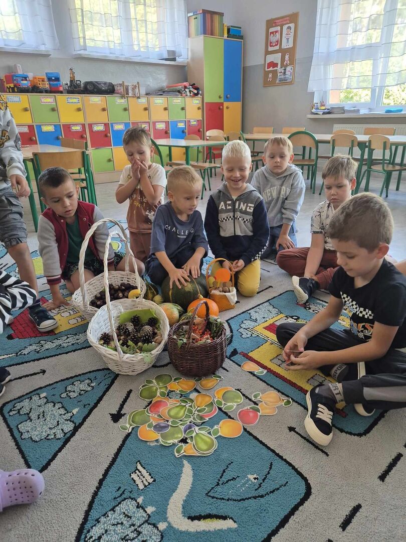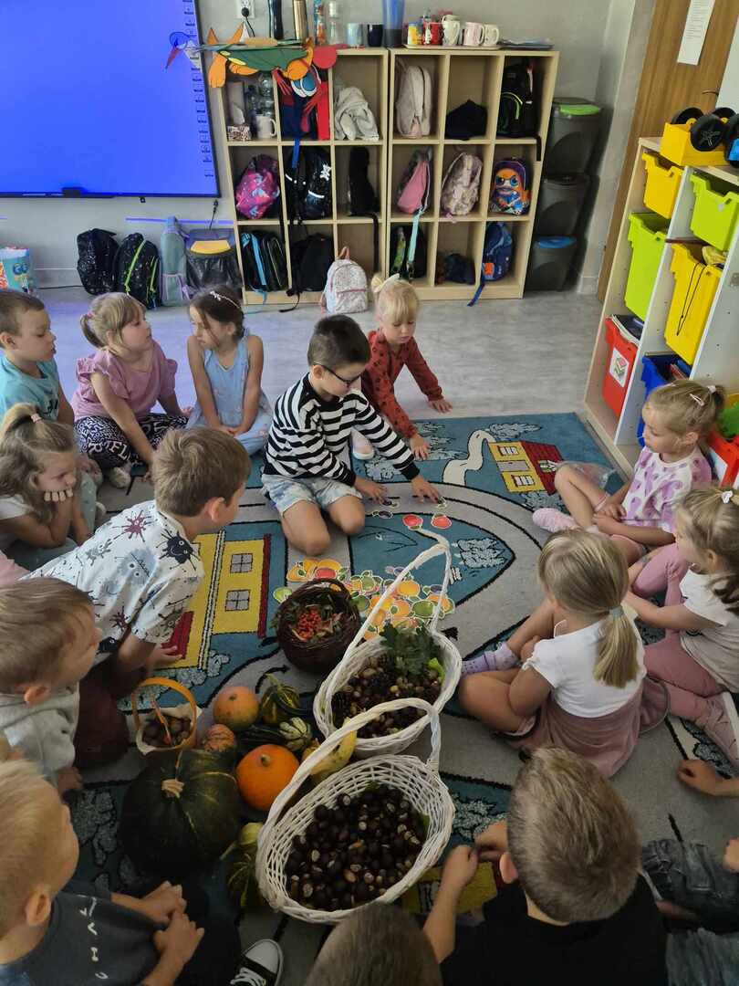 23 września przedszkolaki świętowały pierwszy dzień kalendarzowej jesieni. Z tej okazji dzieci obejrzały film edukacyjny, z którego dowiedziały się jak zmienia się przyroda jesienią i jakie owoce możemy od niej dostać. Nasze przedszkolaki już od kilku dni przynosiły do sali różne dary jesieni, takie jak: kasztany, jarzębinę, dynie, orzechy. Wszystko to mogliśmy również wspólnie zaobserwować na spacerze, bo jesień to piękna pora roku, pełna kolorów i cudownych widoków.