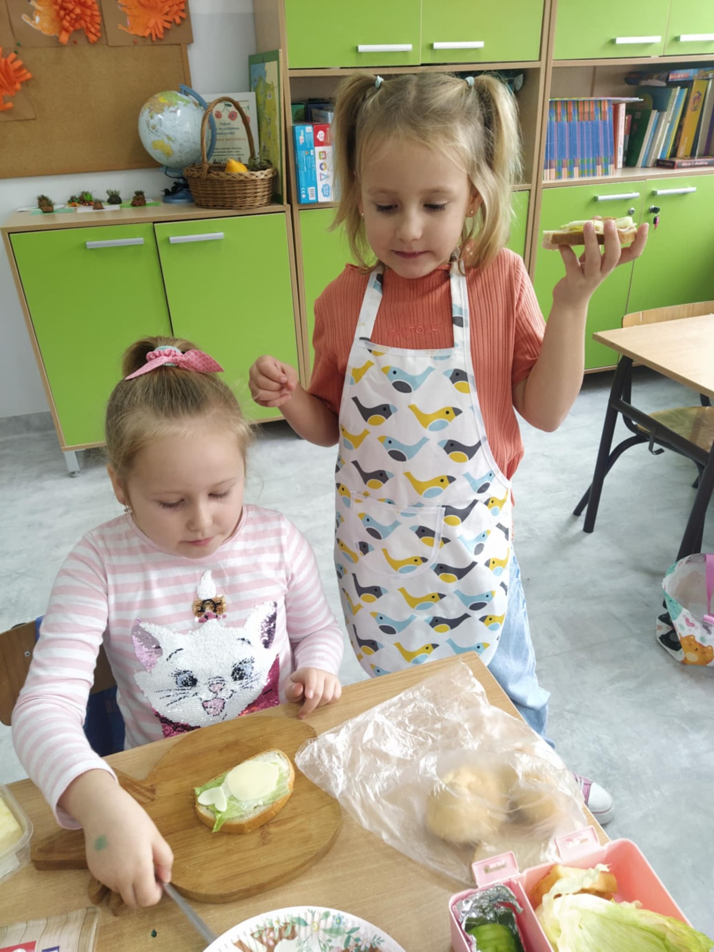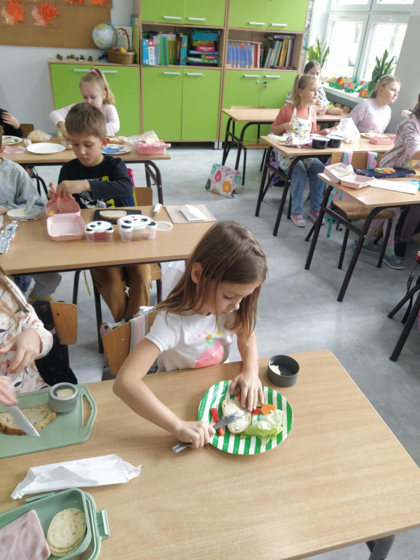 Klasa pierwsza w tym roku przystąpiła do programu "Owoce i warzywa w szkole". Z tej okazji odbyła się specjalna lekcja o zdrowym odżywianiu. Dzieci dowiedziały się, jak ważne są warzywa i owoce w codziennej diecie, by zachować zdrowie i energię. Pod opieką nauczyciela przygotowały pyszne, kolorowe kanapki, pełne świeżych warzyw. Każdy uczeń mógł wybrać swoje ulubione składniki, takie jak pomidory, ogórki, sałata, czy chrupiąca papryka. W czasie przygotowań dzieci miały dużo radości, a przy okazji uczyły się współpracy. Gotowe kanapki nie tylko pięknie wyglądały, ale także wspaniale smakowały. Po posiłku uczniowie omawiali, dlaczego warto jeść warzywa i owoce codziennie. To była niezapomniana lekcja zdrowego odżywiania i dobrej zabawy!