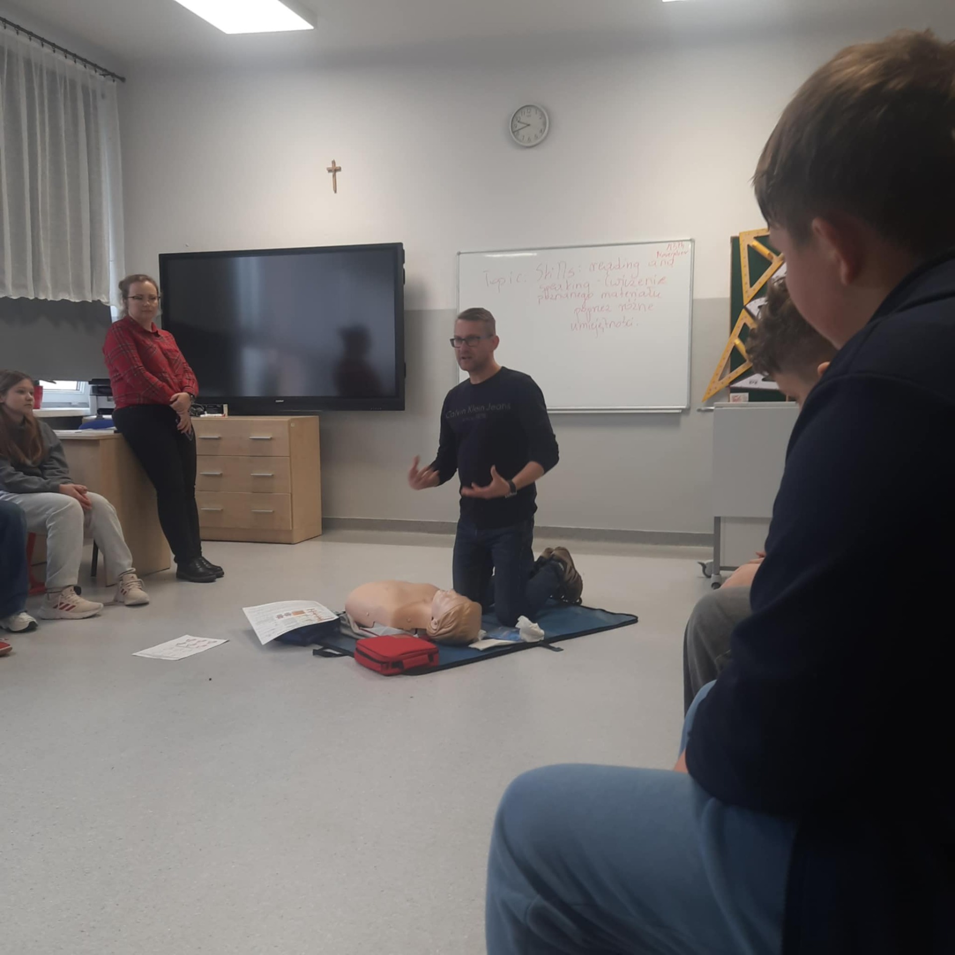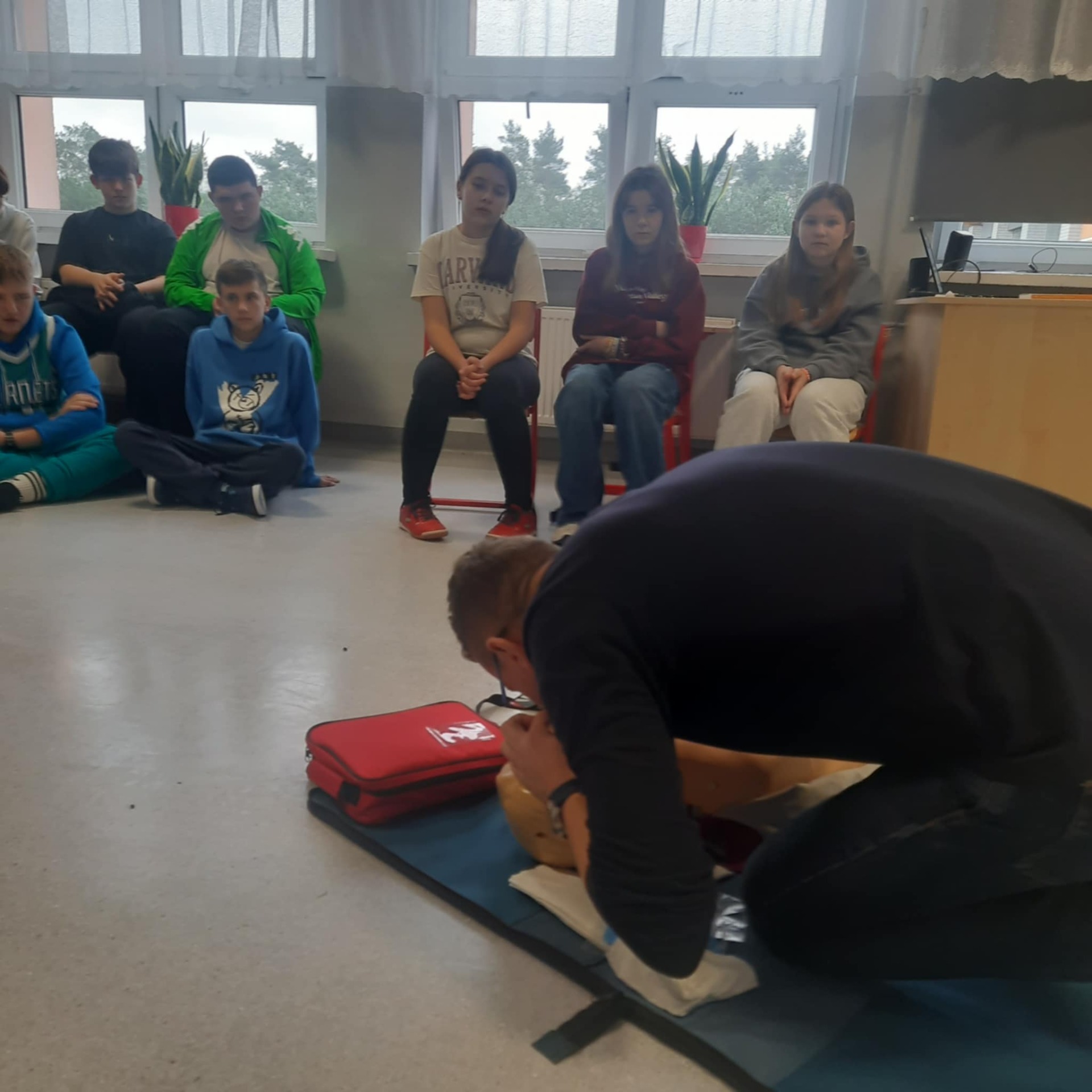 Dzisiaj, tj. 13.11.2024r uczniowie klas 7 i 8 uczestniczyli w szkoleniu z pierwszej pomocy przedmedycznej, które przeprowadzili pan Tomasz Wosiak specjalista ds. pierwszej pomocy oraz Urszula Szczepaniak koordynatorka projektu „Pierwsza pomoc dla bezpieczeństwa najmłodszych” z Fundacji „Nie rób dymu”.