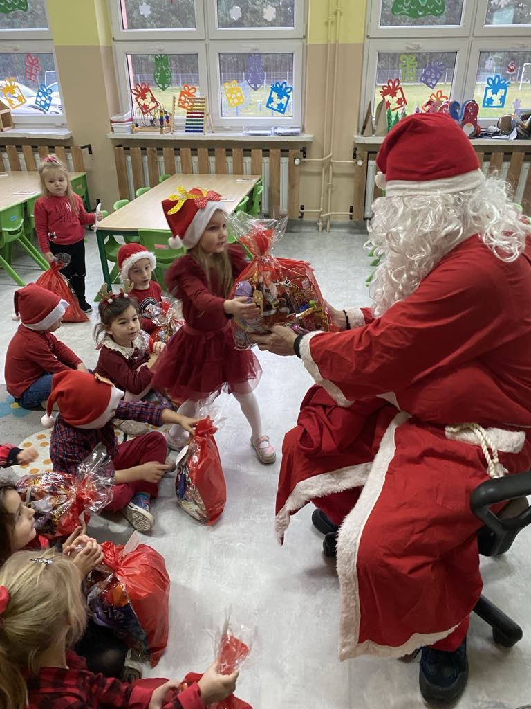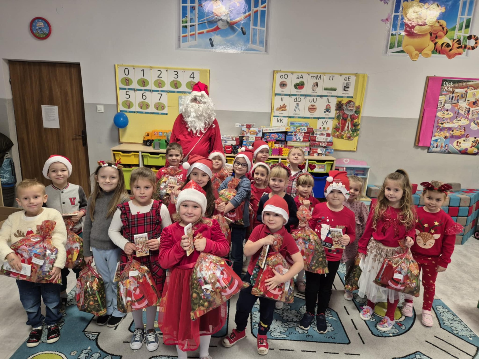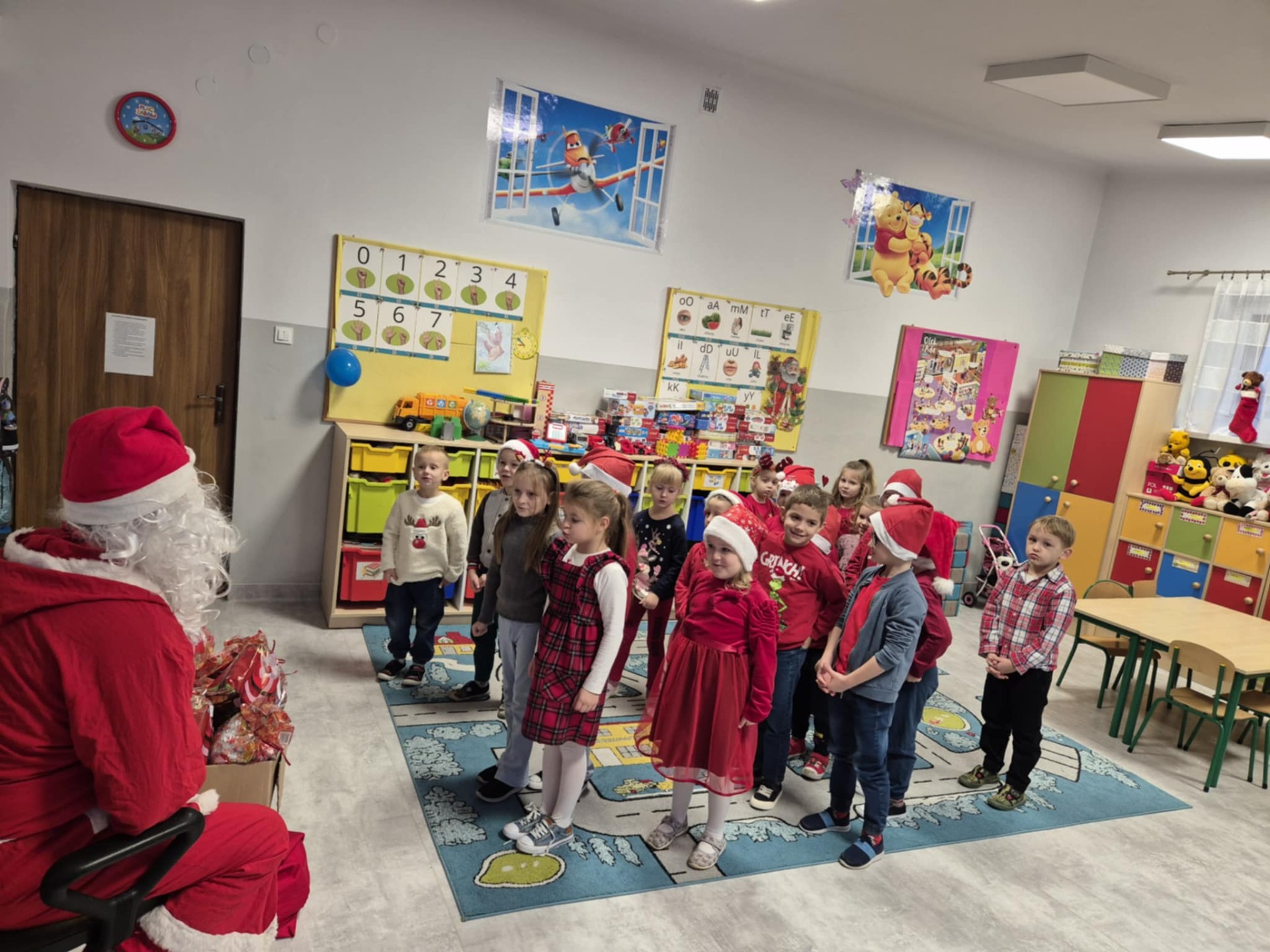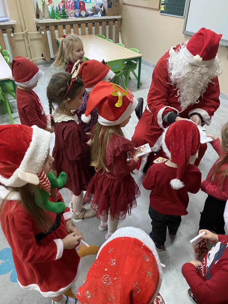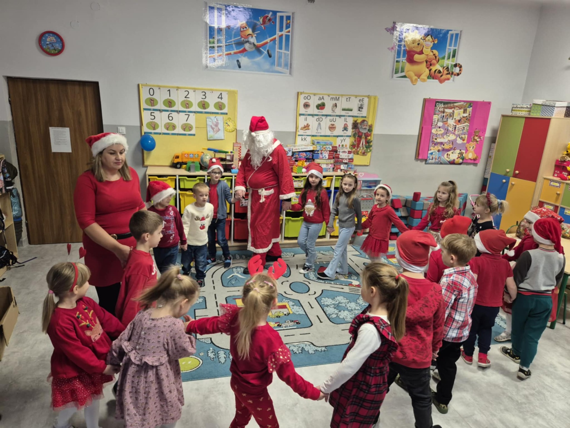 Wizyta Świętego Mikołaja w oddziałach przedszkolnych była pełna radości. Dzieci ucieszyły się na jego przybycie, wspólnie śpiewając wesołe piosenki, a także tańcząc razem z Mikołajem. Na zakończenie tej wspaniałej uroczystości maluchy otrzymały prezenty, które wywołały uśmiechy na ich twarzach i sprawiły, że ten dzień na długo pozostanie w ich pamięci.