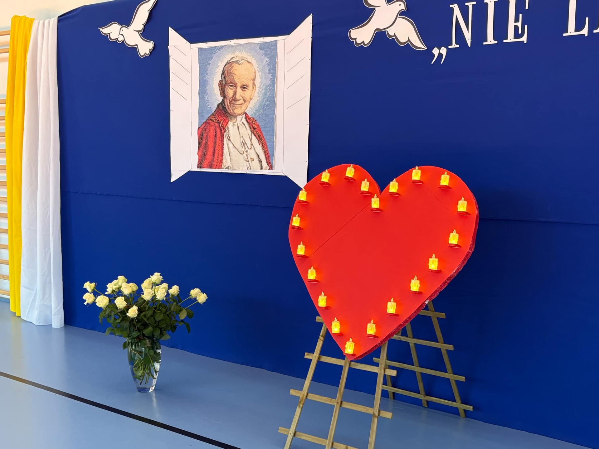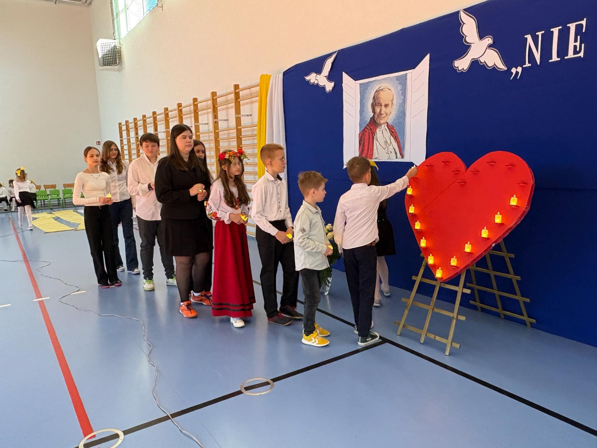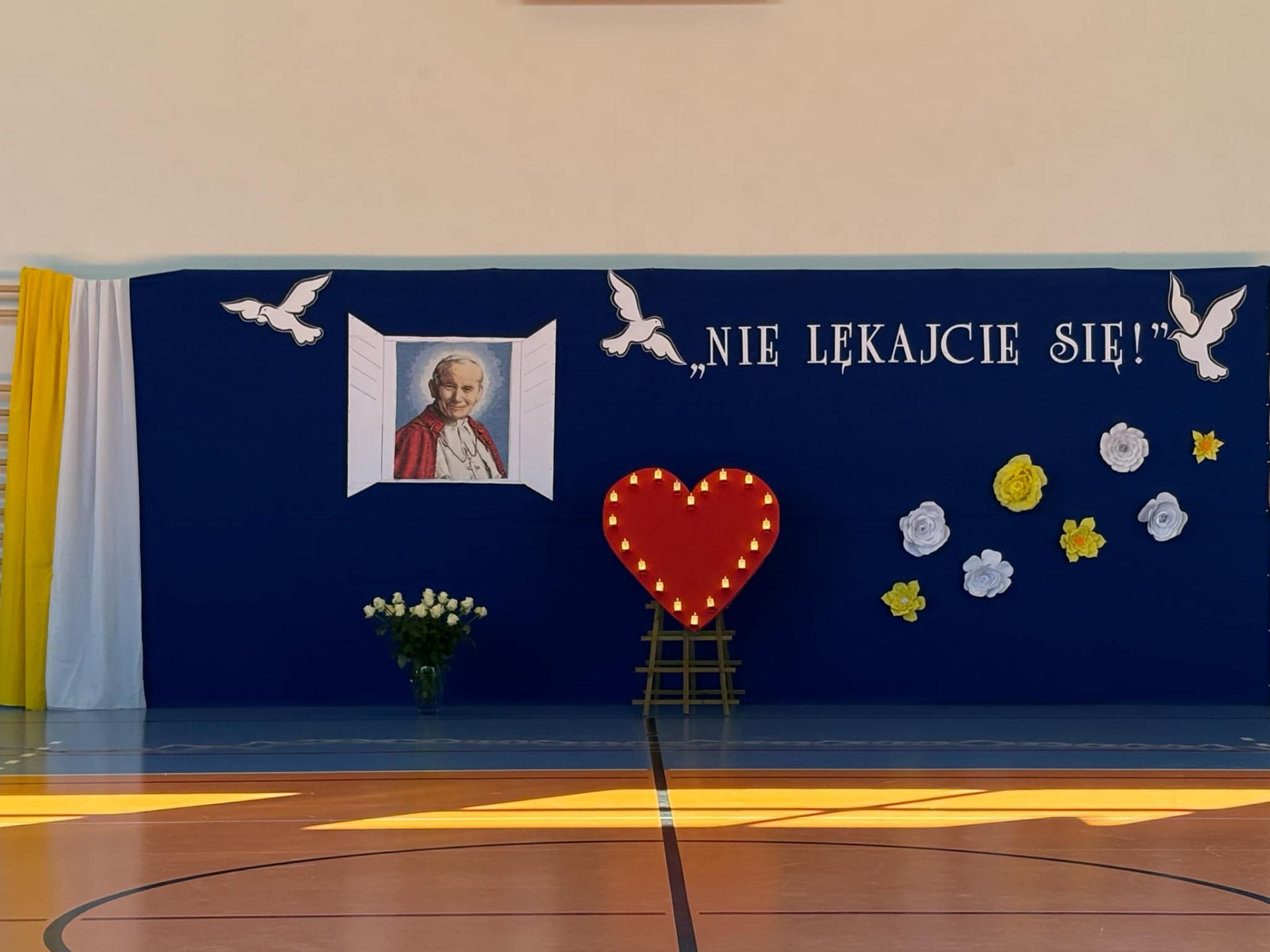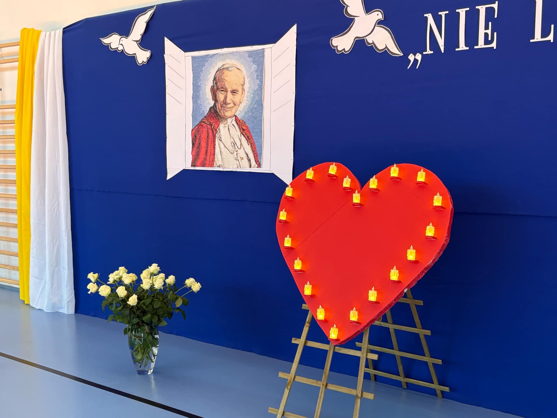 3 kwietnia w naszej szkole odbyła się uroczysta akademia z okazji 20. rocznicy śmierci patrona, Jana Pawła II, pod hasłem „Nie lękajcie się”. Słowa te zachęcają młodych ludzi do pokonywania trudności, wiary we własne możliwości i podejmowania wyzwań. Uczniowie wspólnie uczcili pamięć Papieża Polaka, przypominając jego nauki i wartości, które przekazywał światu. W programie artystycznym wykonano piosenki i wiersze upamiętniające naszego wielkiego rodaka. Uroczystość uświetnił również wzruszający taniec uczniów klasy pierwszej, będący hołdem dla naszego Patrona. Akademia była pełna refleksji i wdzięczności, przypominając wszystkim o sile wiary, nadziei i odwadze, które głosił Jan Paweł II. Dwadzieścia zapalonych świec i dwadzieścia białych róż niech będzie wyrazem naszej pamięci i oddania.