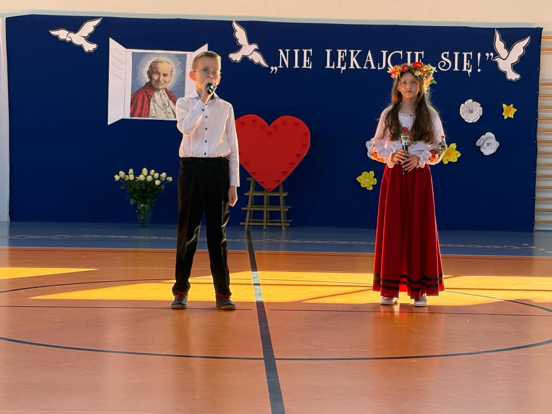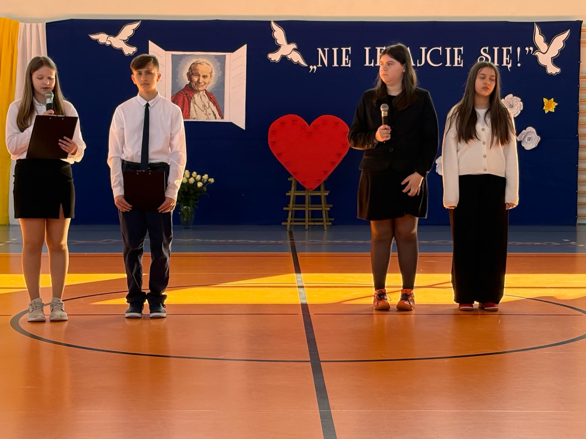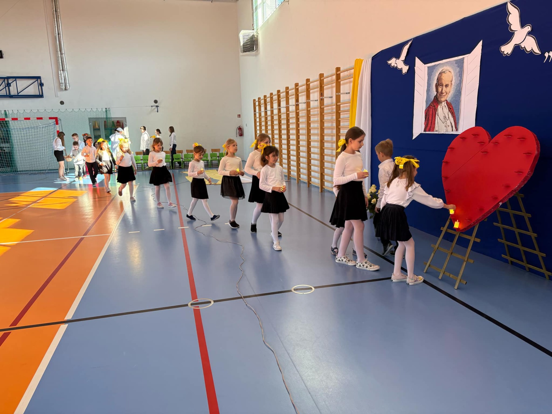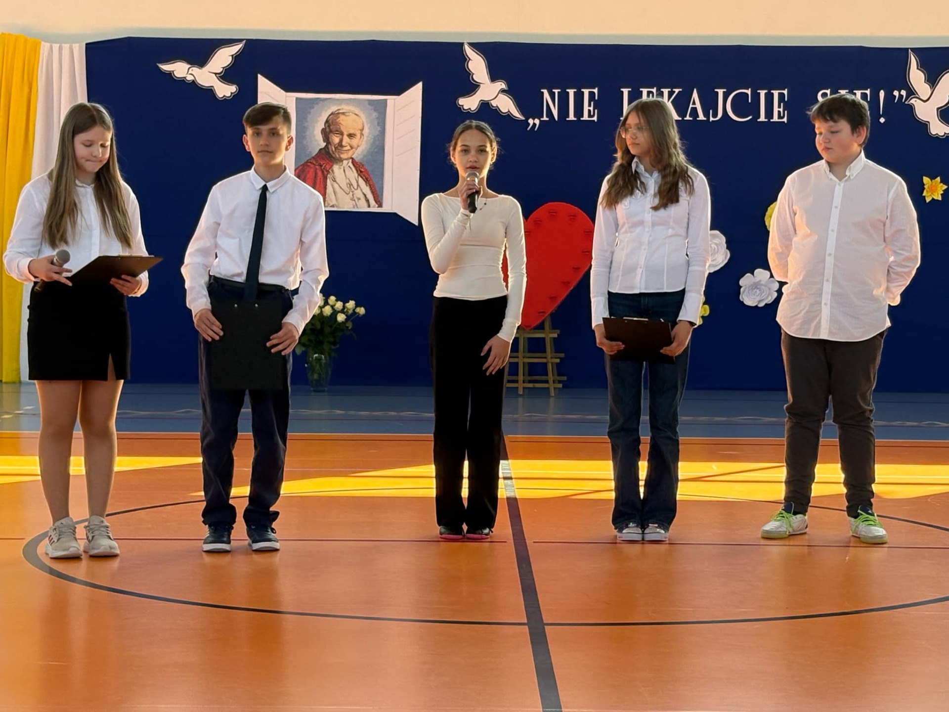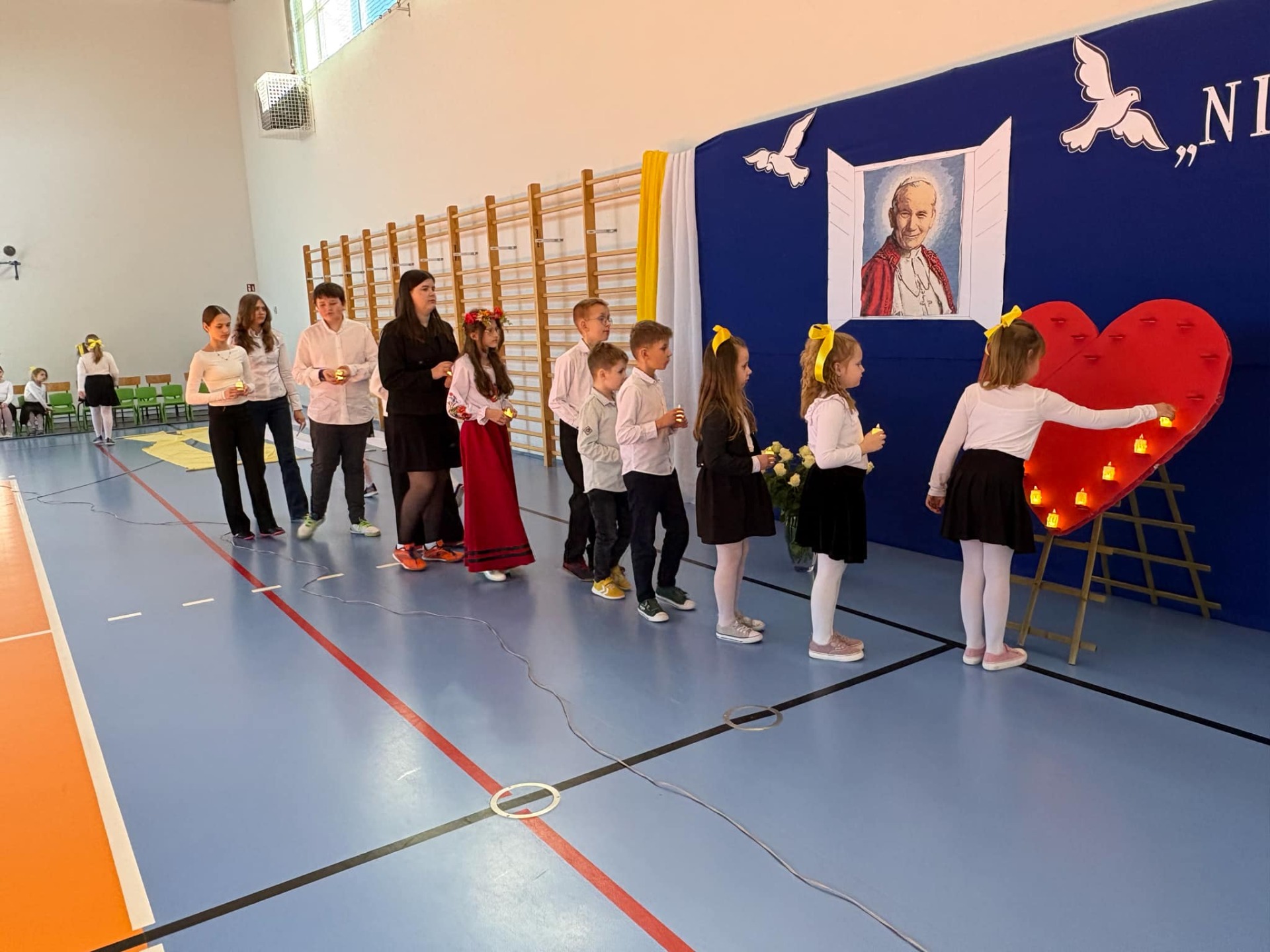 3 kwietnia w naszej szkole odbyła się uroczysta akademia z okazji 20. rocznicy śmierci patrona, Jana Pawła II, pod hasłem „Nie lękajcie się”. Słowa te zachęcają młodych ludzi do pokonywania trudności, wiary we własne możliwości i podejmowania wyzwań. Uczniowie wspólnie uczcili pamięć Papieża Polaka, przypominając jego nauki i wartości, które przekazywał światu. W programie artystycznym wykonano piosenki i wiersze upamiętniające naszego wielkiego rodaka. Uroczystość uświetnił również wzruszający taniec uczniów klasy pierwszej, będący hołdem dla naszego Patrona. Akademia była pełna refleksji i wdzięczności, przypominając wszystkim o sile wiary, nadziei i odwadze, które głosił Jan Paweł II. Dwadzieścia zapalonych świec i dwadzieścia białych róż niech będzie wyrazem naszej pamięci i oddania.