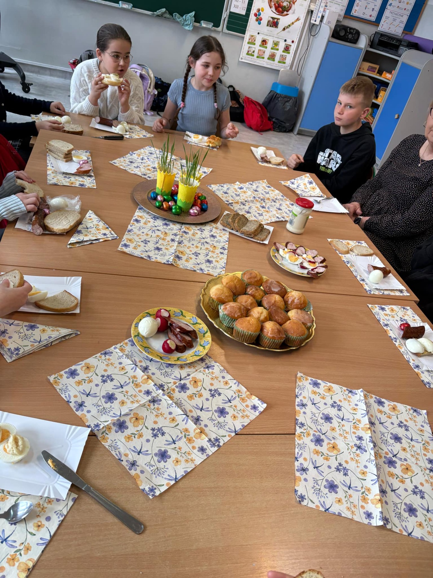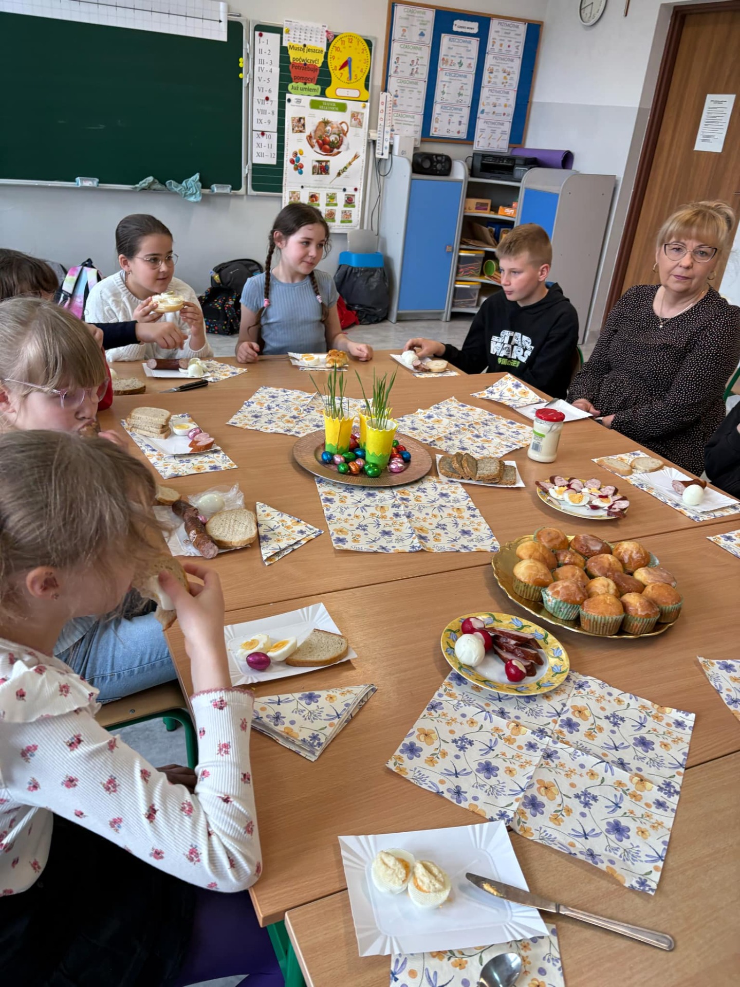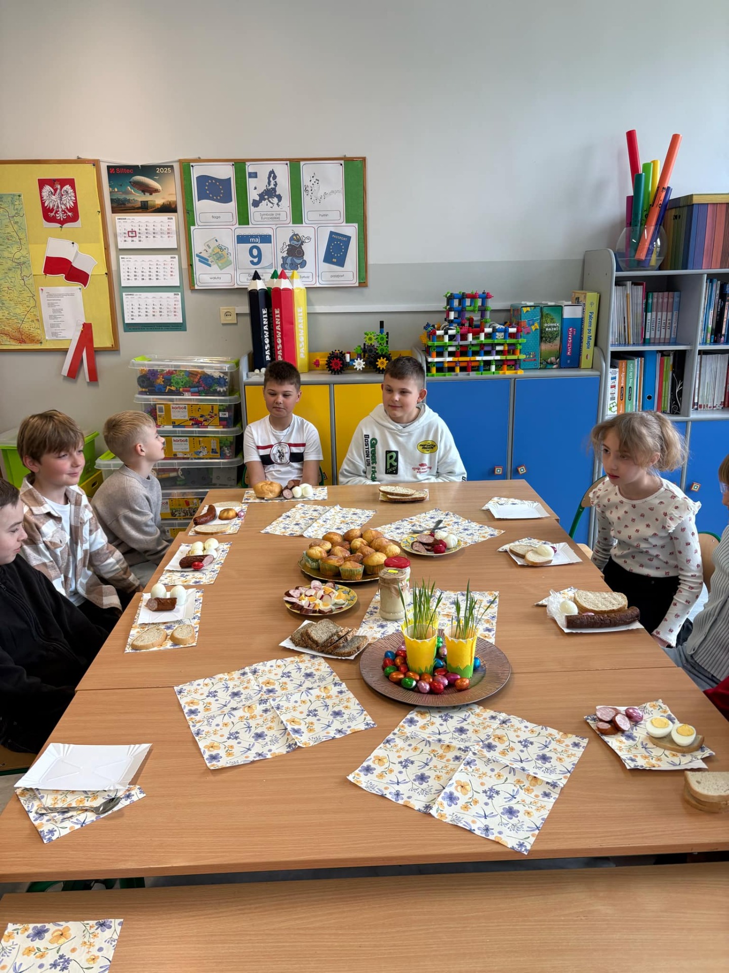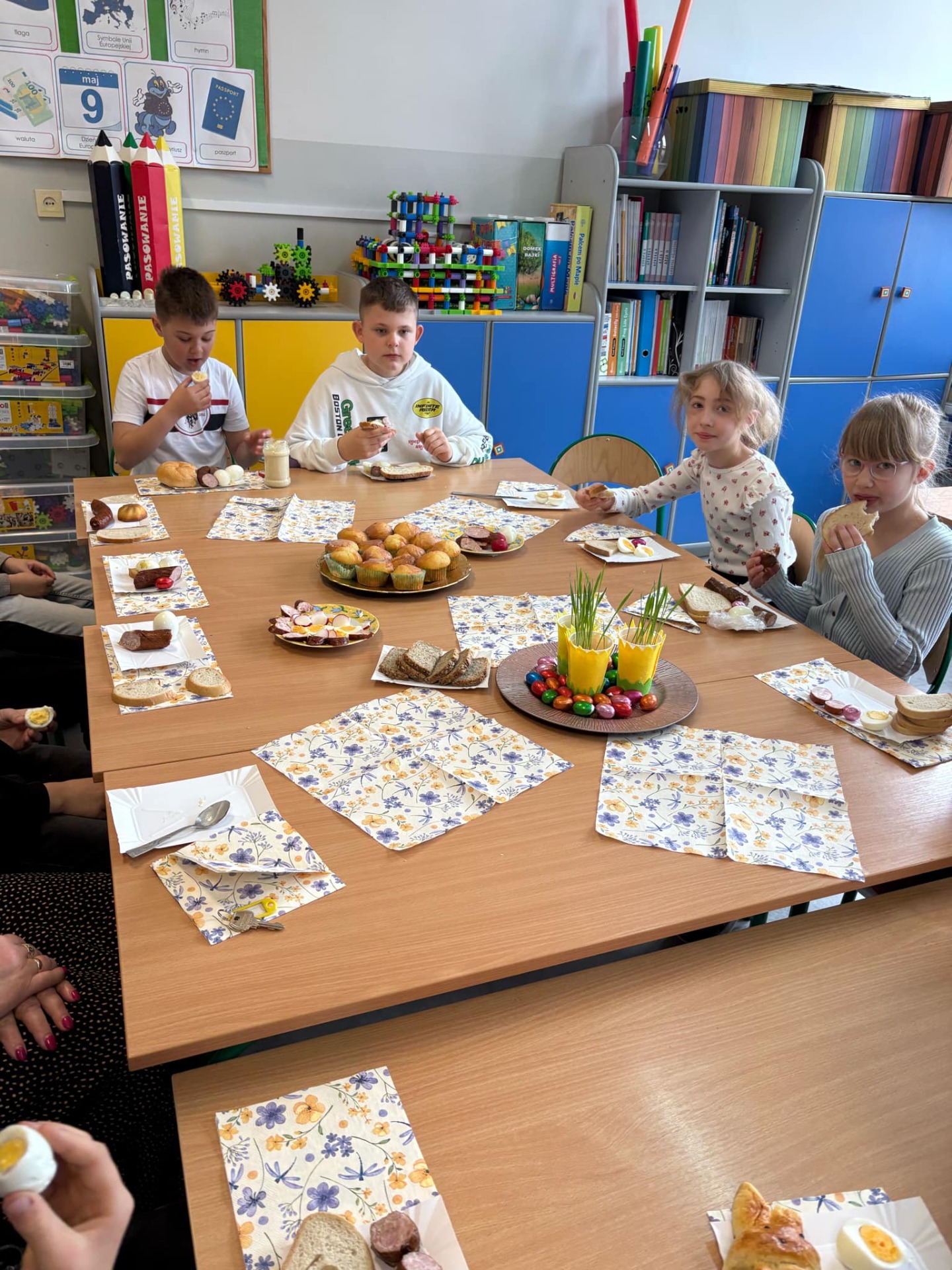 Chcąc poczuć atmosferę i nastrój zbliżających się świąt, uczniowie klasy III w ostatnim dniu nauki przed feriami świątecznymi, zorganizowali uroczyste śniadanie wielkanocne. Na stole pojawiły się jajka, kiełbasa, chleb, babeczki i czekoladowe jajeczka. Nie zabrakło również zielonego owsa symbolu wiosny i budzącej się do życia przyrody. Uczniowie z radością opowiadali o wielkanocnych zwyczajach, a potem dzielili się jajkiem i kosztowali przepysznych smakołyków. Nasze wielkanocne śniadanie zaszczyciła swoją obecnością pani dyrektor. Podczas zabaw na świeżym powietrzu zajączek schował czekoladowe jajeczka a dzieci szukały. To była świetna zabawa. Taka uroczystość to bardzo dobra integracja klasowa.