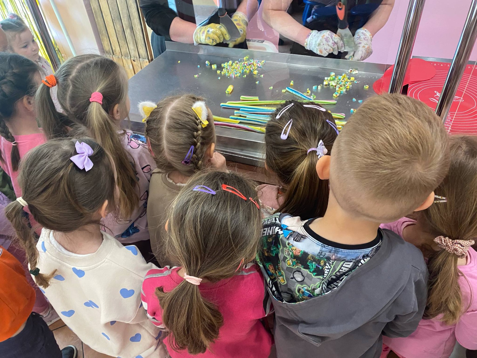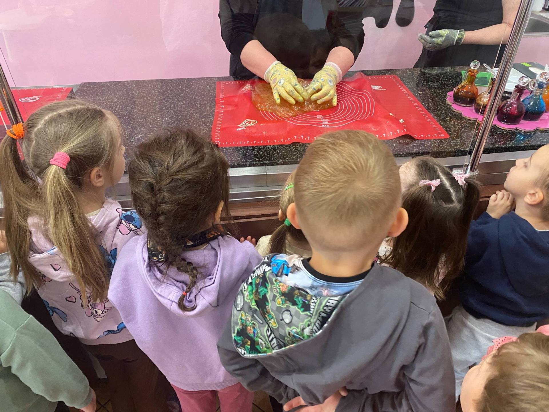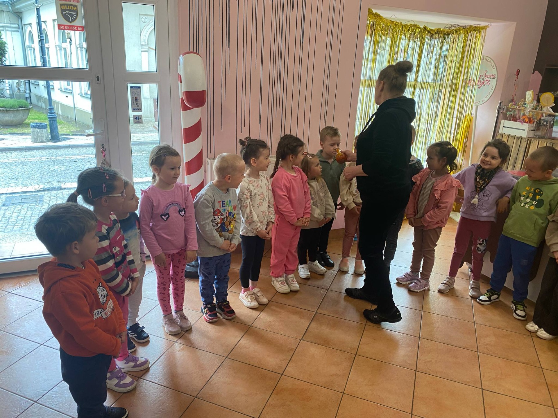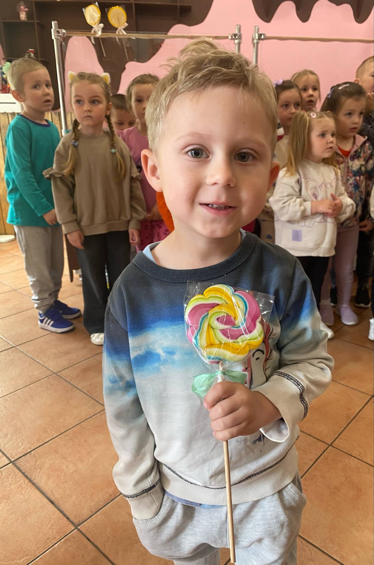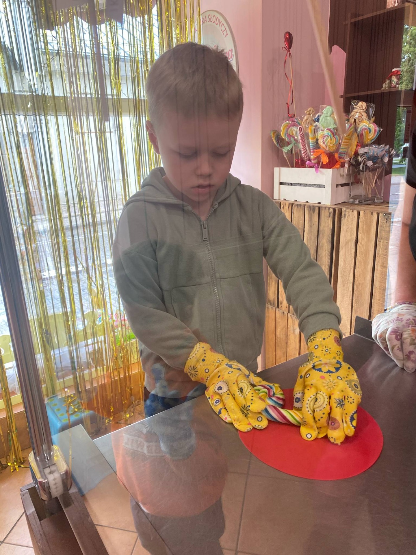 Grupa "Misie" miała okazję odwiedzić Manufakturę Słodyczy " Sama Słodycz" w Radomiu, gdzie dzieci uczestniczyły w pokazie ręcznego tworzenia kolorowych lizaków i cukierków. Obserwowały proces od wylania gorącego karmelu na stół, przez dodanie naturalnych barwników, aż po formowanie słodkości. Każde dziecko samodzielnie wykonało własnego lizaka, co sprawiło im ogromną radość.