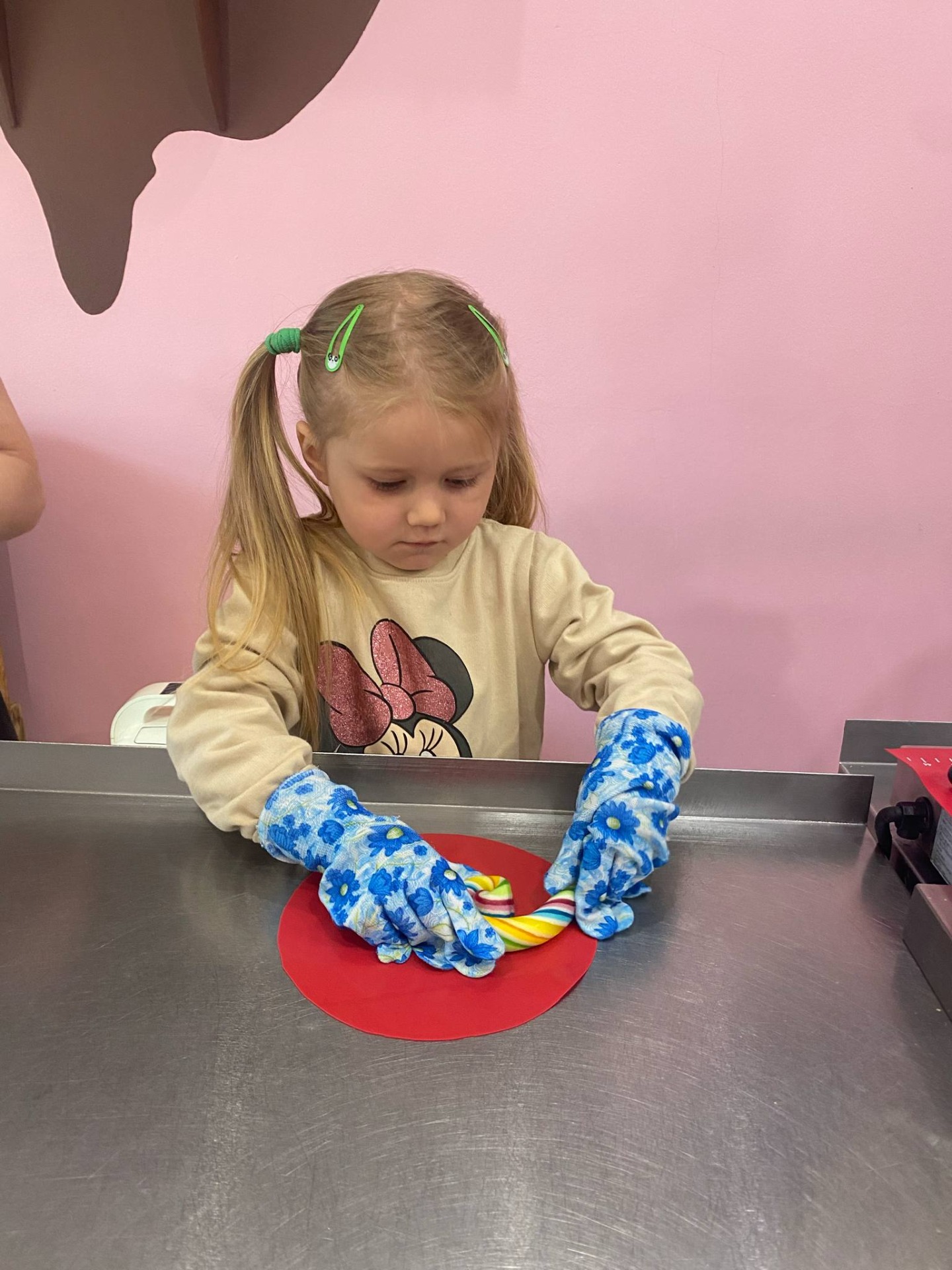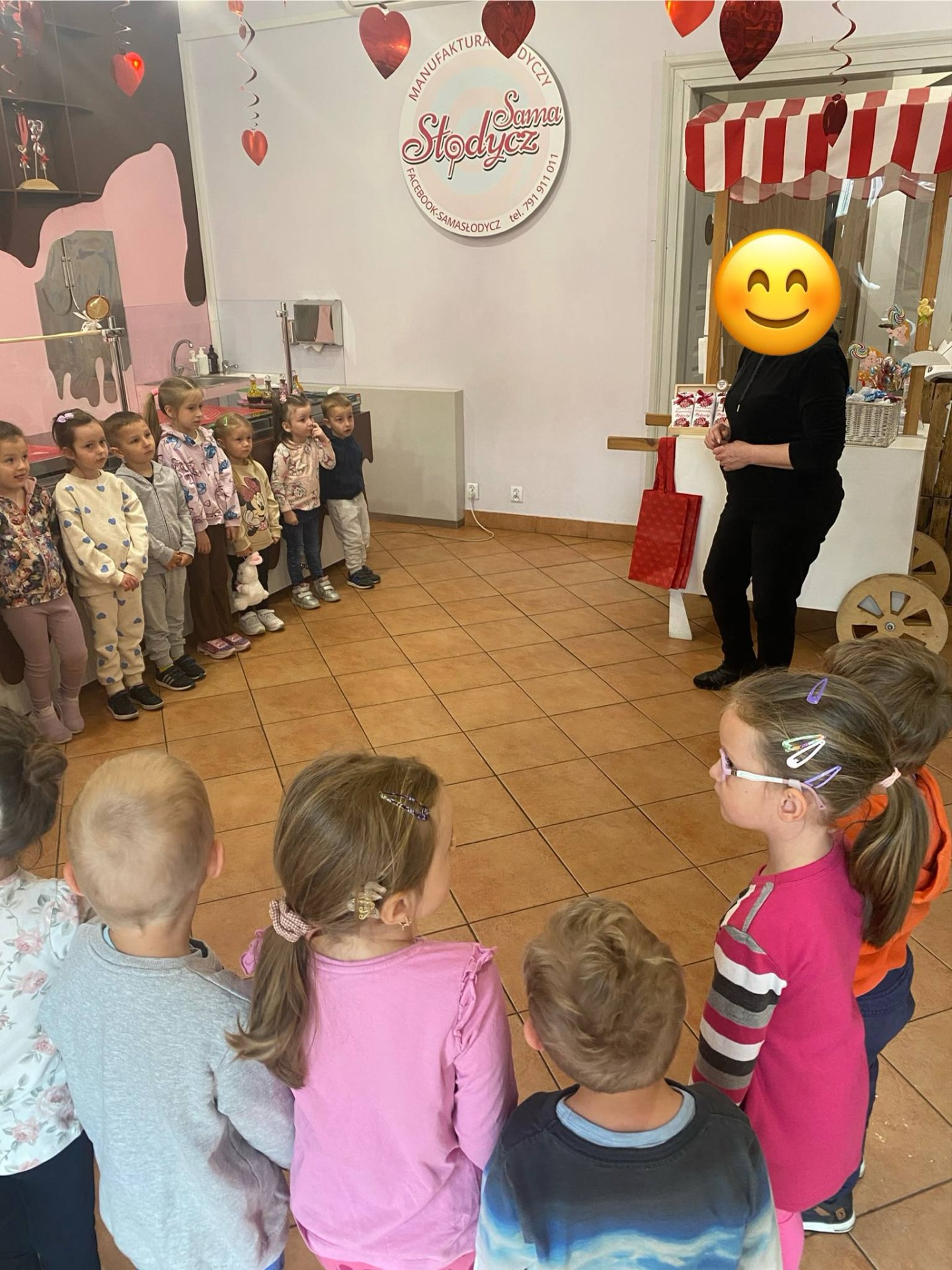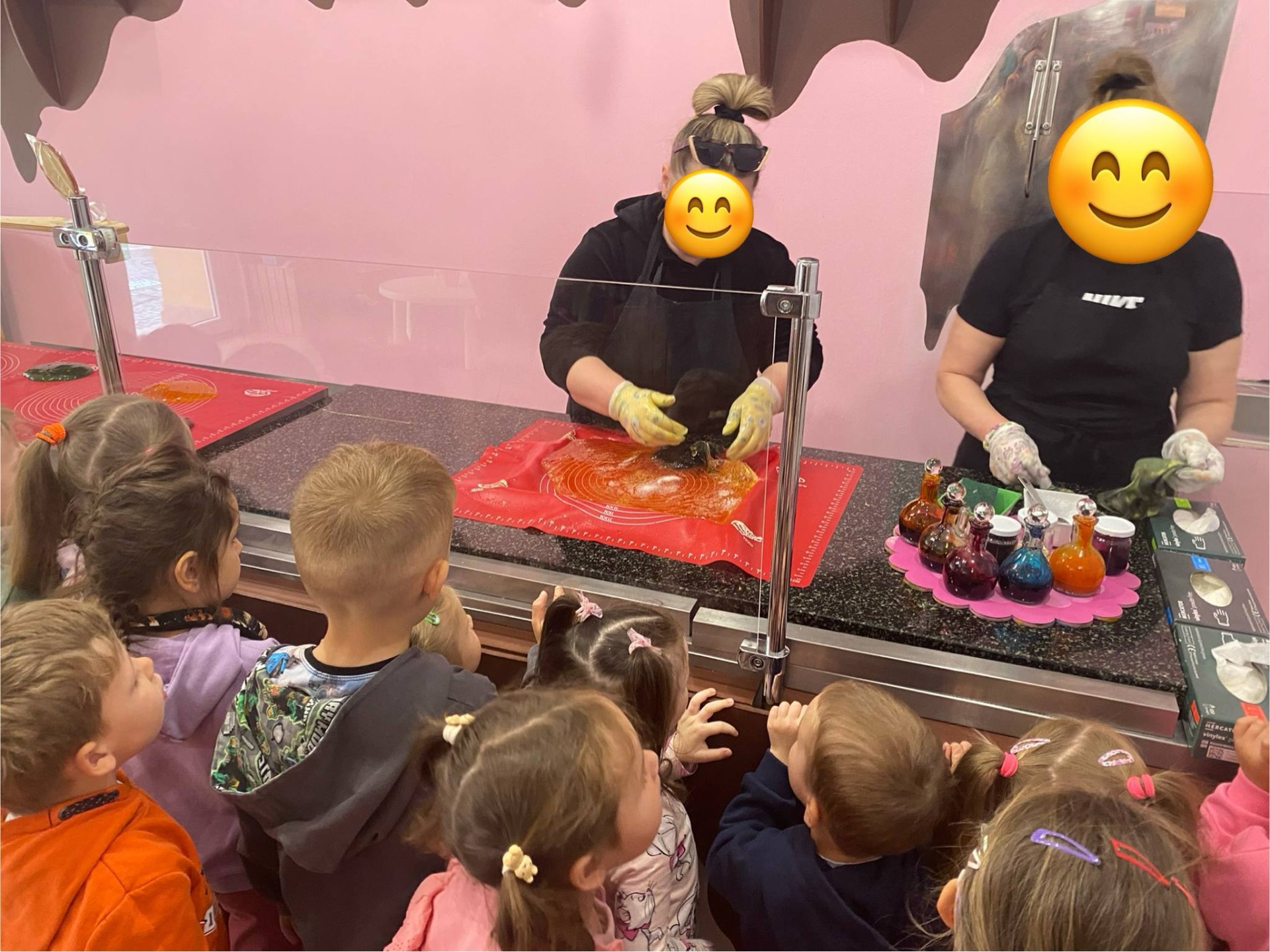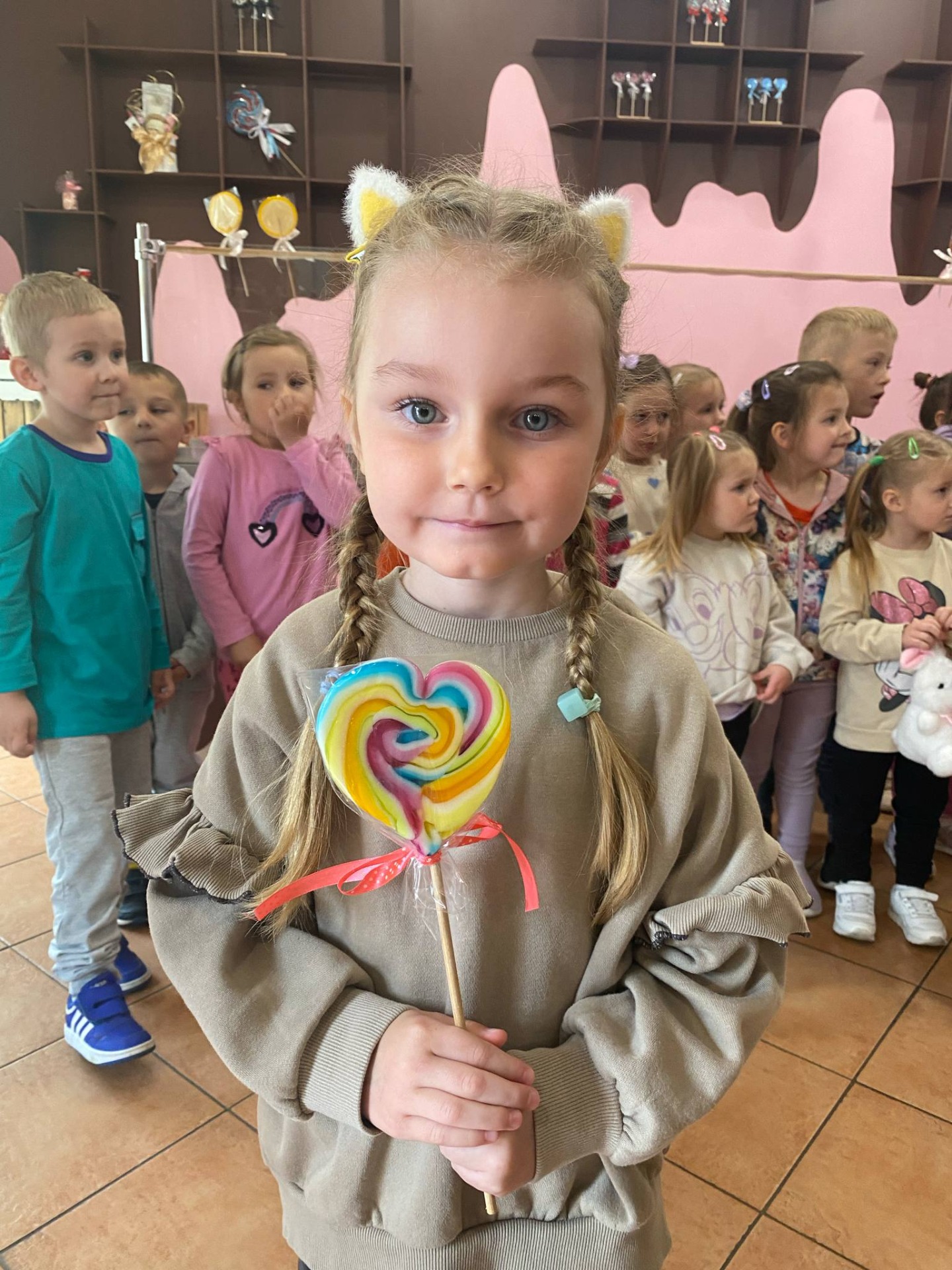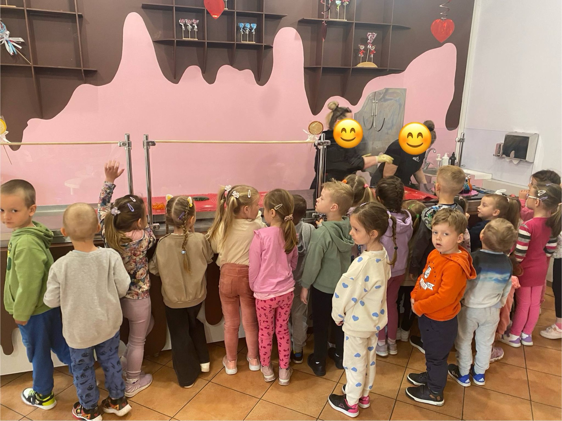 Grupa "Misie" miała okazję odwiedzić Manufakturę Słodyczy " Sama Słodycz" w Radomiu, gdzie dzieci uczestniczyły w pokazie ręcznego tworzenia kolorowych lizaków i cukierków. Obserwowały proces od wylania gorącego karmelu na stół, przez dodanie naturalnych barwników, aż po formowanie słodkości. Każde dziecko samodzielnie wykonało własnego lizaka, co sprawiło im ogromną radość.