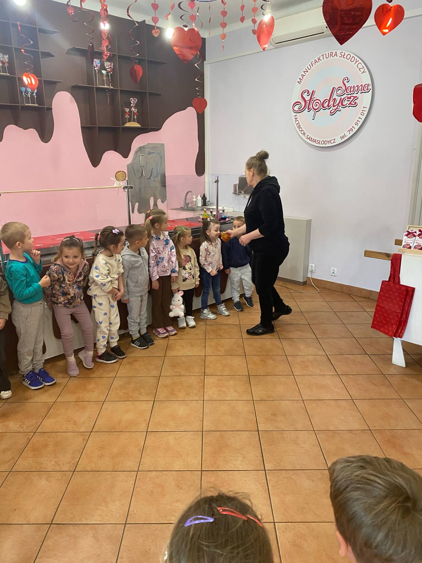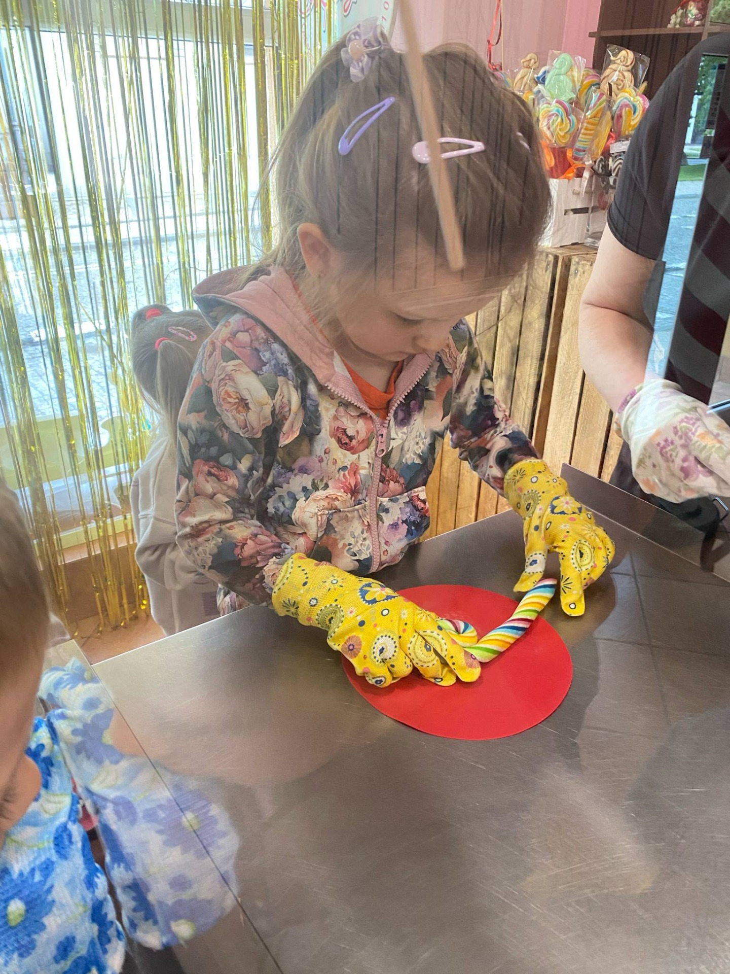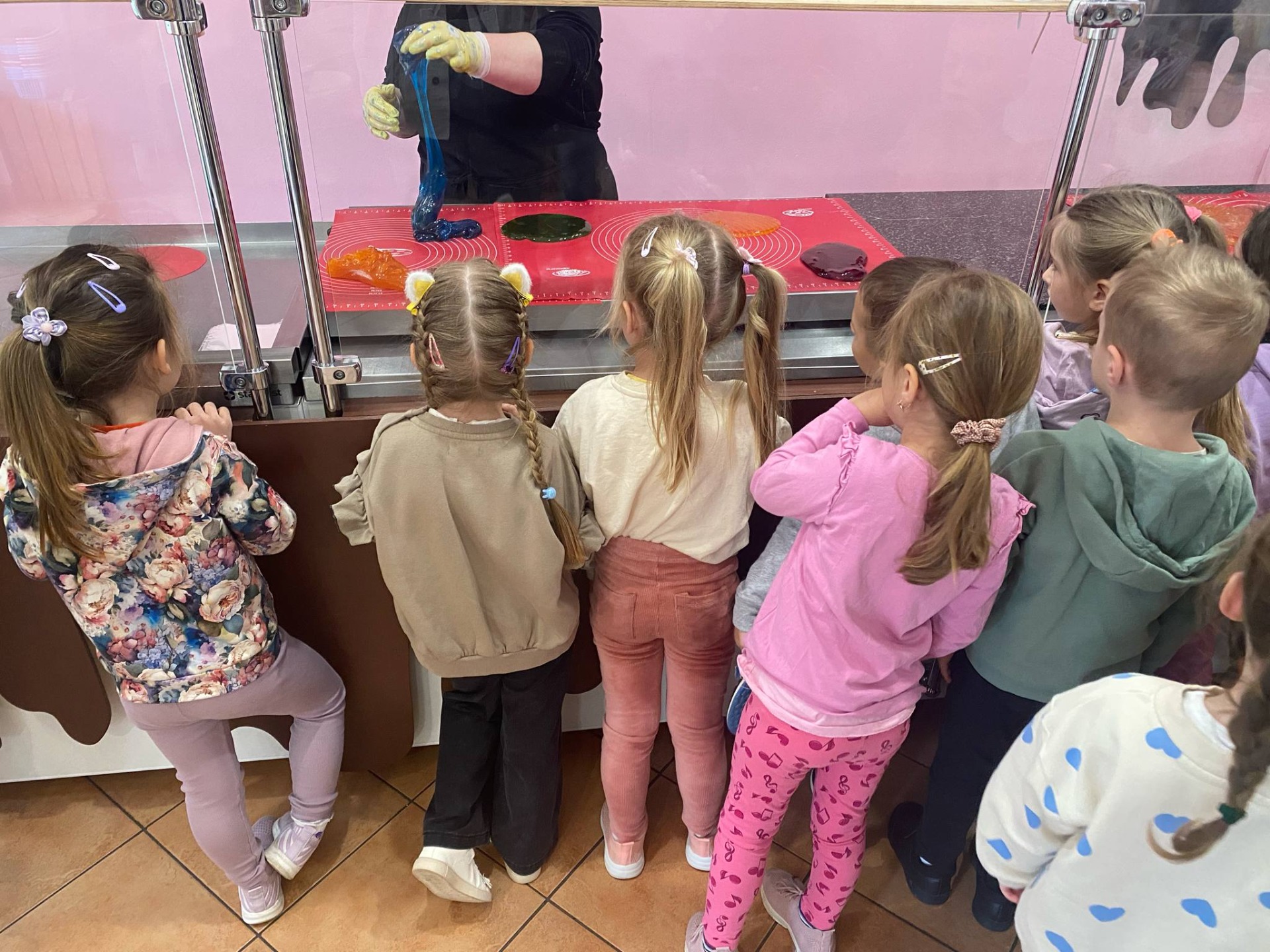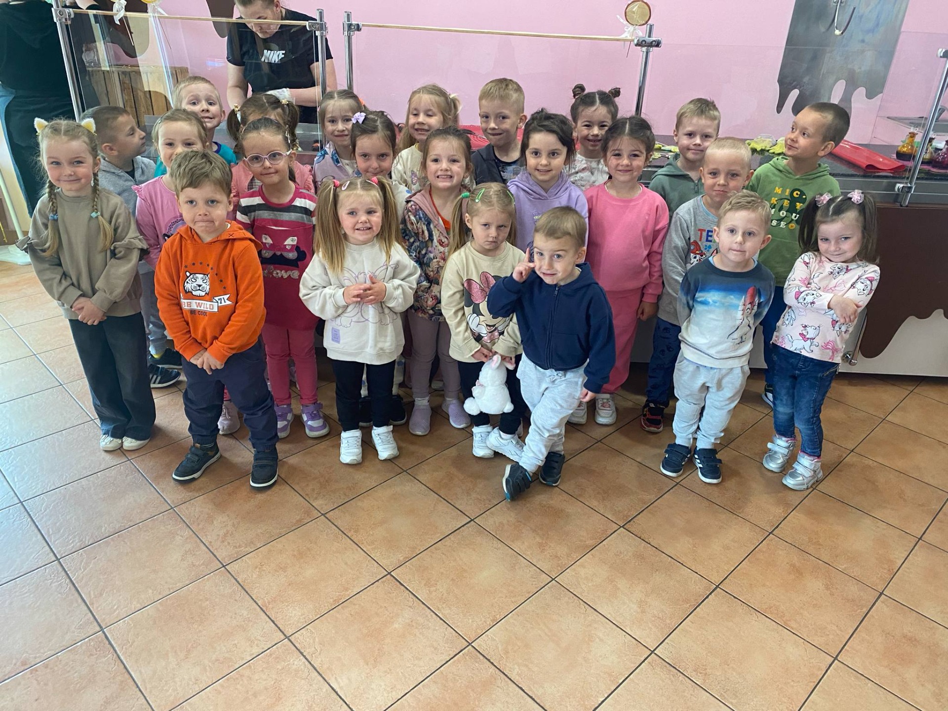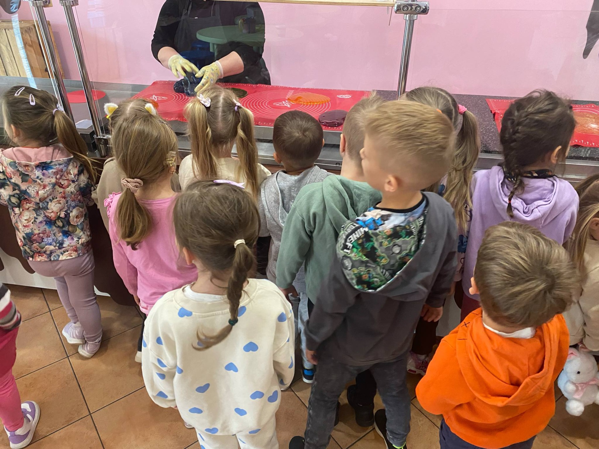 Grupa "Misie" miała okazję odwiedzić Manufakturę Słodyczy " Sama Słodycz" w Radomiu, gdzie dzieci uczestniczyły w pokazie ręcznego tworzenia kolorowych lizaków i cukierków. Obserwowały proces od wylania gorącego karmelu na stół, przez dodanie naturalnych barwników, aż po formowanie słodkości. Każde dziecko samodzielnie wykonało własnego lizaka, co sprawiło im ogromną radość.
