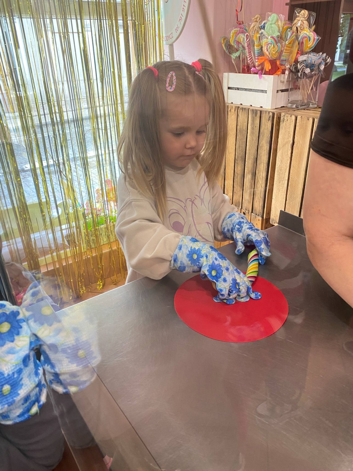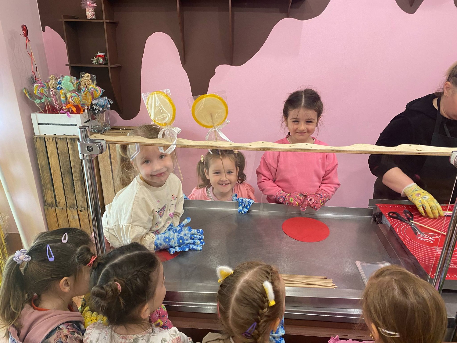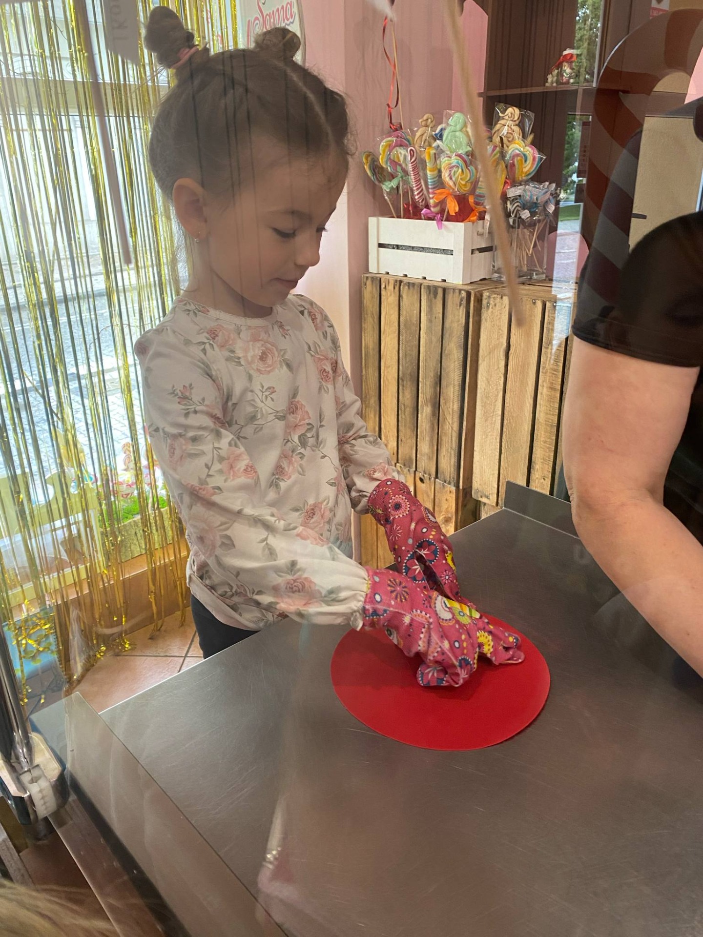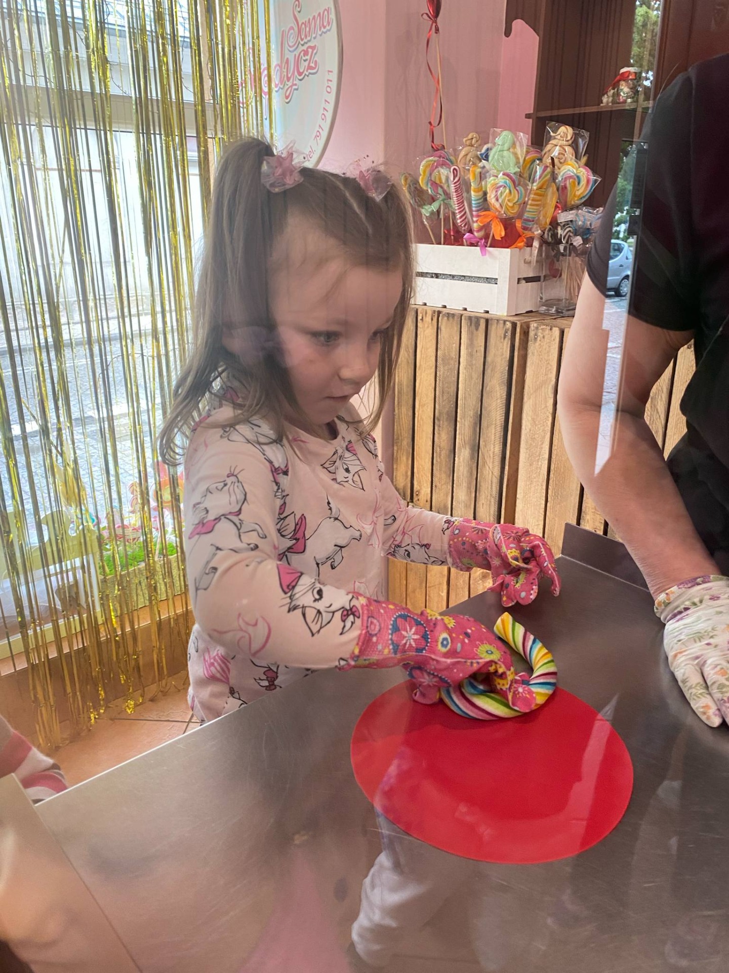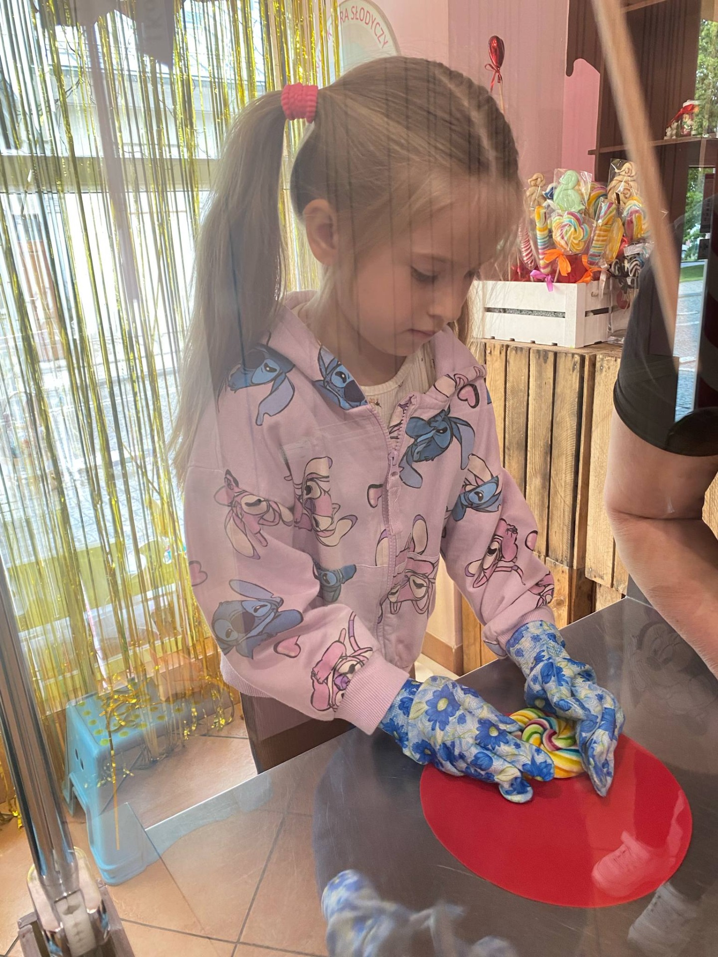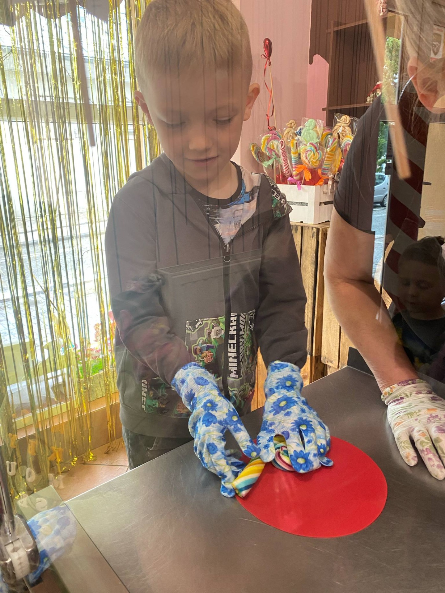 Grupa "Misie" miała okazję odwiedzić Manufakturę Słodyczy " Sama Słodycz" w Radomiu, gdzie dzieci uczestniczyły w pokazie ręcznego tworzenia kolorowych lizaków i cukierków. Obserwowały proces od wylania gorącego karmelu na stół, przez dodanie naturalnych barwników, aż po formowanie słodkości. Każde dziecko samodzielnie wykonało własnego lizaka, co sprawiło im ogromną radość.