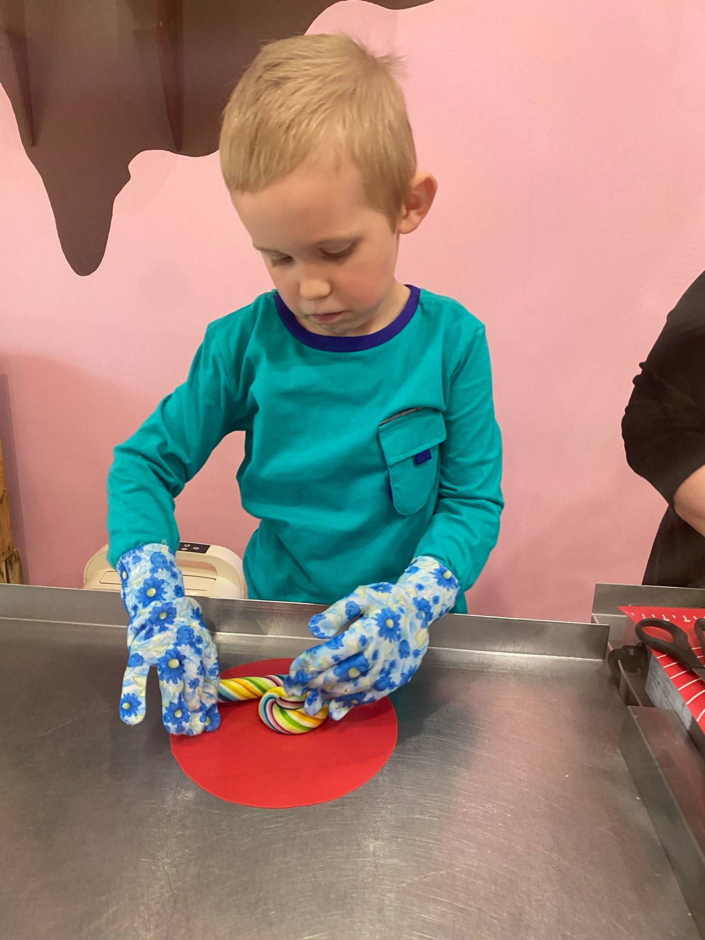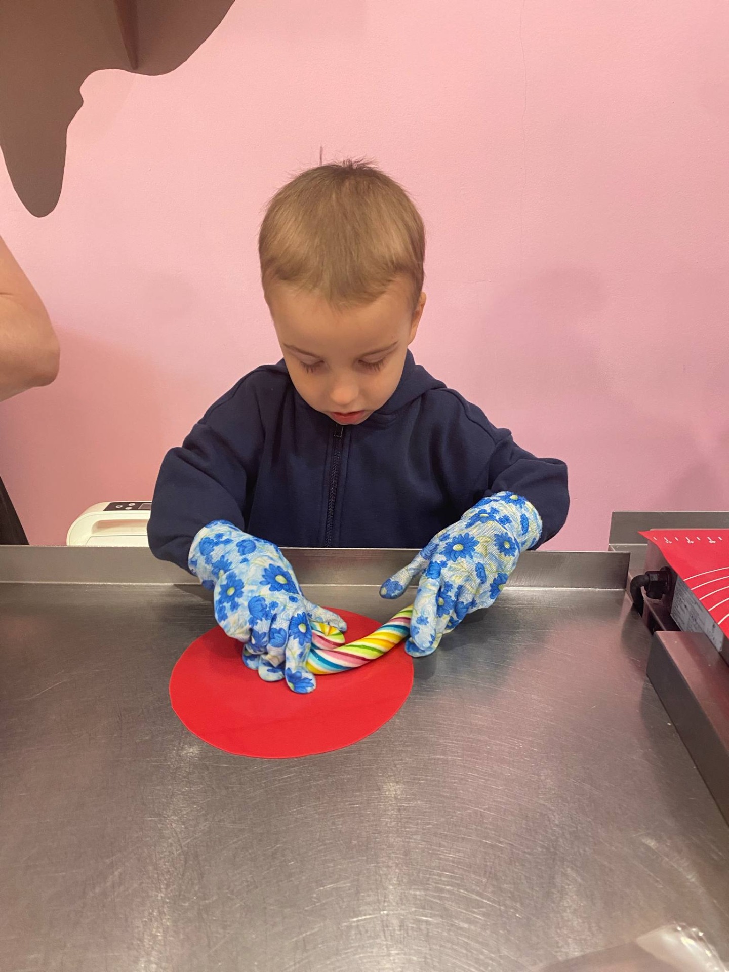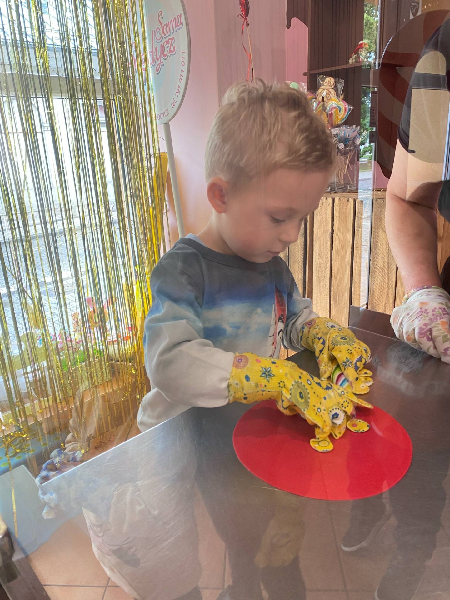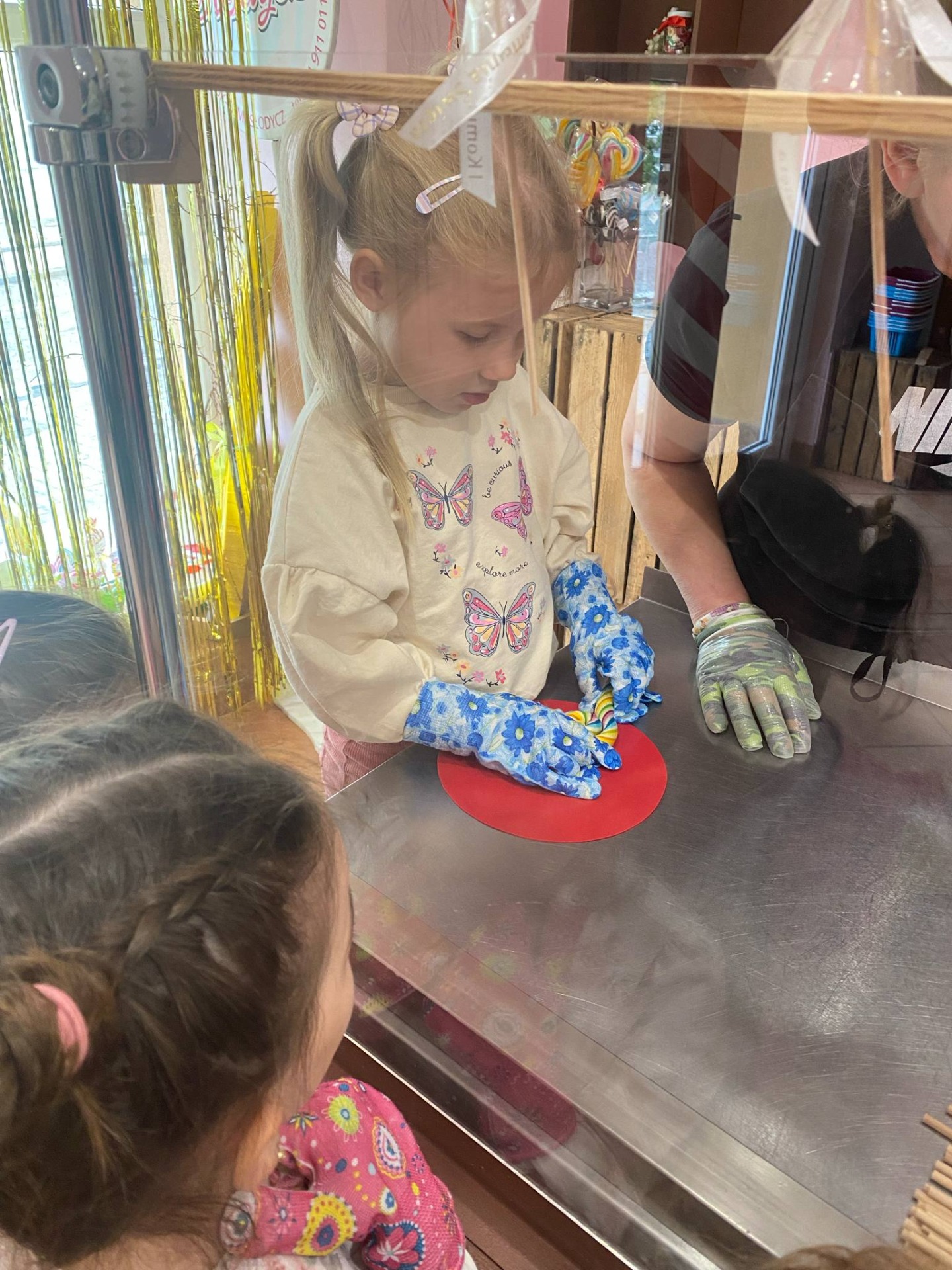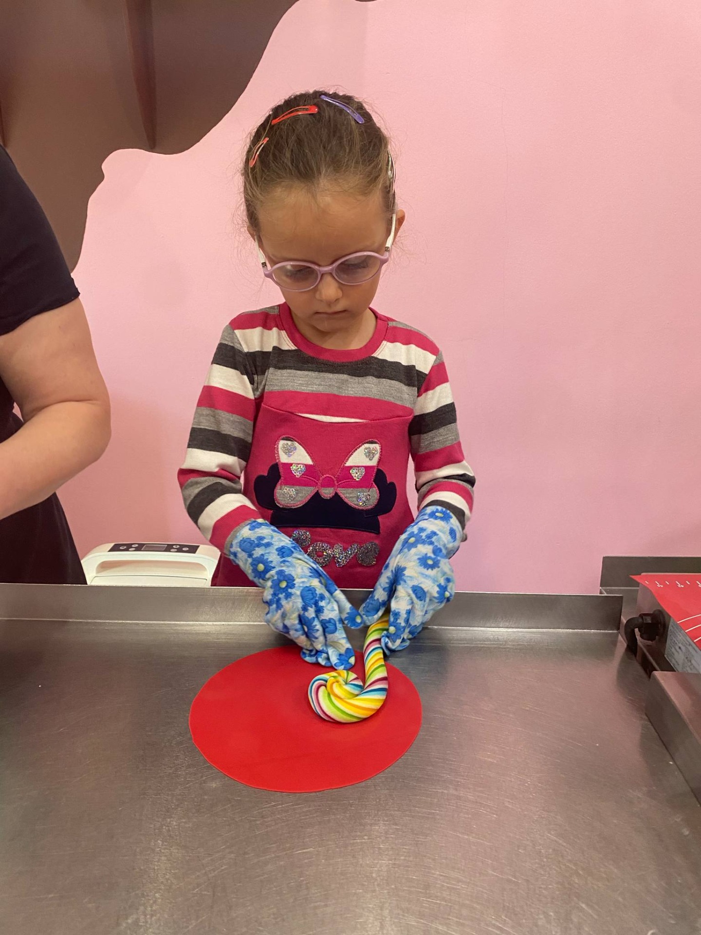 Grupa "Misie" miała okazję odwiedzić Manufakturę Słodyczy " Sama Słodycz" w Radomiu, gdzie dzieci uczestniczyły w pokazie ręcznego tworzenia kolorowych lizaków i cukierków. Obserwowały proces od wylania gorącego karmelu na stół, przez dodanie naturalnych barwników, aż po formowanie słodkości. Każde dziecko samodzielnie wykonało własnego lizaka, co sprawiło im ogromną radość.