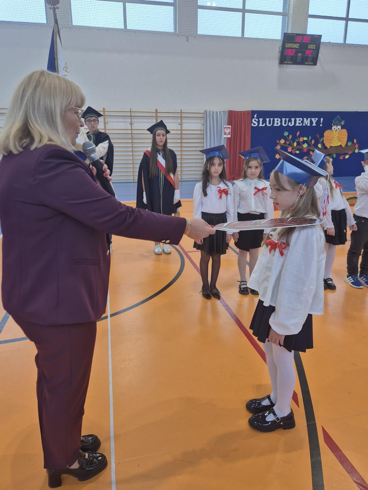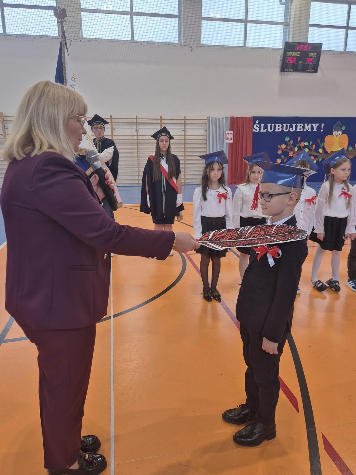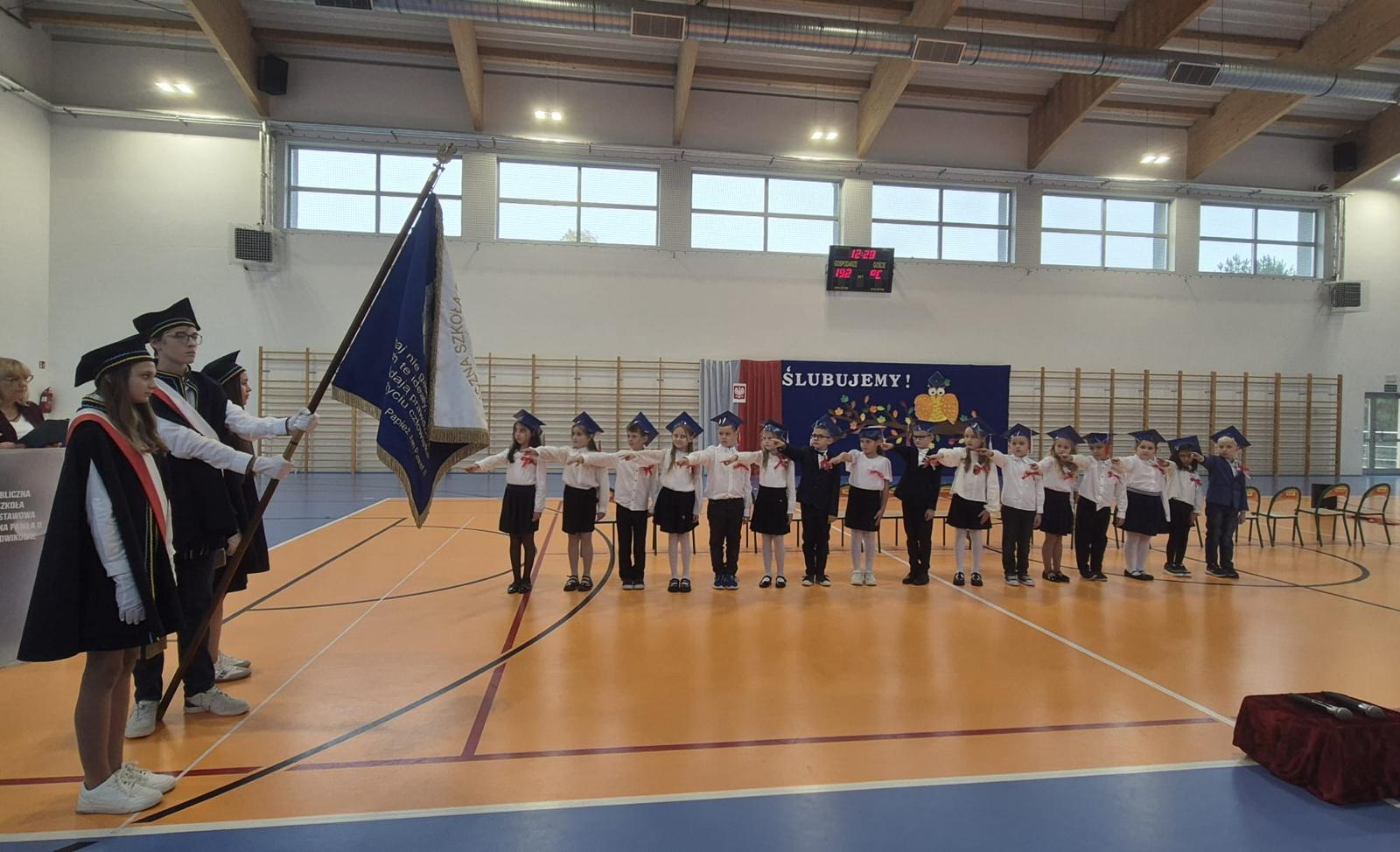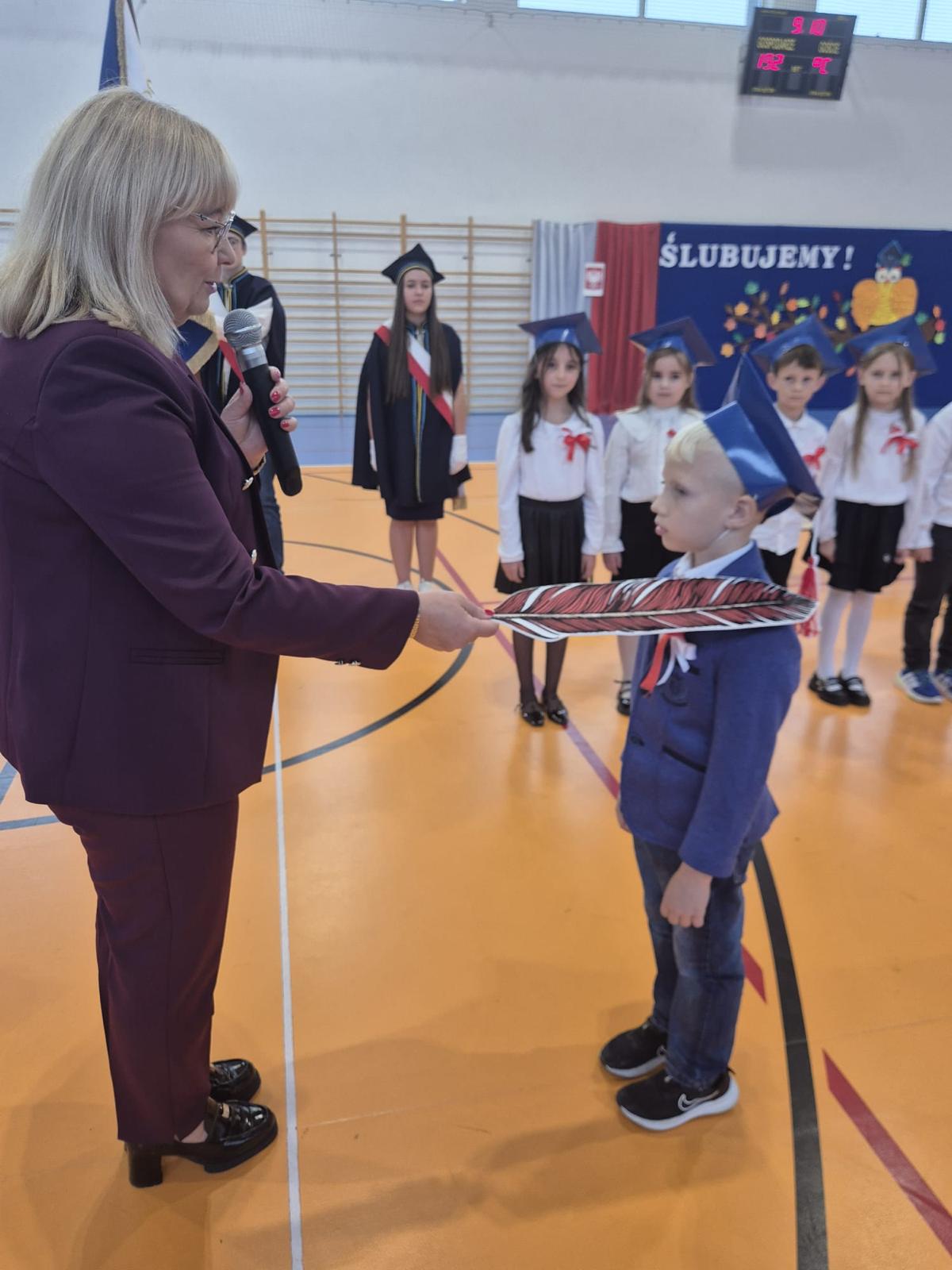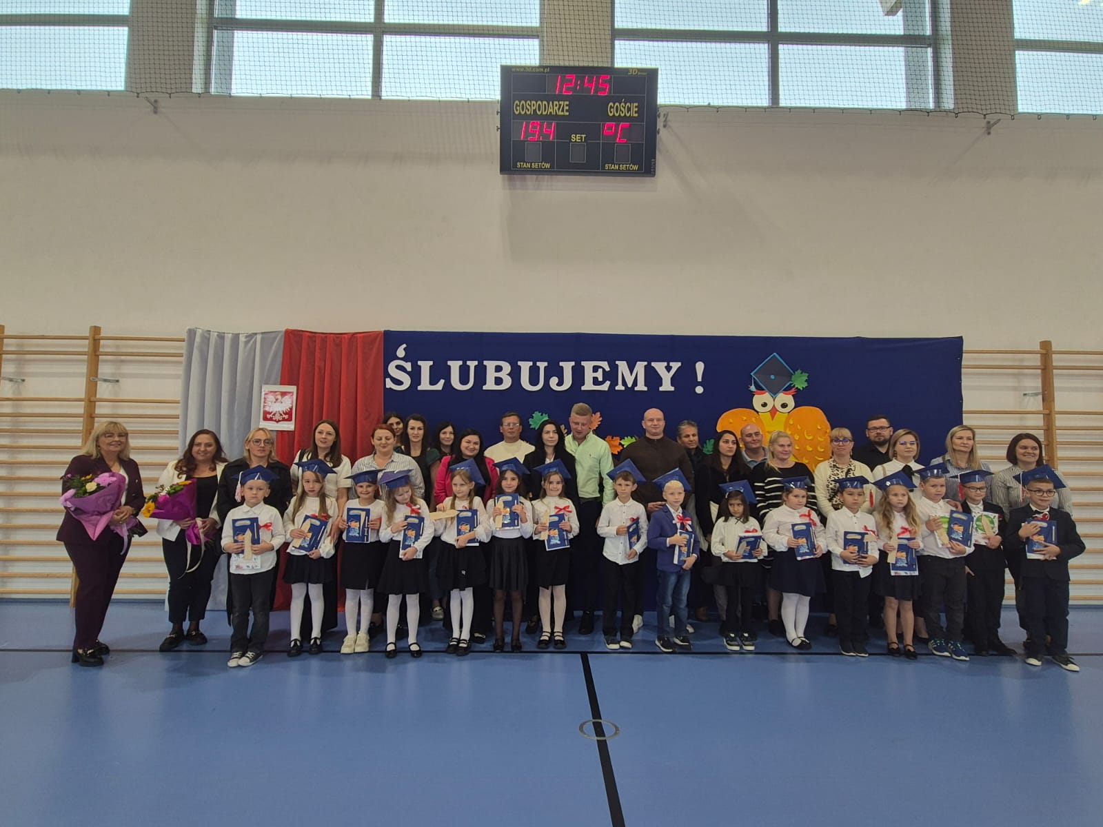 Najważniejszym momentem uroczystości było złożenie ślubowania na sztandar szkoły. Pierwszoklasiści przyrzekali być pilnymi uczniami, dobrymi kolegami i godnie reprezentować swoją szkołę. Po ślubowaniu odbyło się symboliczne pasowanie na ucznia, którego dokonała Pani Dyrektor, dotykając ramienia każdego dziecka piórem.
