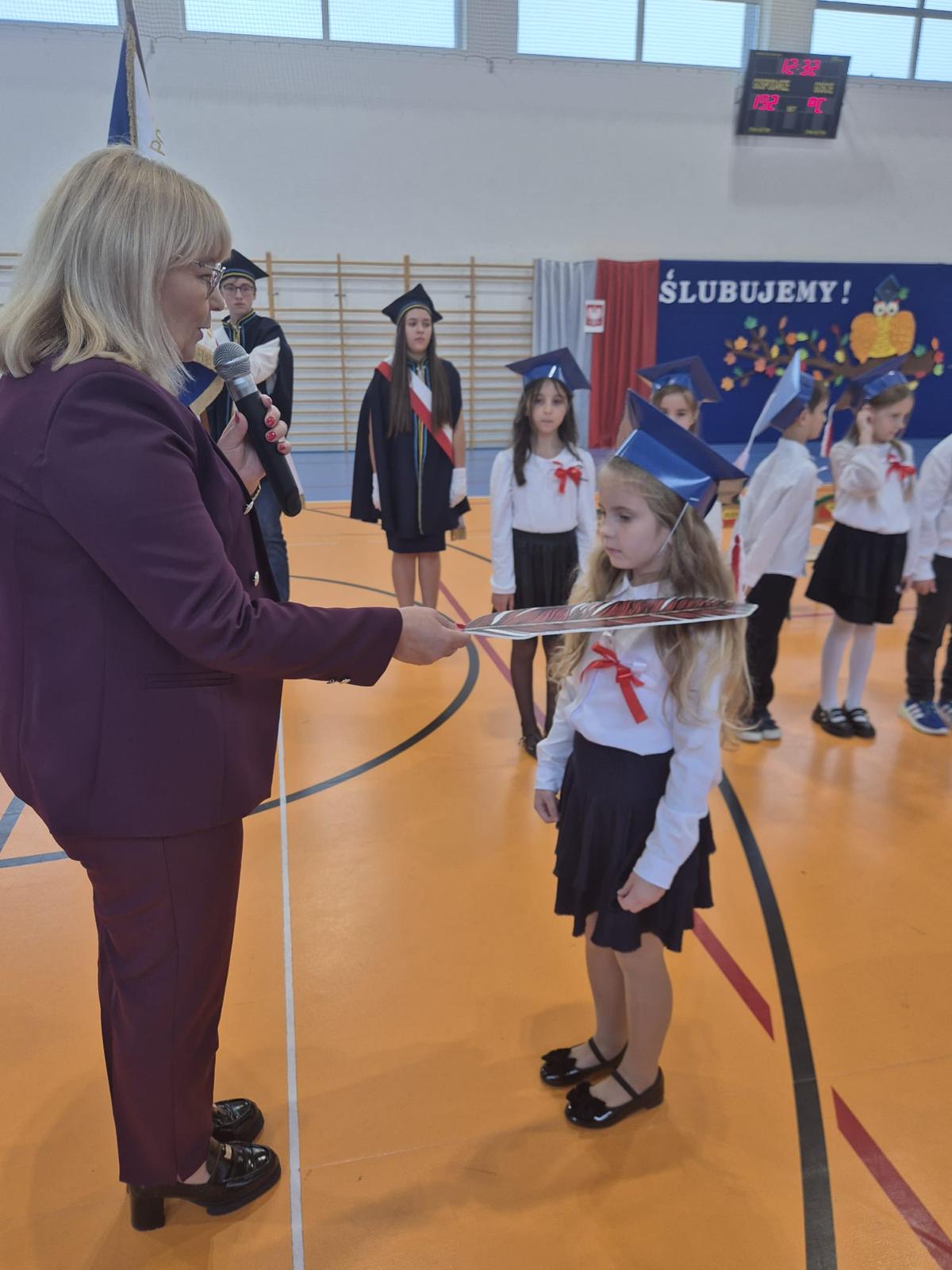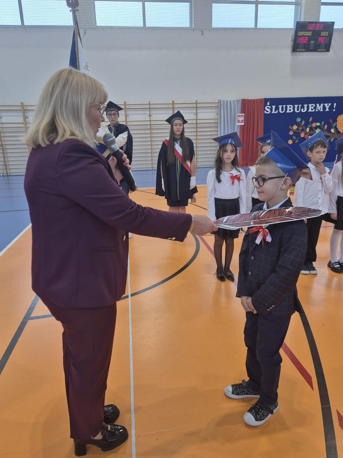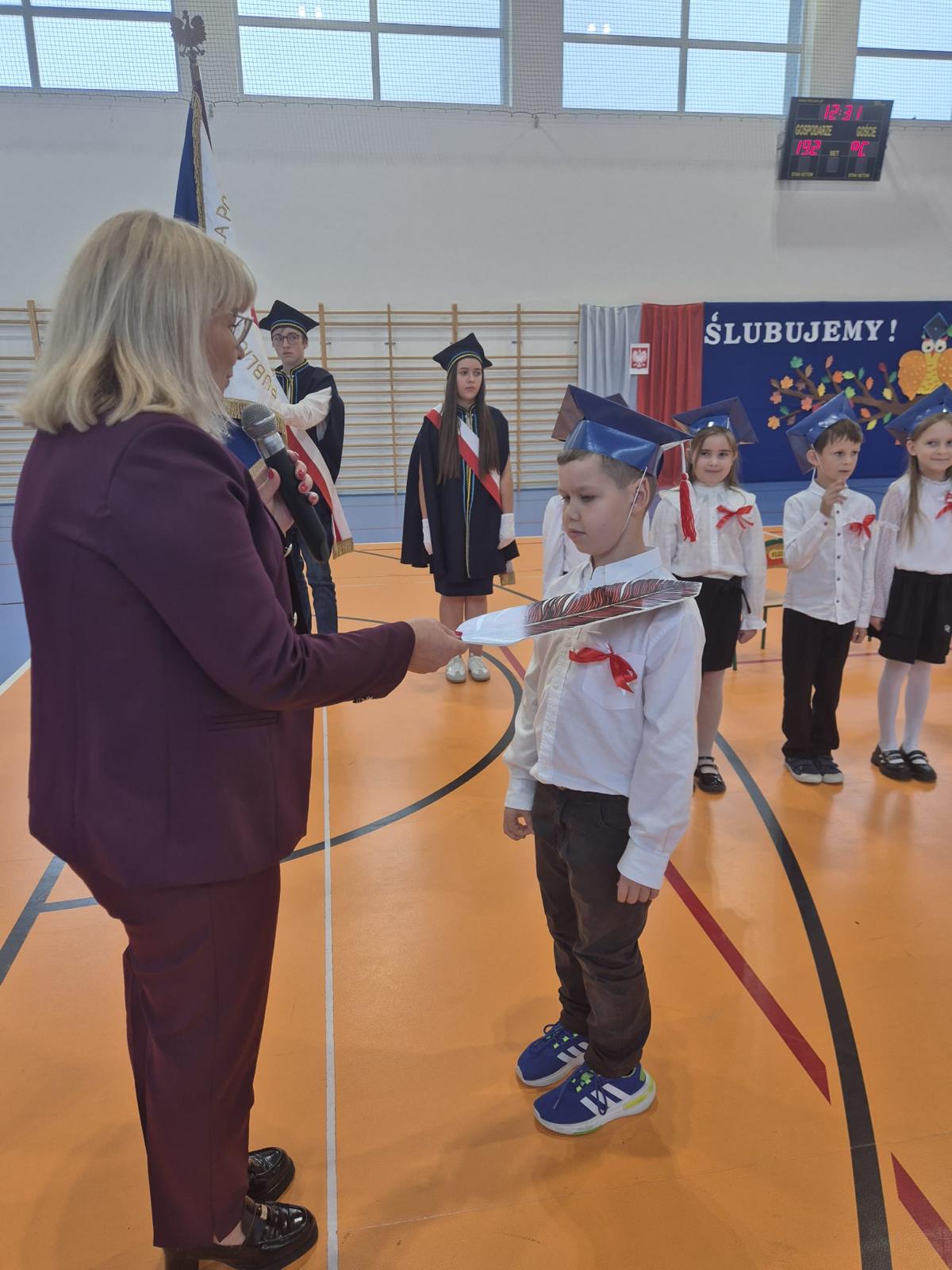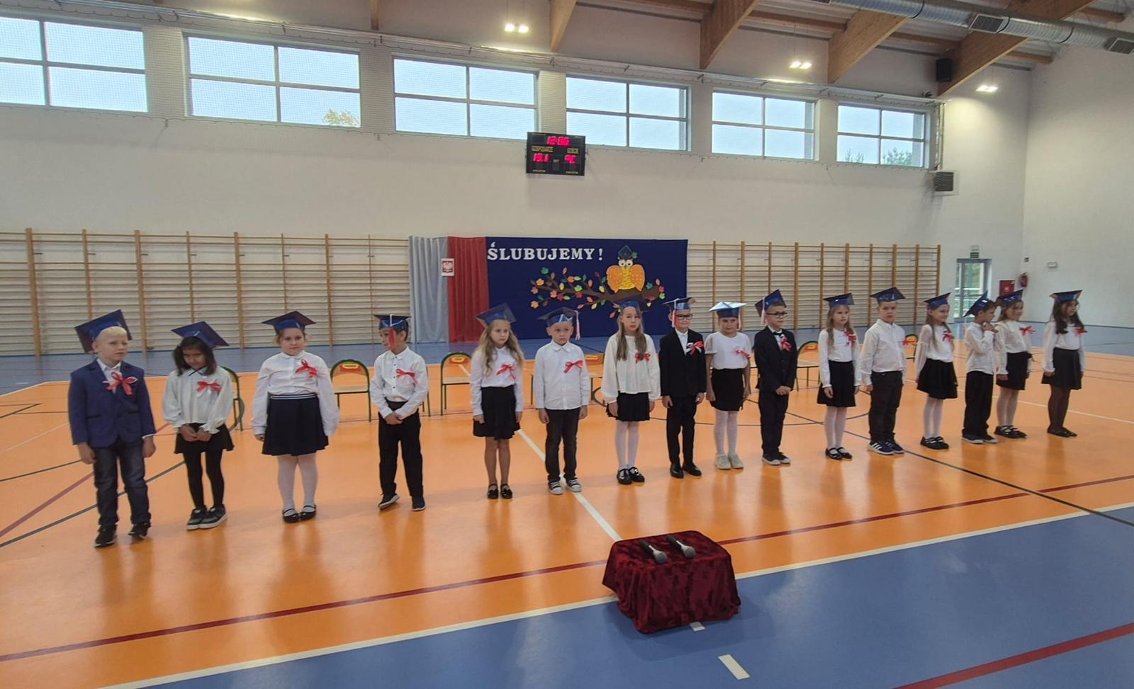 Najważniejszym momentem uroczystości było złożenie ślubowania na sztandar szkoły. Pierwszoklasiści przyrzekali być pilnymi uczniami, dobrymi kolegami i godnie reprezentować swoją szkołę. Po ślubowaniu odbyło się symboliczne pasowanie na ucznia, którego dokonała Pani Dyrektor, dotykając ramienia każdego dziecka piórem.