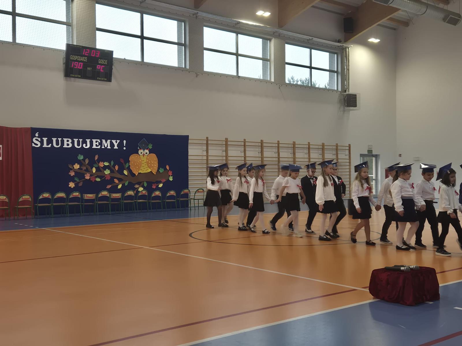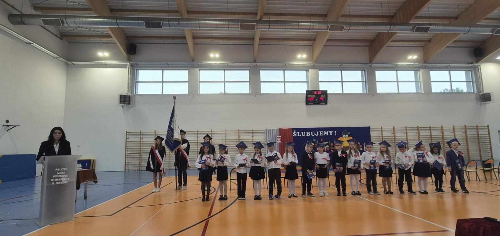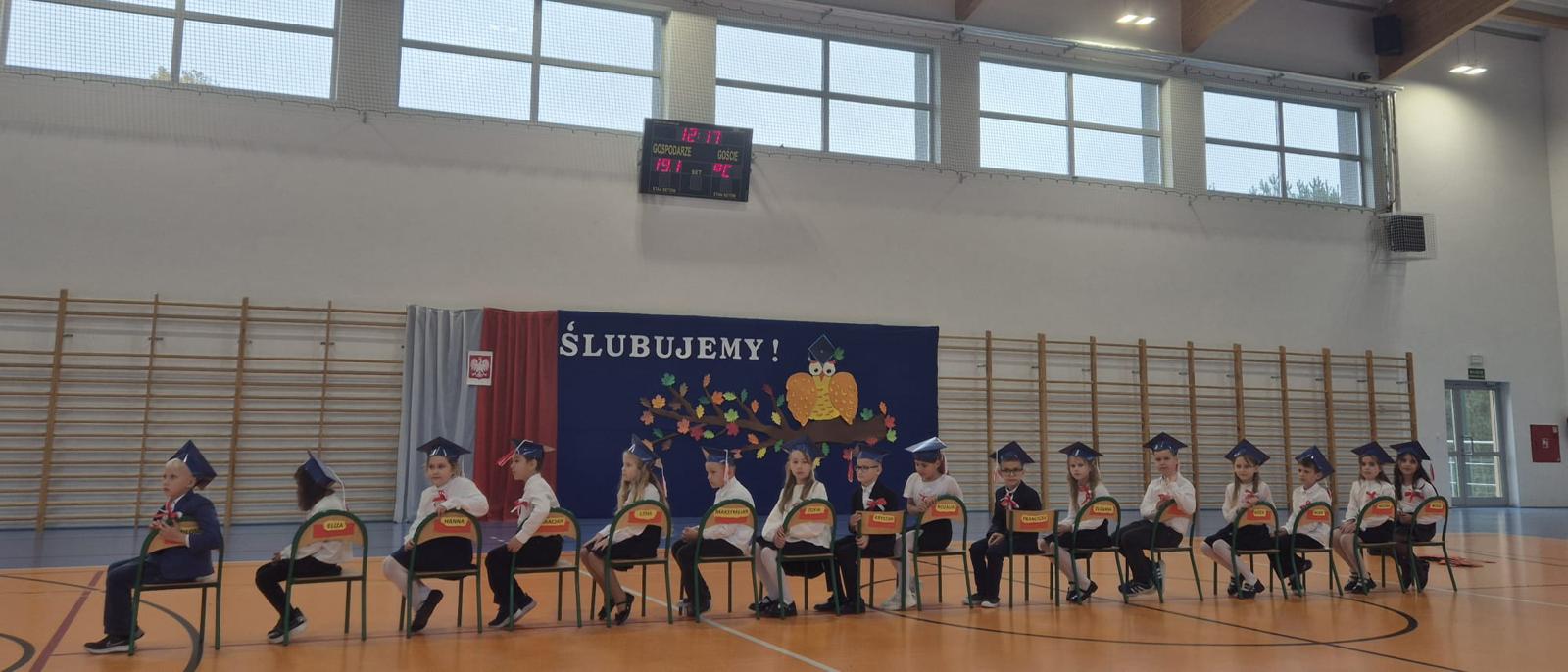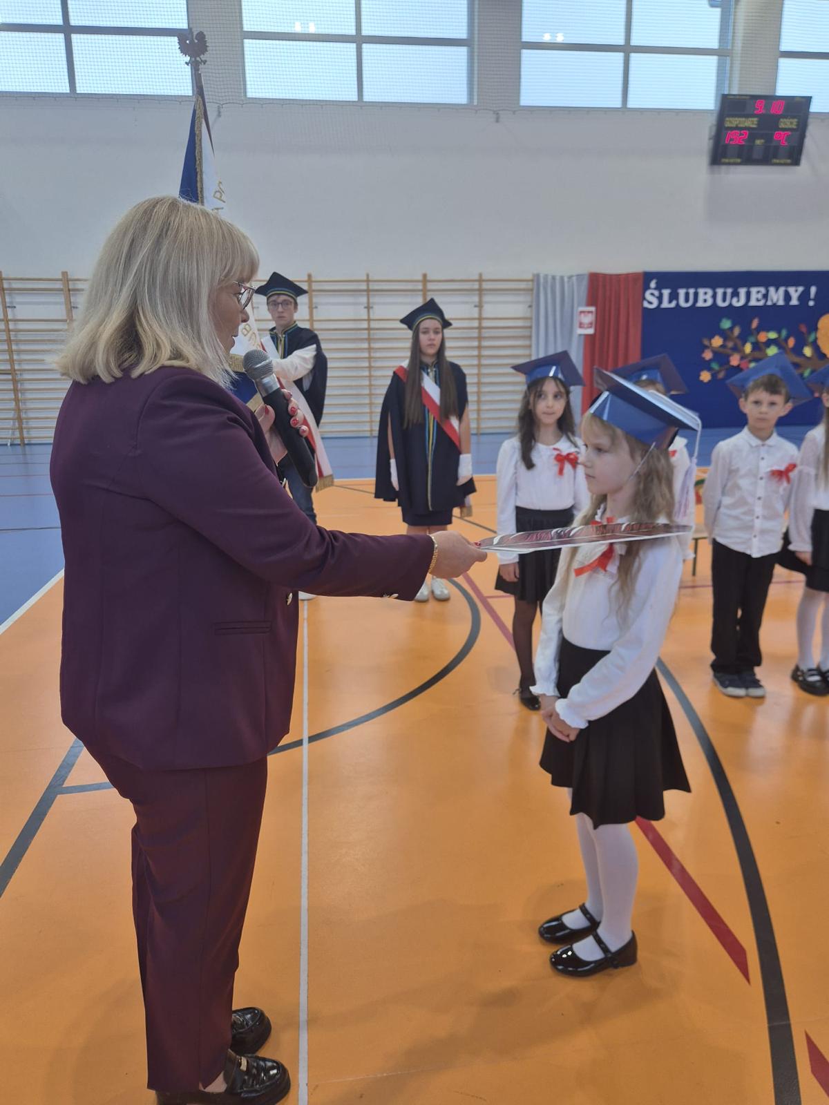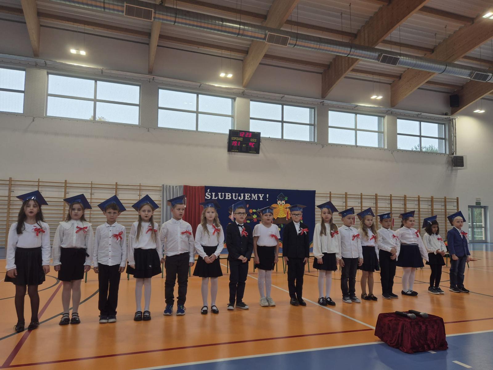 Najważniejszym momentem uroczystości było złożenie ślubowania na sztandar szkoły. Pierwszoklasiści przyrzekali być pilnymi uczniami, dobrymi kolegami i godnie reprezentować swoją szkołę. Po ślubowaniu odbyło się symboliczne pasowanie na ucznia, którego dokonała Pani Dyrektor, dotykając ramienia każdego dziecka piórem.