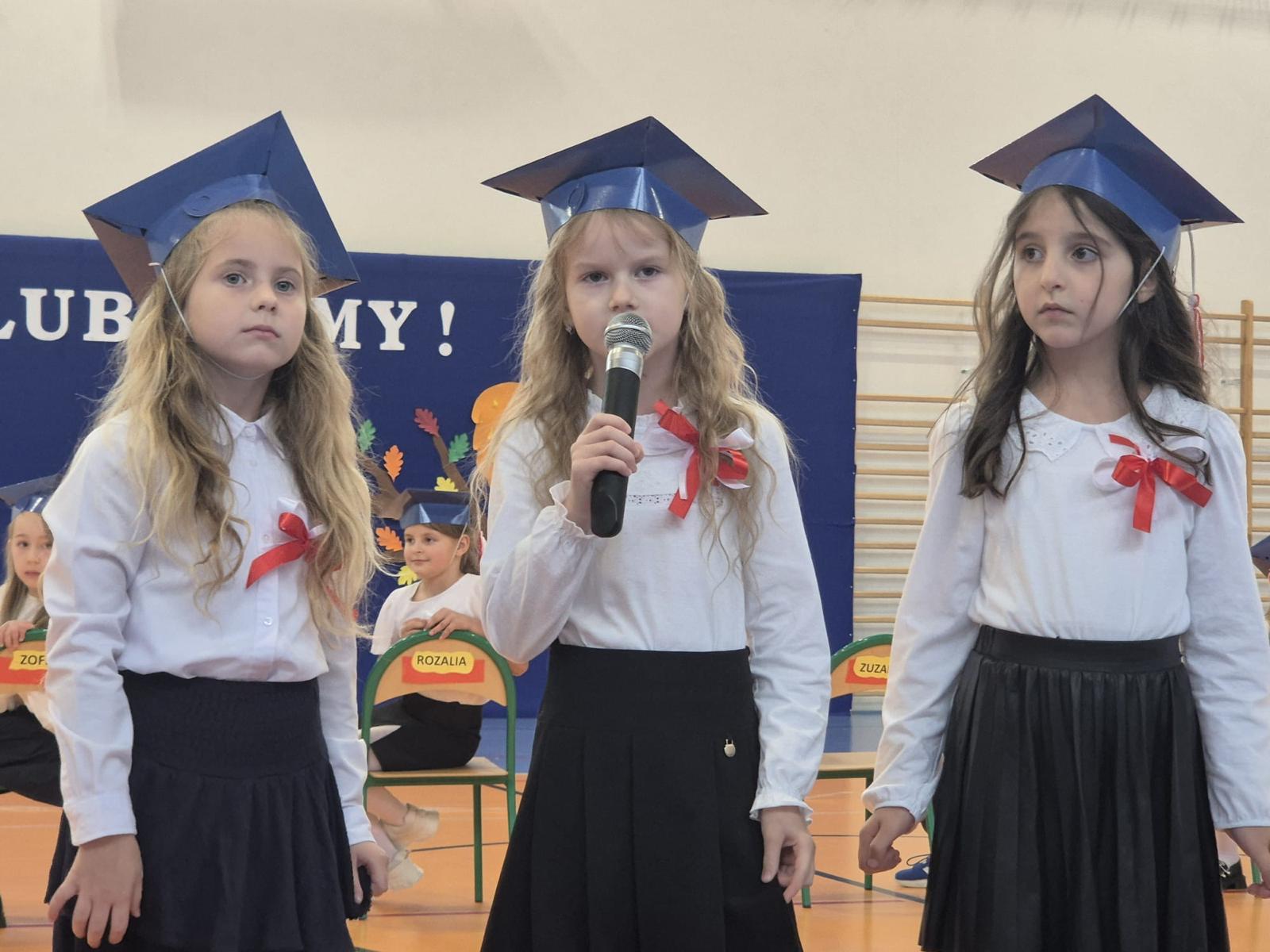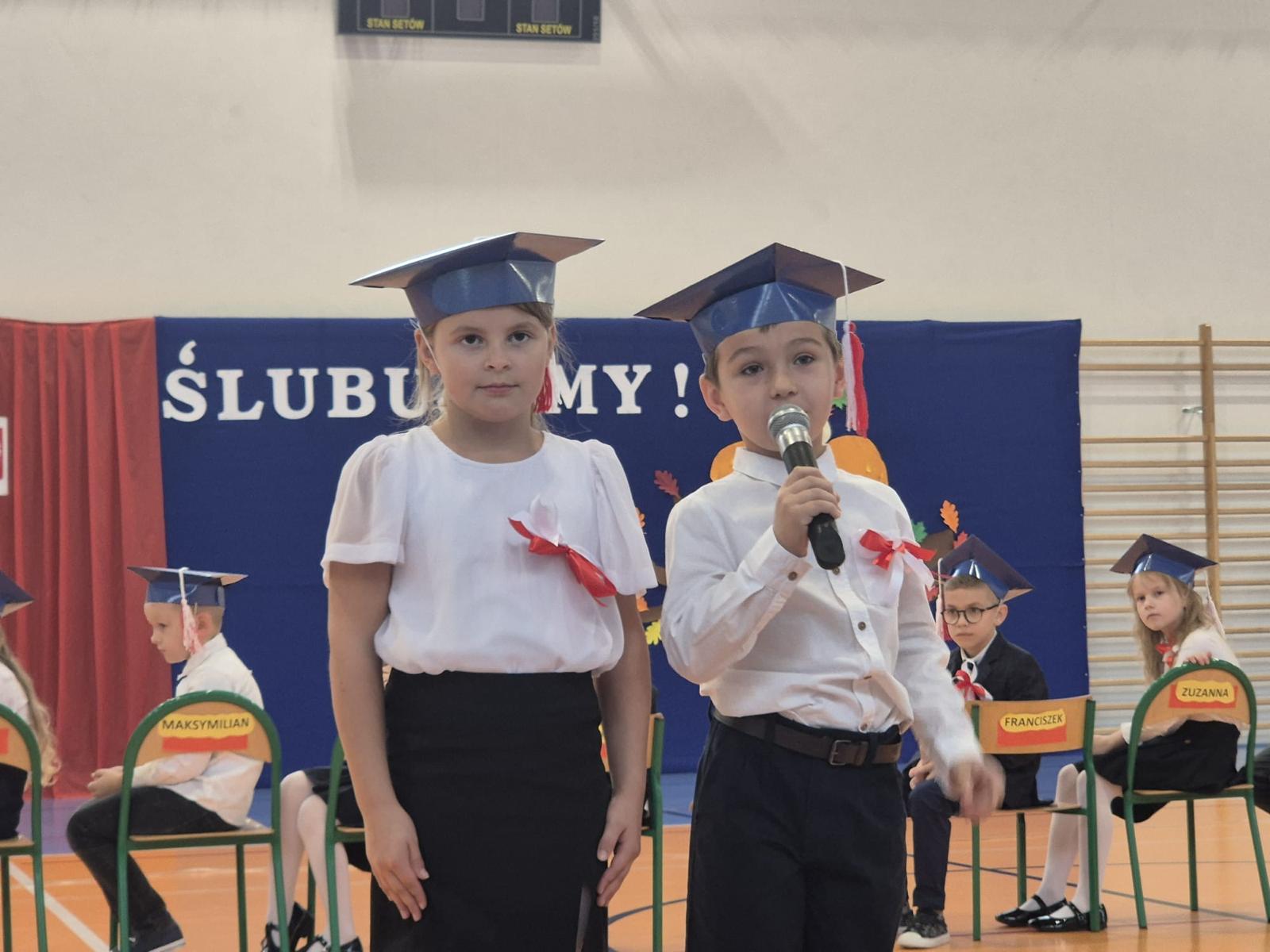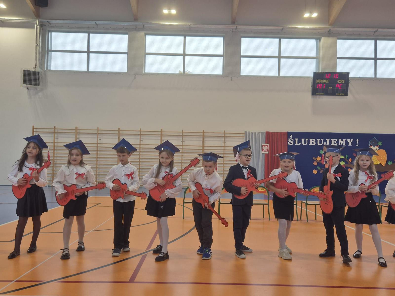 Uroczystość rozpoczęła się częścią artystyczną, podczas której dzieci z wielkim zaangażowaniem zaprezentowały swoje umiejętności. Na początek zabrzmiał „Marsz Radeckiego”, wprowadzając wszystkich w podniosły i radosny nastrój. Następnie pierwszoklasiści wyruszyli w symboliczną podróż po różnych edukacjach, pokazując, jak wiele już potrafią i jak dużo ciekawych rzeczy czeka ich w szkolnej przygodzie.