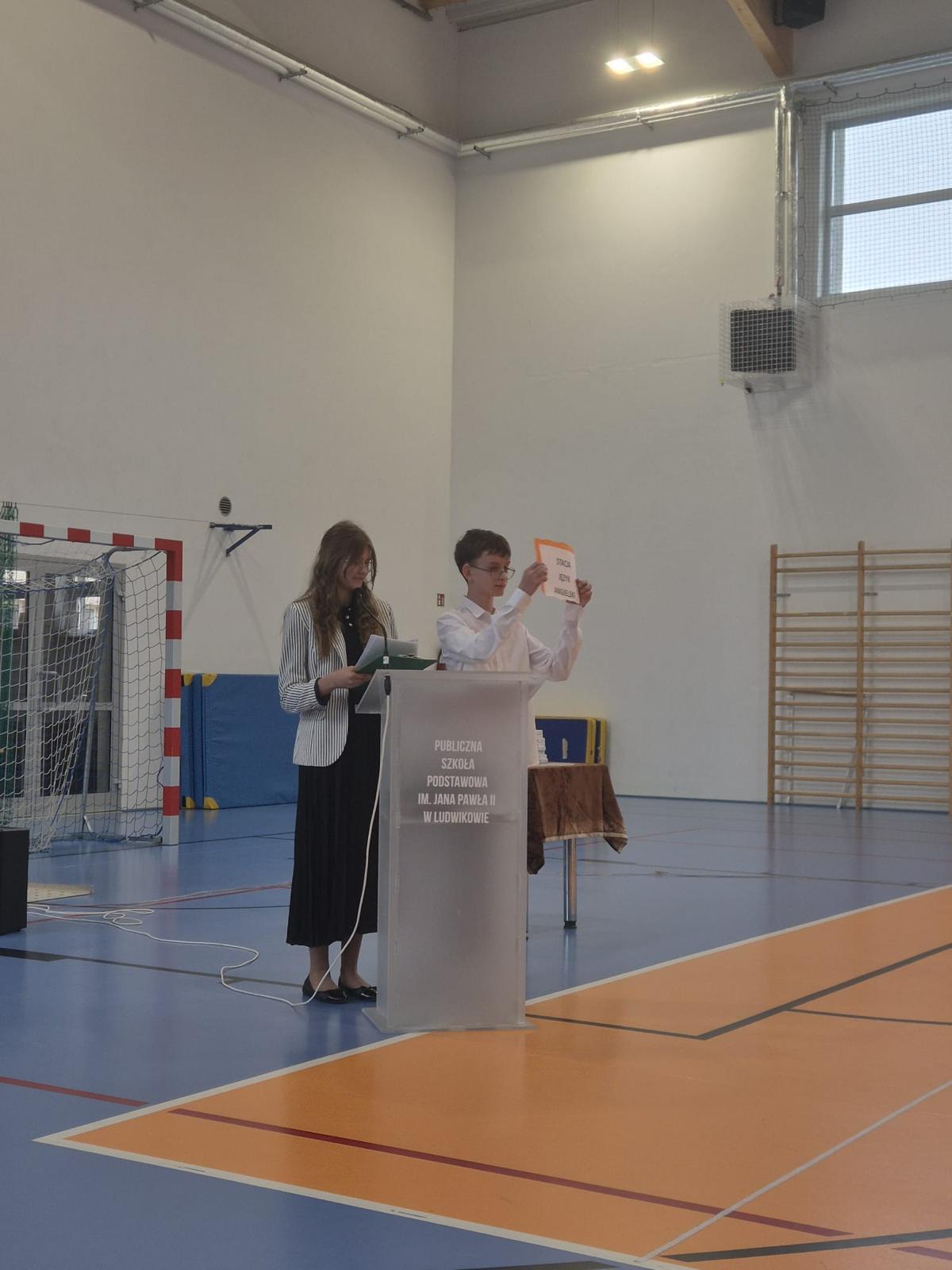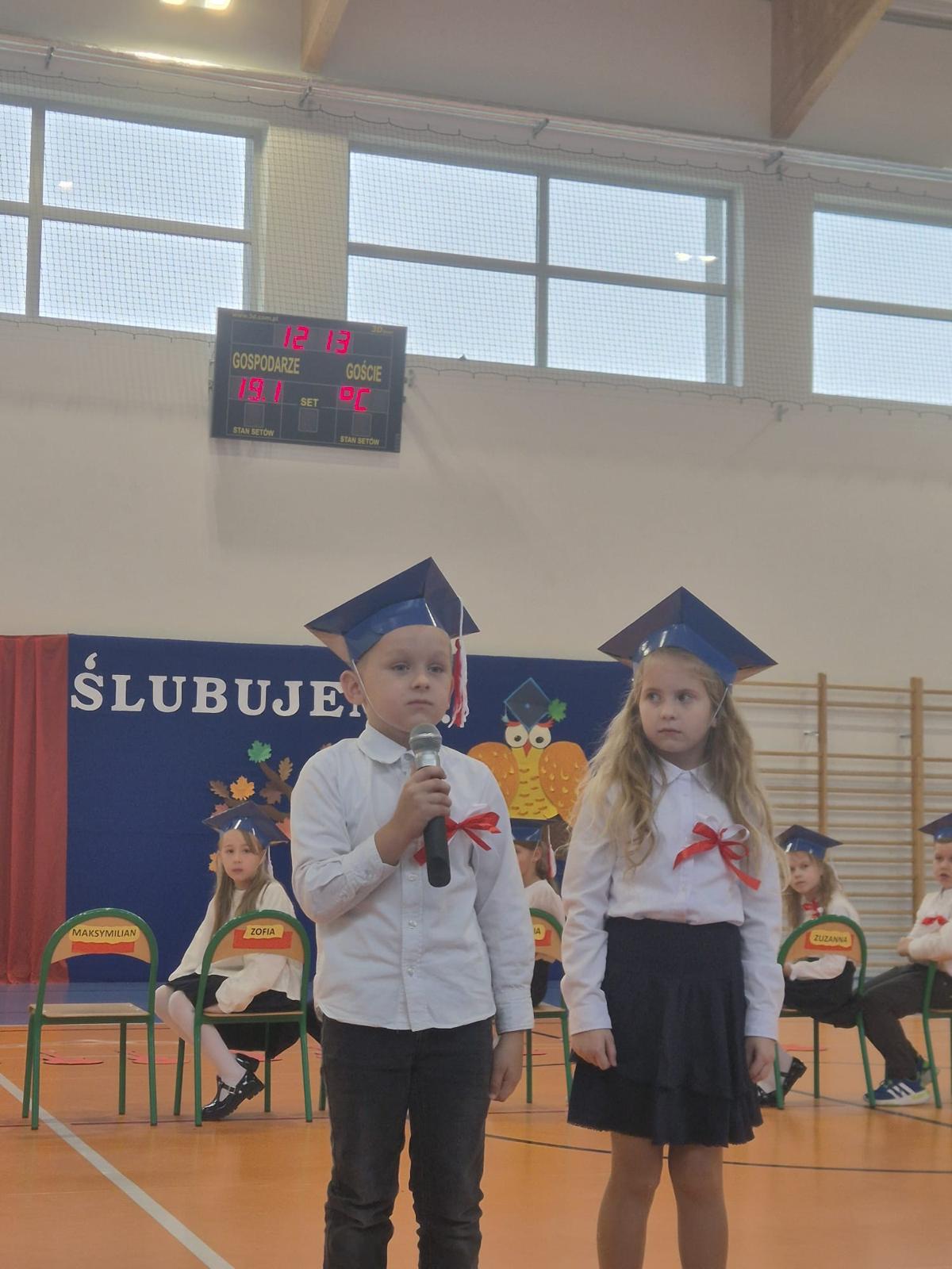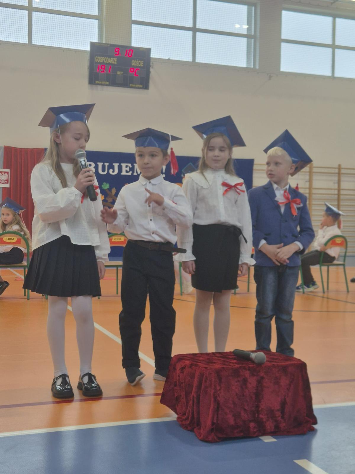 Uroczystość rozpoczęła się częścią artystyczną, podczas której dzieci z wielkim zaangażowaniem zaprezentowały swoje umiejętności. Na początek zabrzmiał „Marsz Radeckiego”, wprowadzając wszystkich w podniosły i radosny nastrój. Następnie pierwszoklasiści wyruszyli w symboliczną podróż po różnych edukacjach, pokazując, jak wiele już potrafią i jak dużo ciekawych rzeczy czeka ich w szkolnej przygodzie.